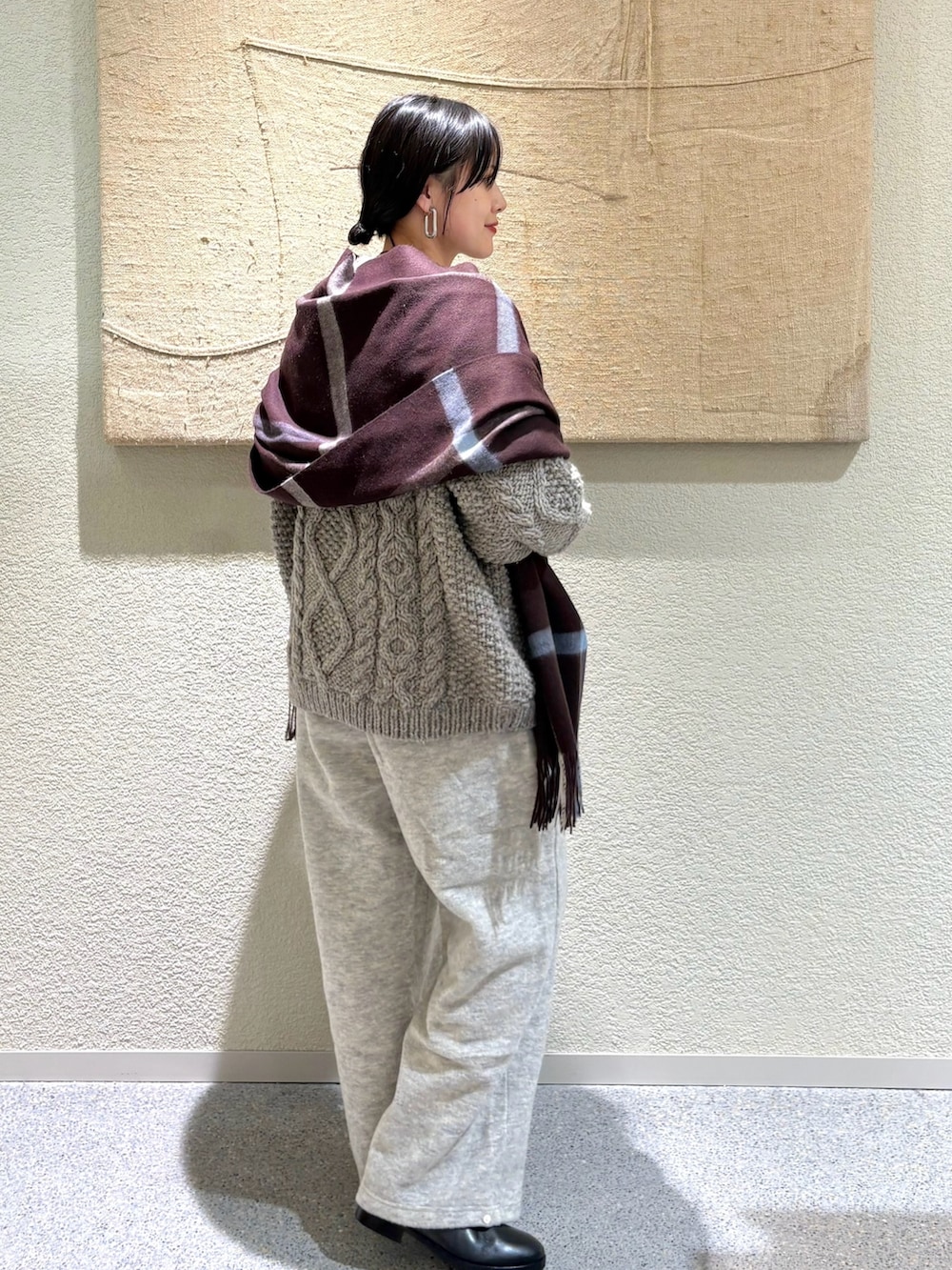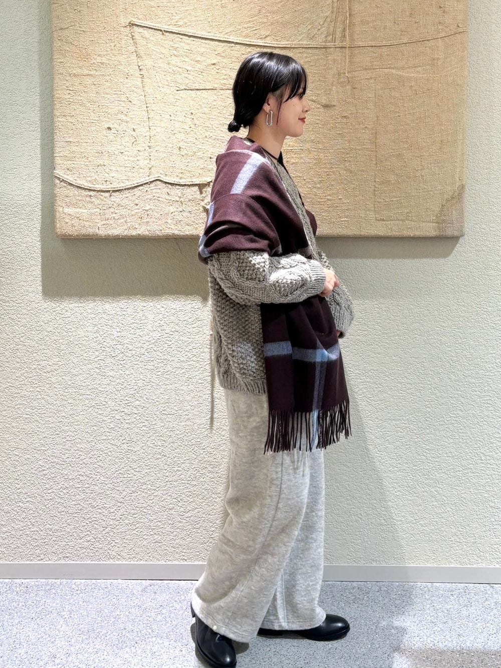 深いチョコレートカラーが全体のトーンを引き締め、上品な暖かみをプラス。肩にふわりと掛けるだけで、シンプルなコーディネートにこなれ感を演出します。
