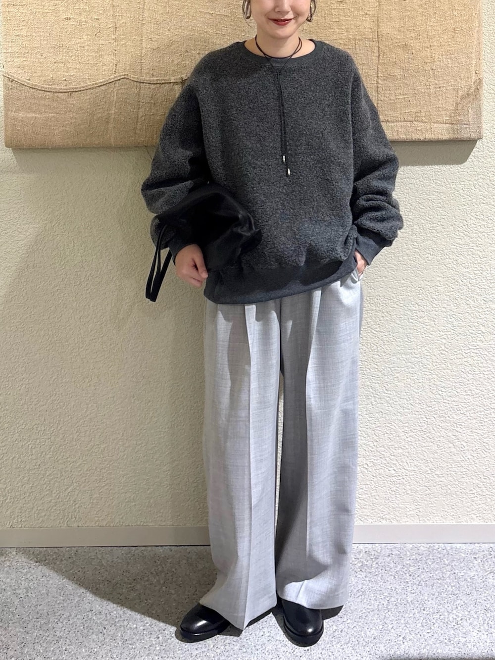 柔らかなボア素材が季節感を引き立てるプルオーバー。ほどよくゆとりのあるシルエットで抜け感を演出しつつ、軽くて暖かい着心地です。落ち着いたチャコールカラーが大人のカジュアルスタイルを上品にまとめます。