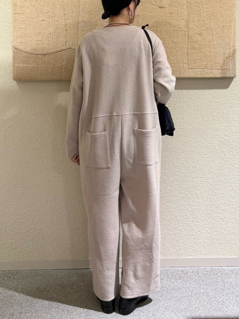 ふんわりと軽いブークレー素材がやさしい表情のオールインワン。