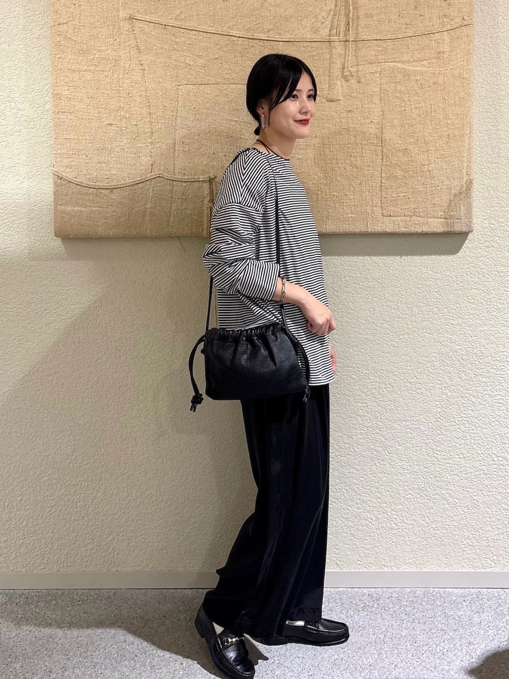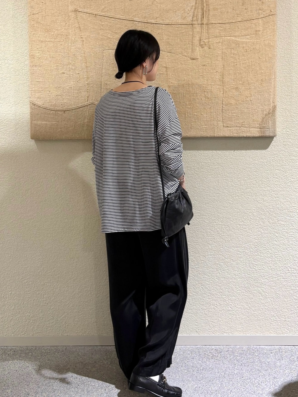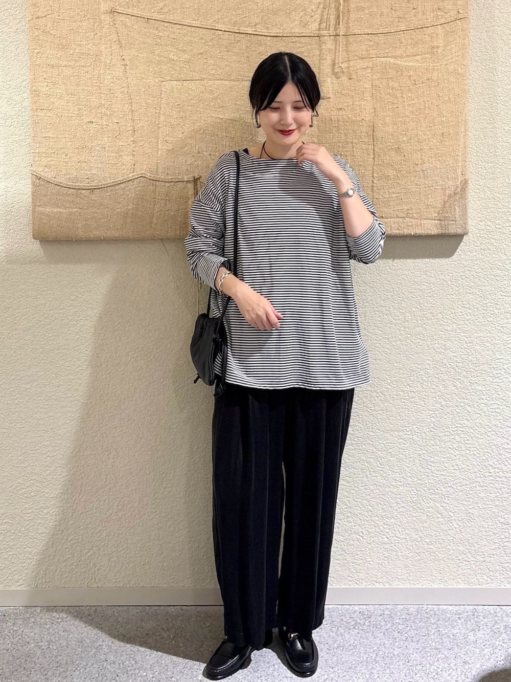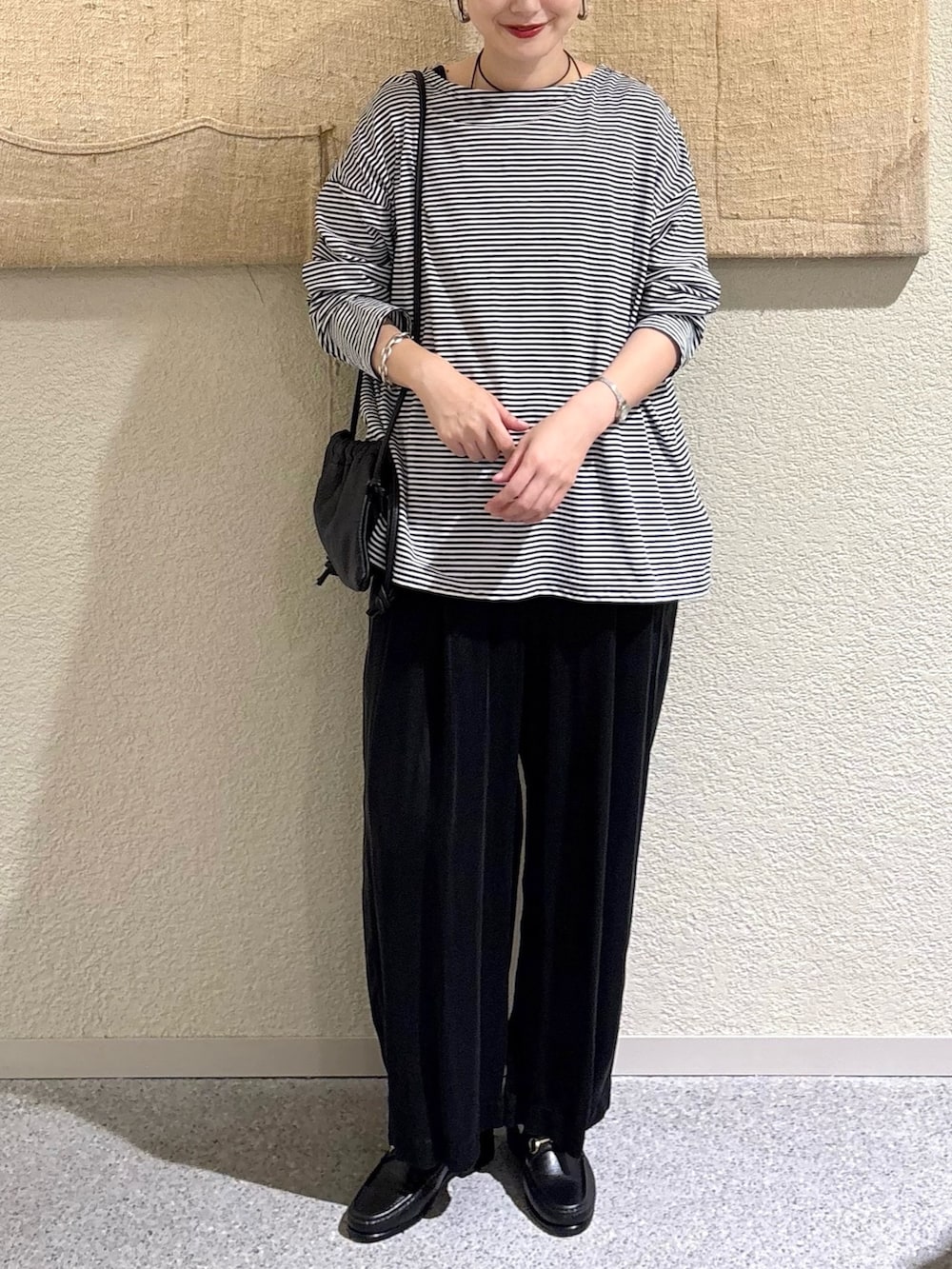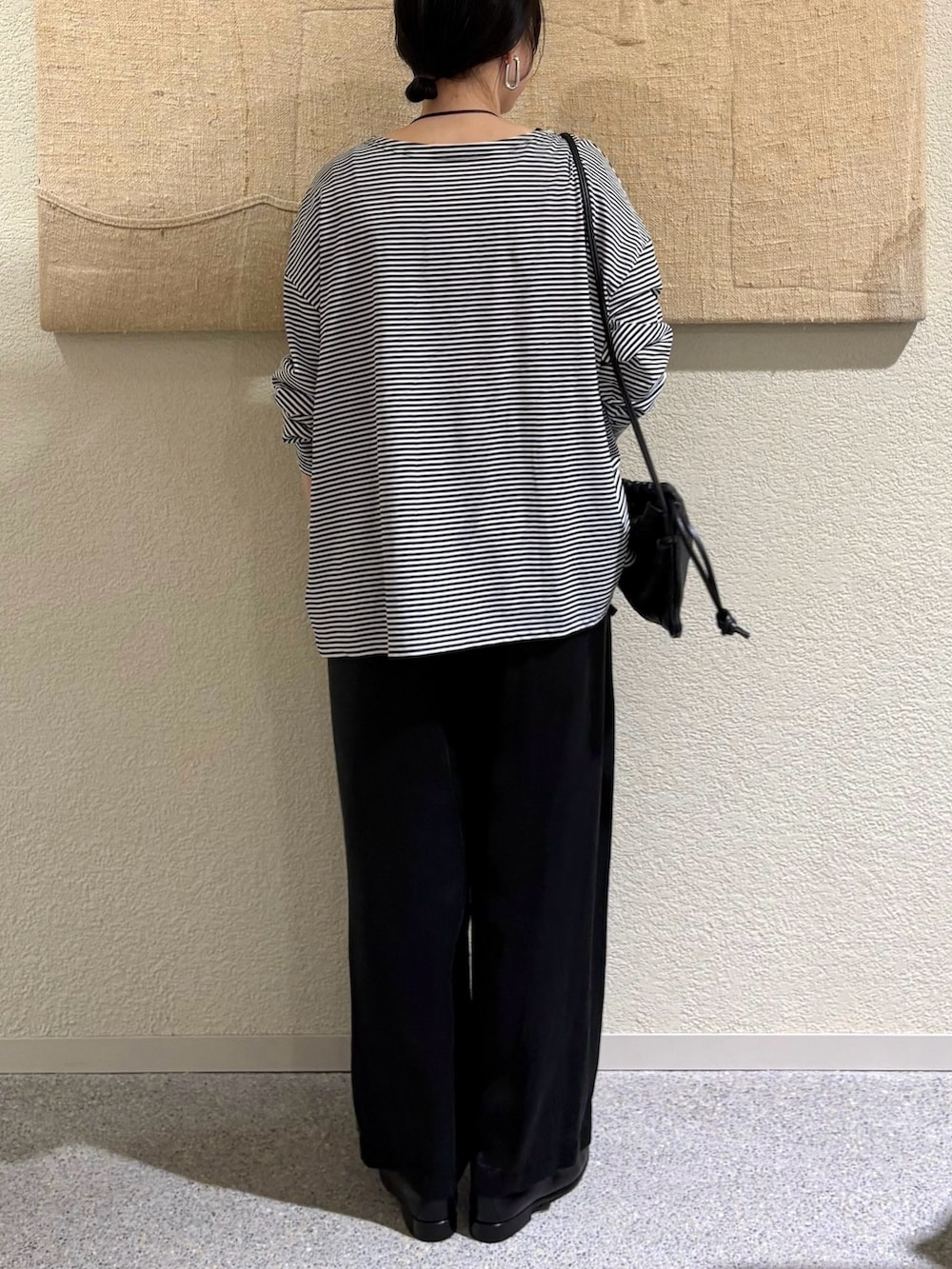 ほどよい厚みとハリ感があり、1枚でもサマになるボーダーカットソー。上品な黒ベースの配色で、カジュアルすぎず大人の雰囲気に仕上がります。自然に落ちるシルエットで、リラックス感のある着心地も魅力です。
