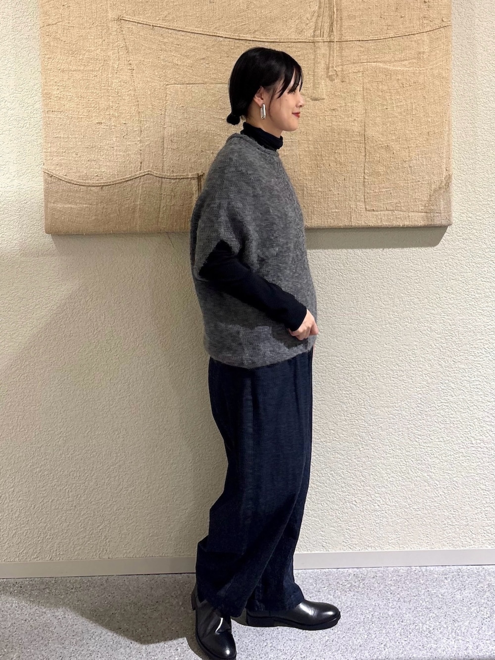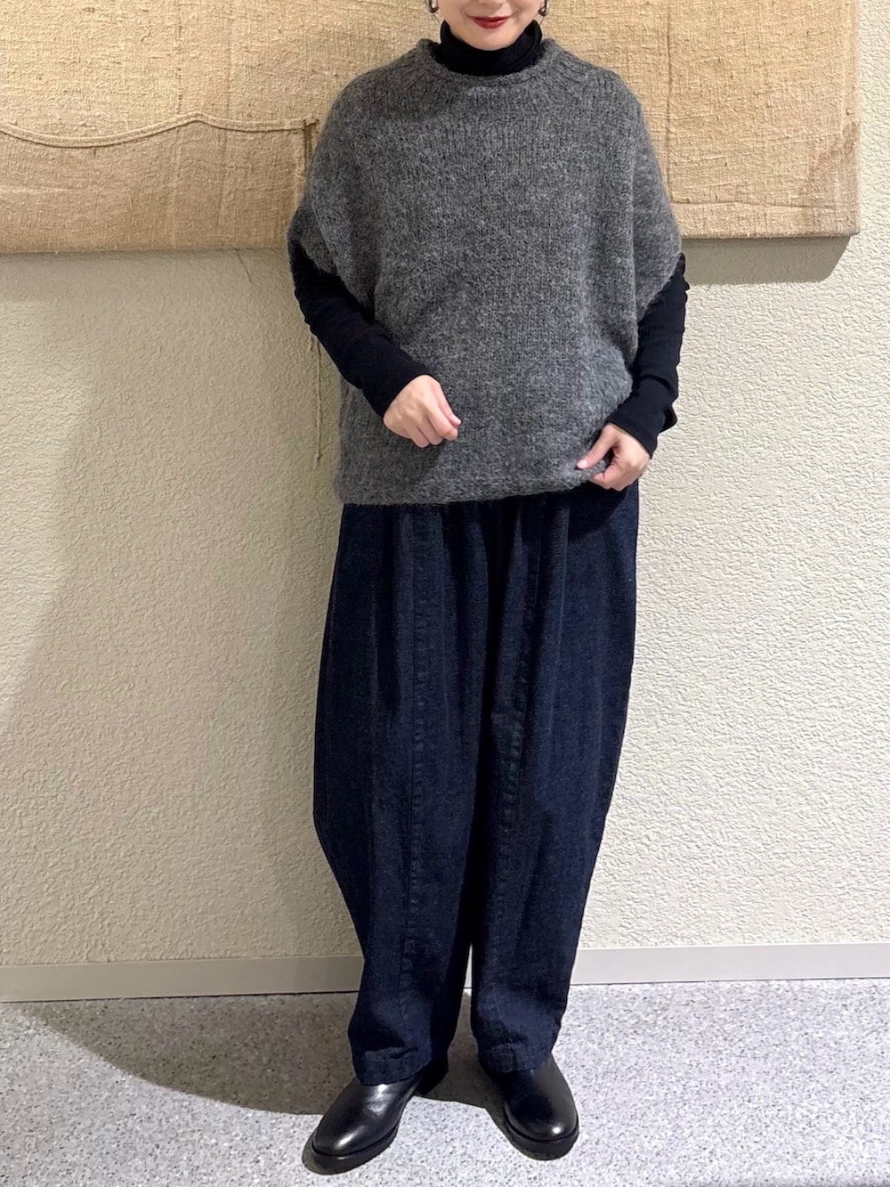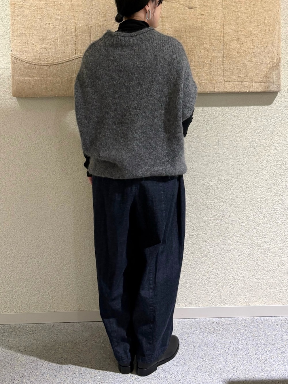ふんわりと軽やかなアルパカ混素材が魅力のニットベスト。ゆったりシルエットで抜け感を演出し、柔らかいトーンのダークグレーが落ち着いた印象をプラス。