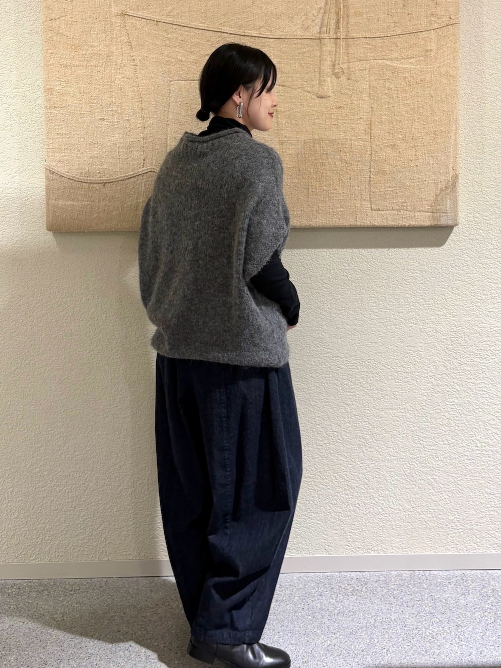 丸みのあるシルエットが個性的なボリュームパンツ。深みのあるインディゴカラーがコーディネート全体を引き締め、モードなニュアンスに。