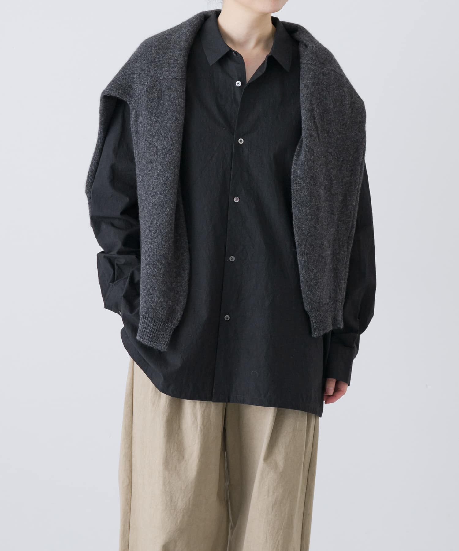ほどよくハリのあるコットン素材で、立体感のあるシルエットが魅力のレギュラーカラーシャツ。ゆとりのあるボックス型で抜け感が生まれ、モノトーンコーデにも表情をプラスします。