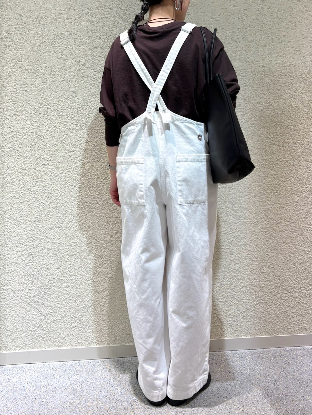 バッククロスのデザインがポイントのサロペット。女性らしい抜け感があり、シンプルなトップス合わせでもスタイルが完成します。明るいオフカラーが軽やかな雰囲気をプラス。
