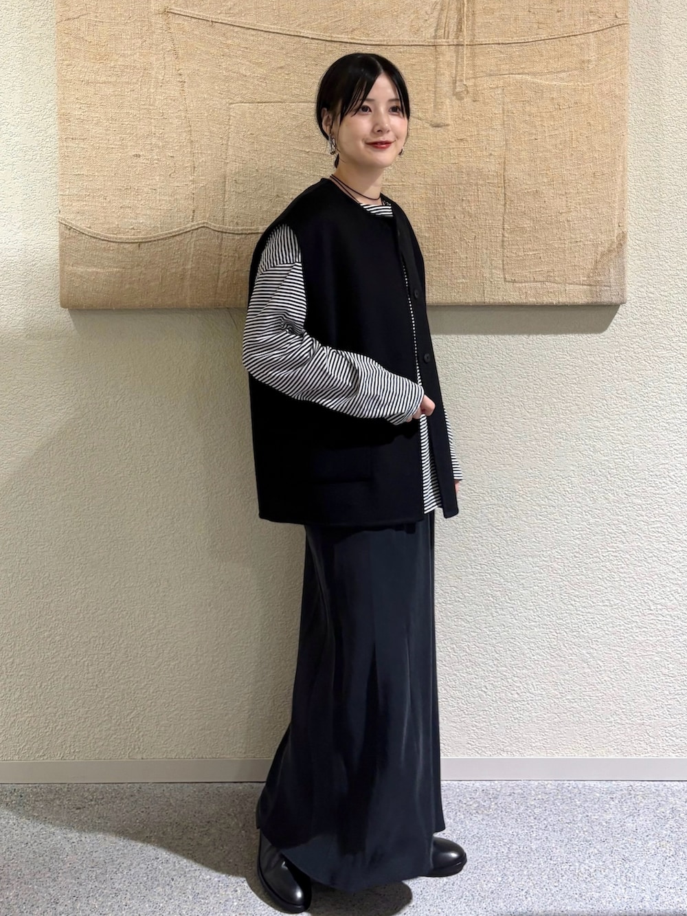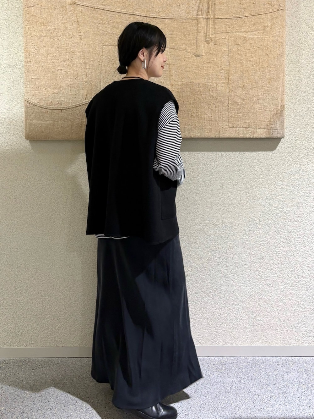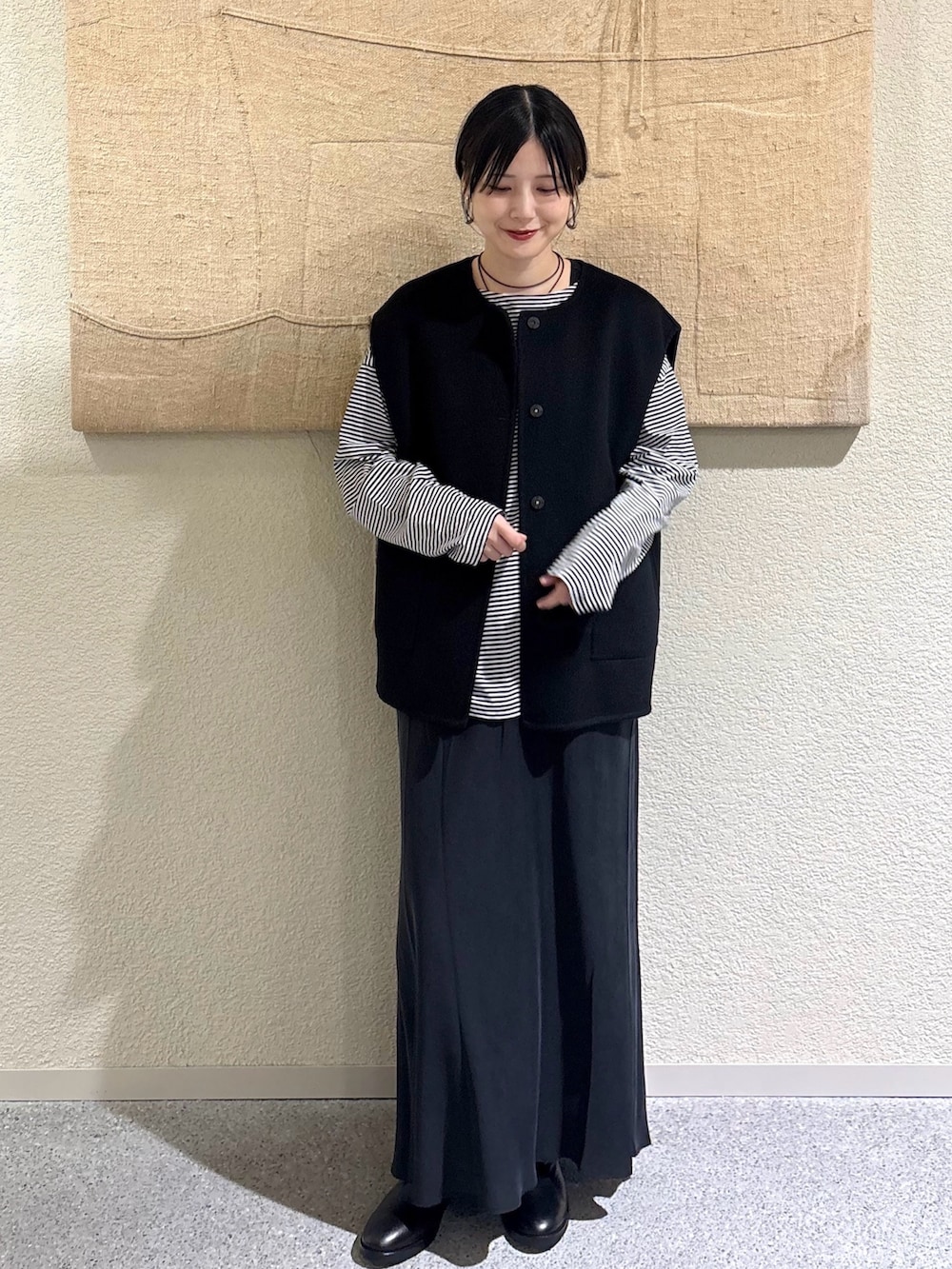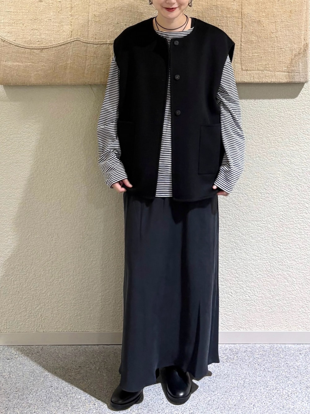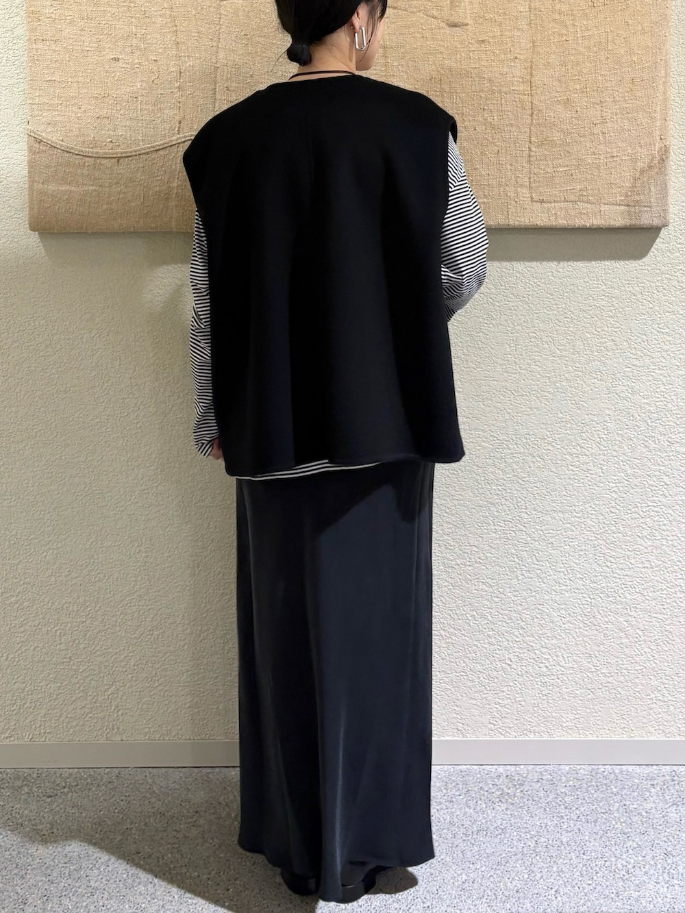 軽く柔らかいリバー素材のベスト。縦ラインを強調するシルエットでスタイルアップ効果も。カットソーに重ねるだけで奥行きのある装いに。