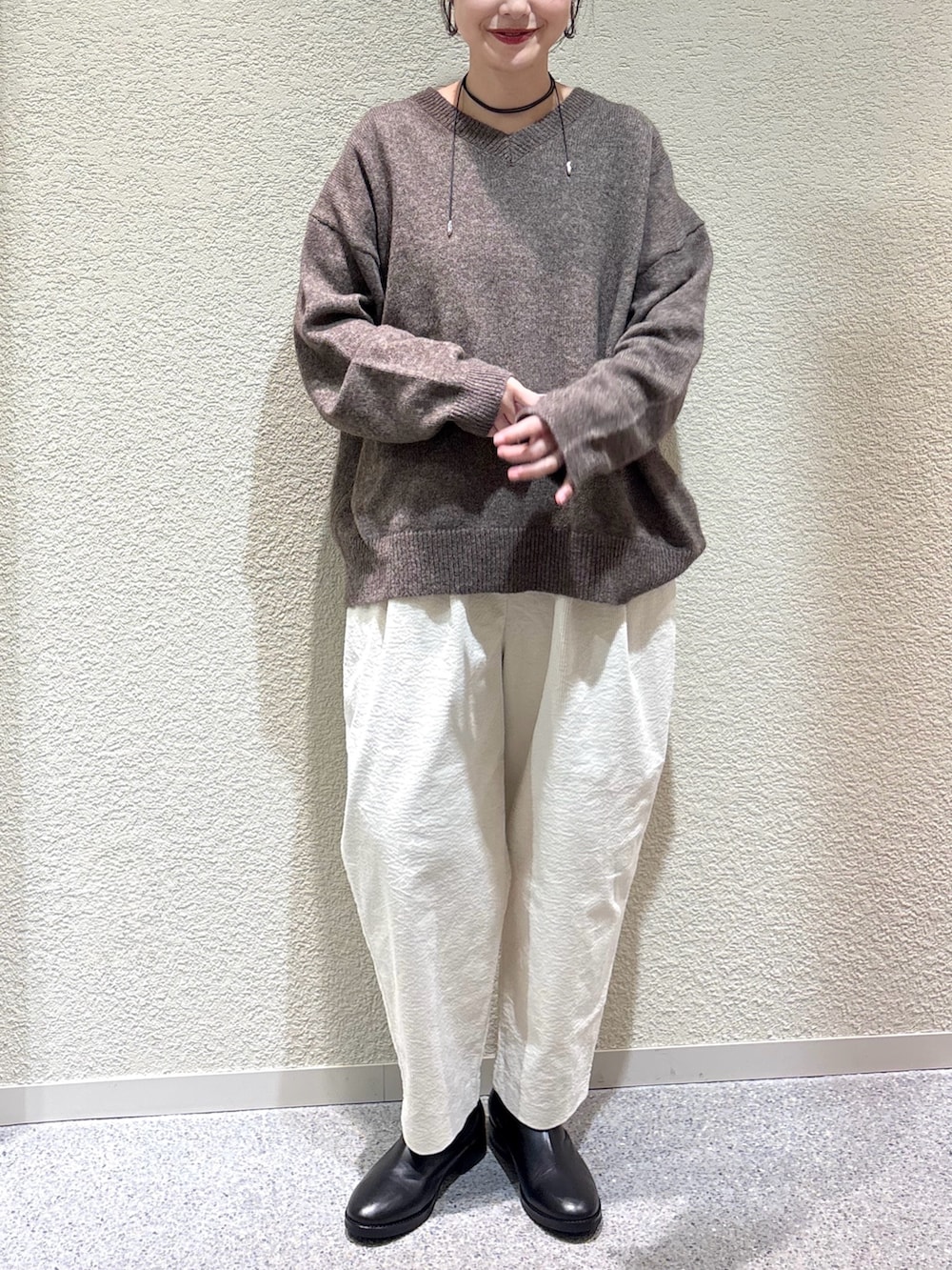 アイボリーの軽さがトップスの深みある色と好相性で、女性らしいやわらかな印象に。