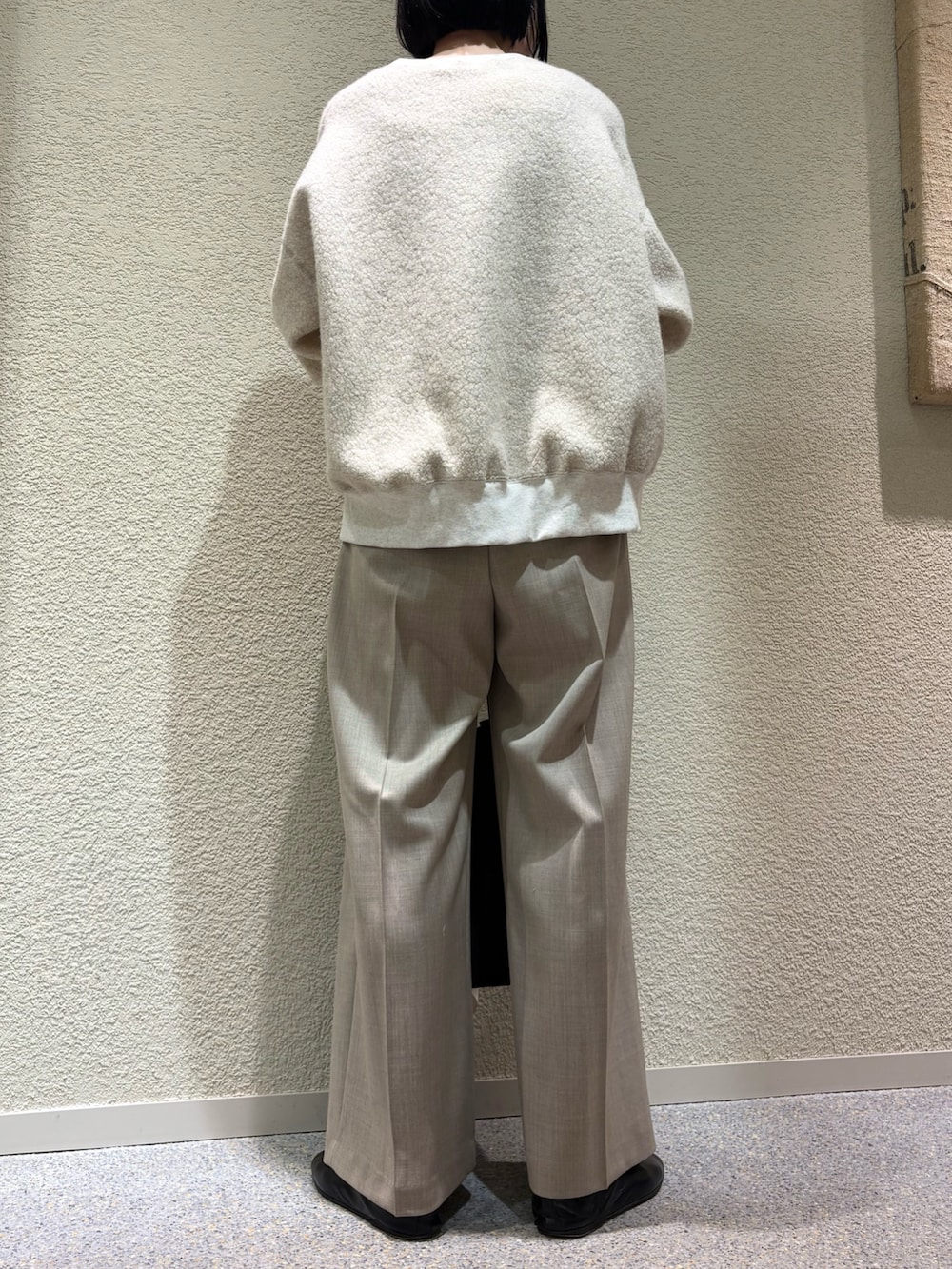 ウール素材ですが表面感はツルッとしており、キレイめ、カジュアルどちらのスタイルにもハマるデザインのパンツです。