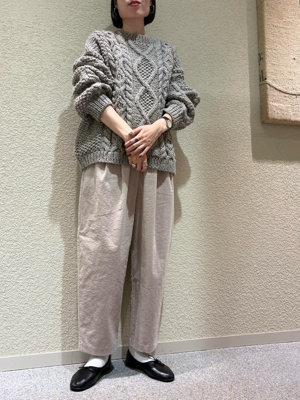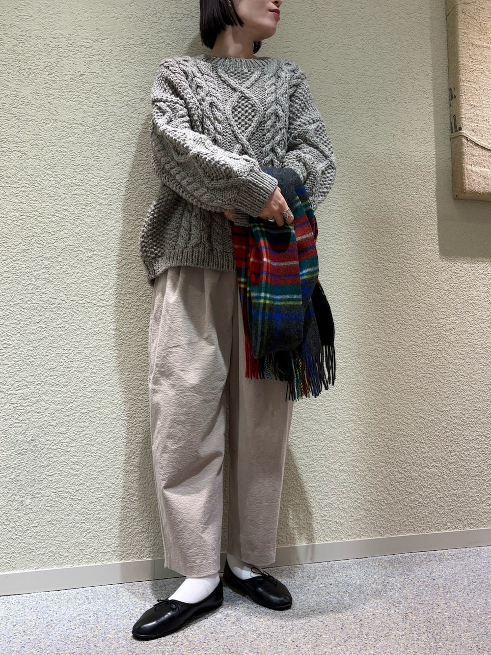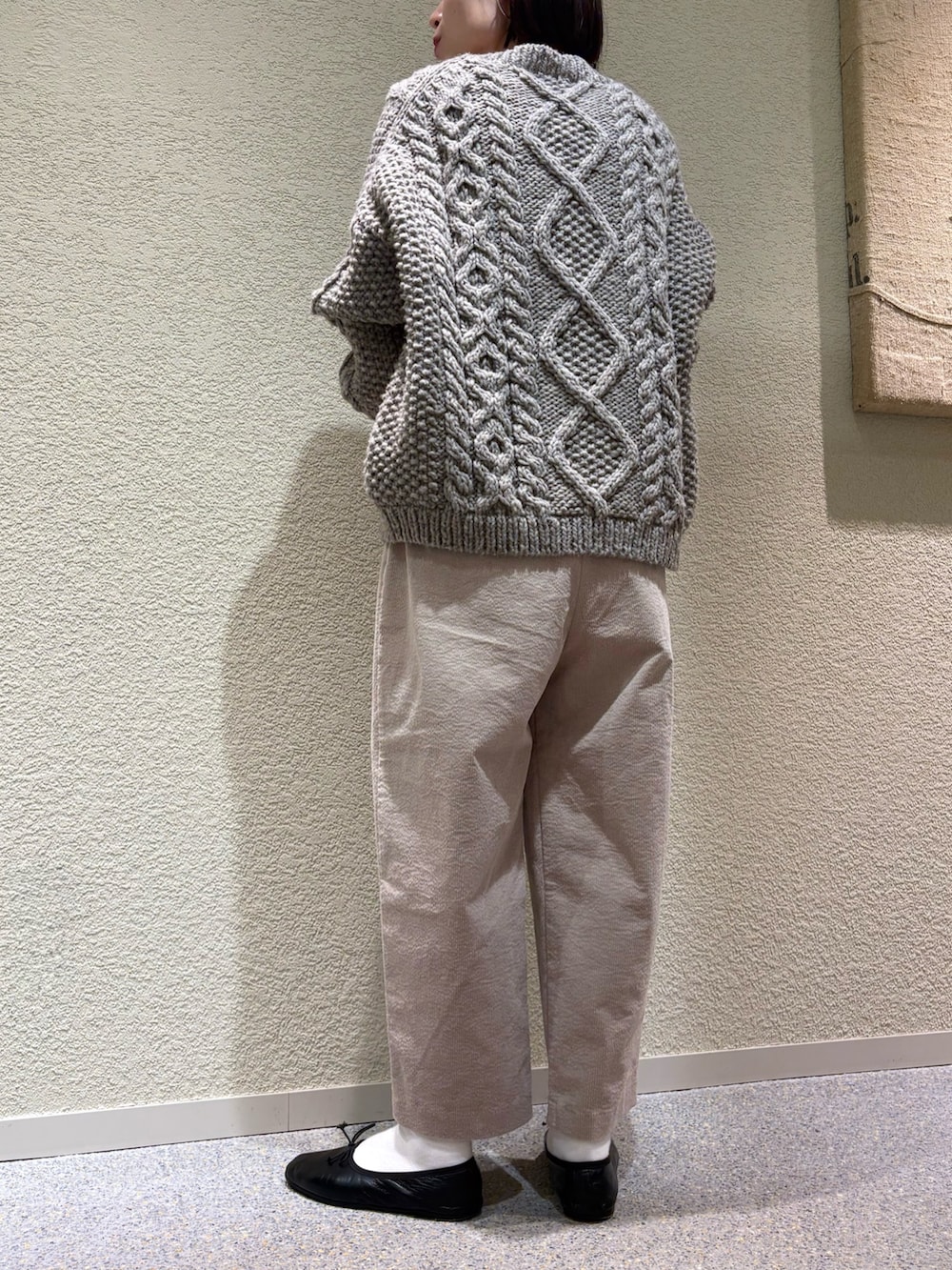 ウール100%で、太めの糸で編み上げられたニットで見た目からも暖かみを感じる1着です。