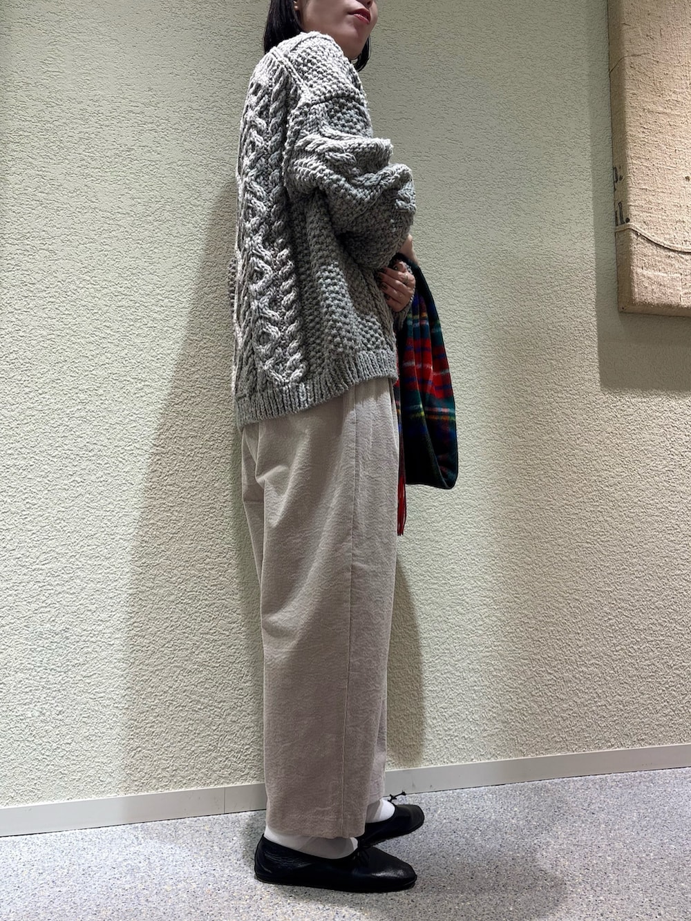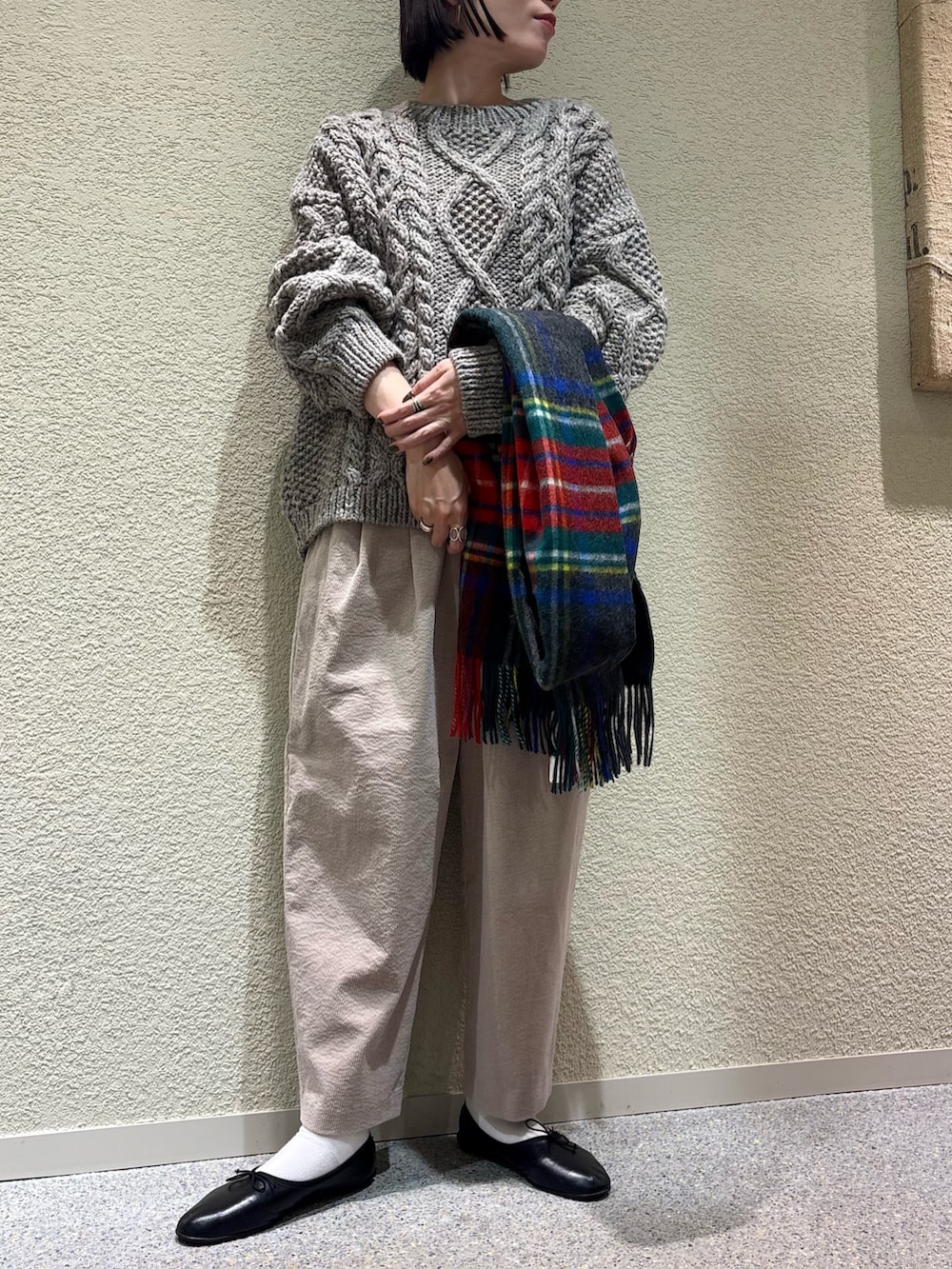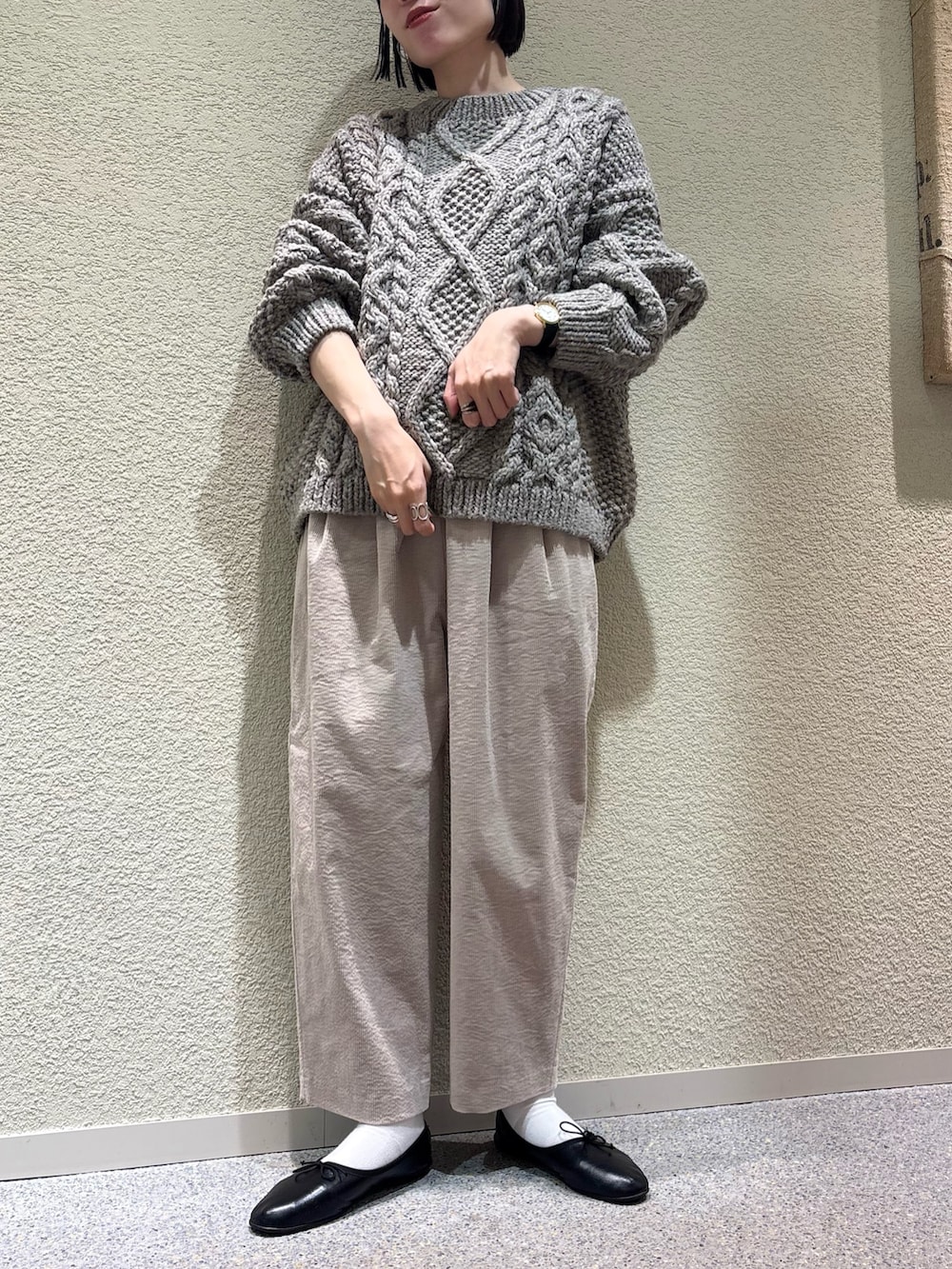 ウール100%で、太めの糸で編み上げられたニットで見た目からも暖かみを感じる1着です。