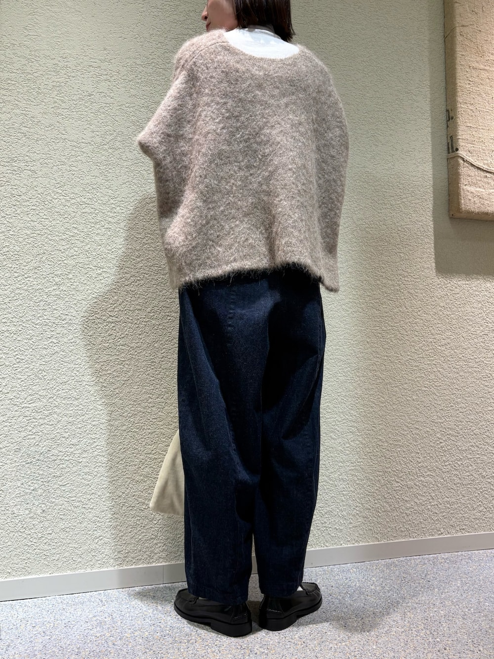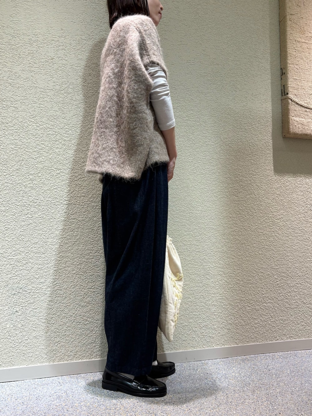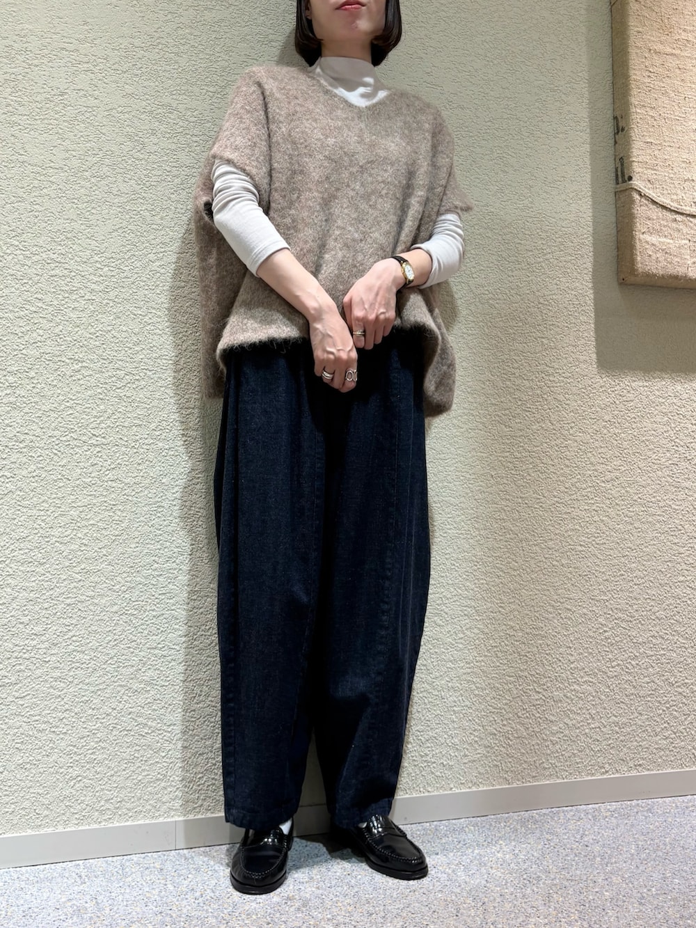 ワイドシルエットですが落ち感があるのでスッキリみえします。アームホームもゆとりがあり、様々なインナーとバランス良くあわせて頂けます。
