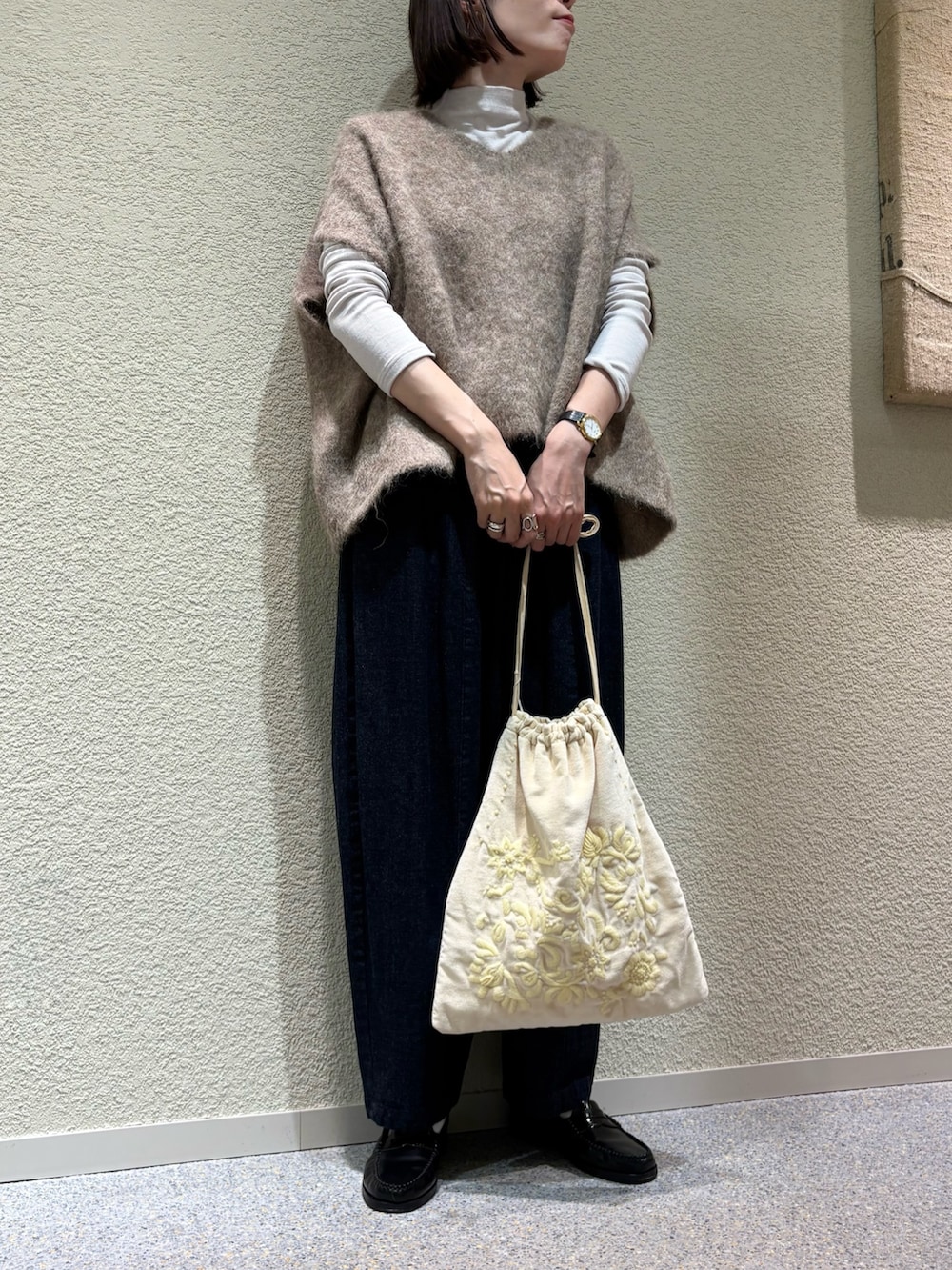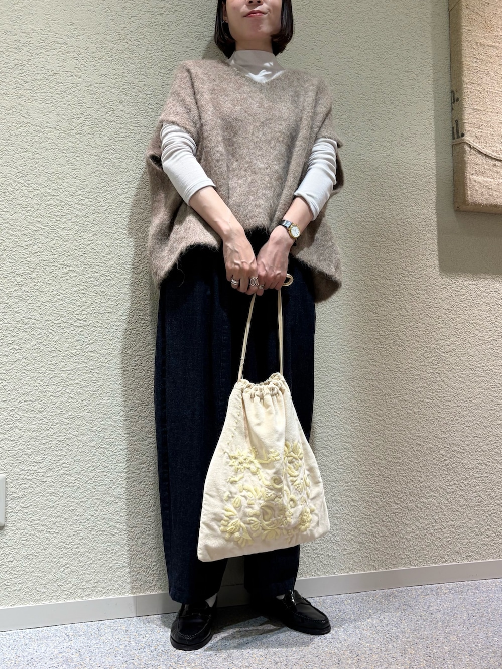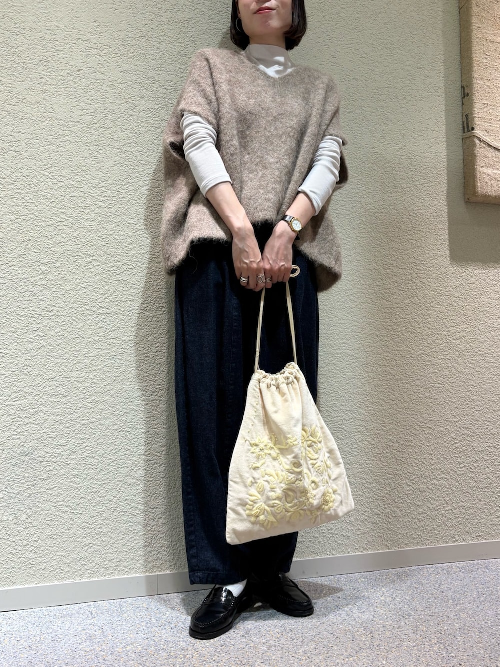 ワイドシルエットですが落ち感があるのでスッキリみえします。アームホームもゆとりがあり、様々なインナーとバランス良くあわせて頂けます。