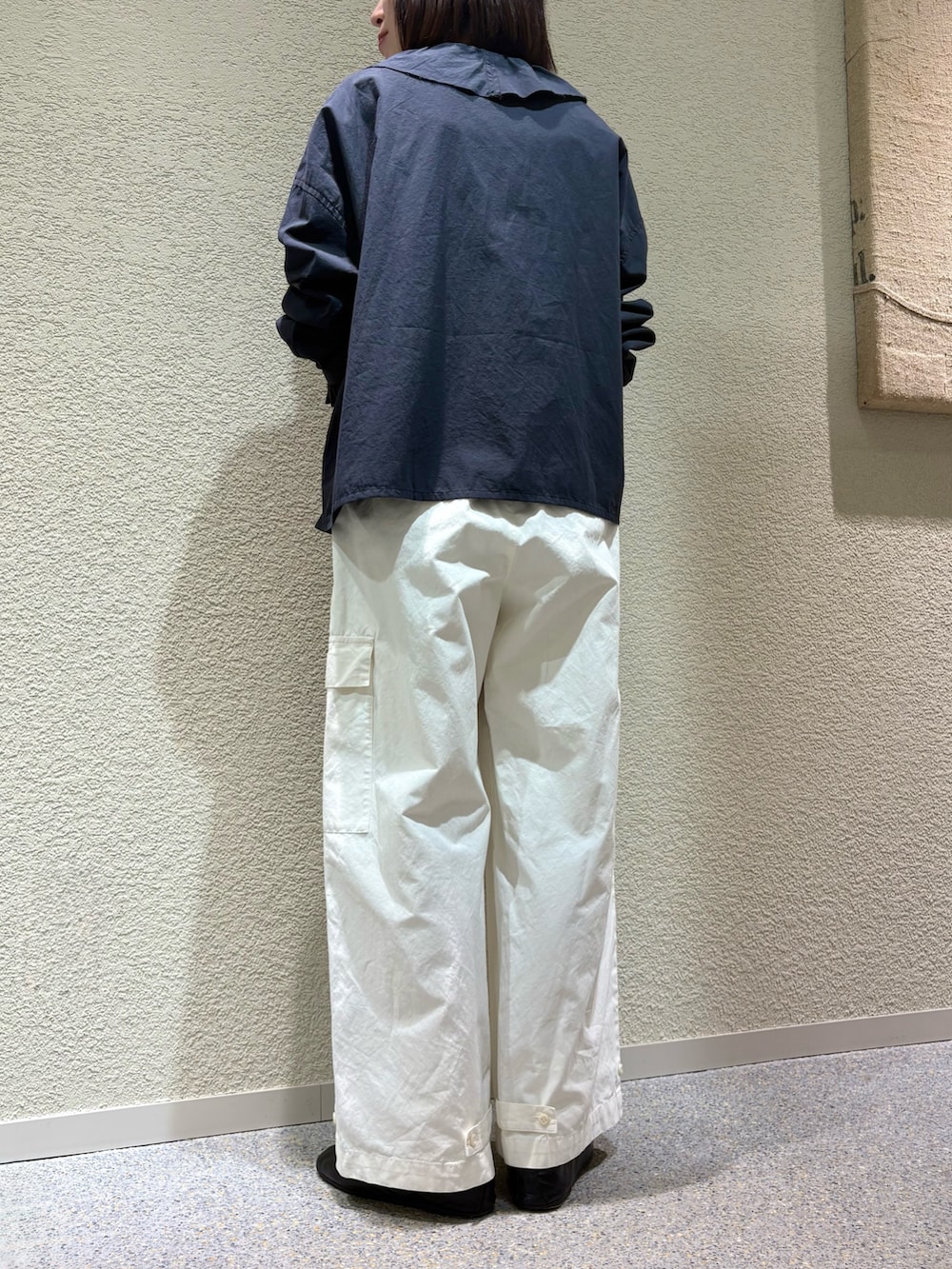裾のボタン位置をかえるとテーパードシルエットに早変わりします。