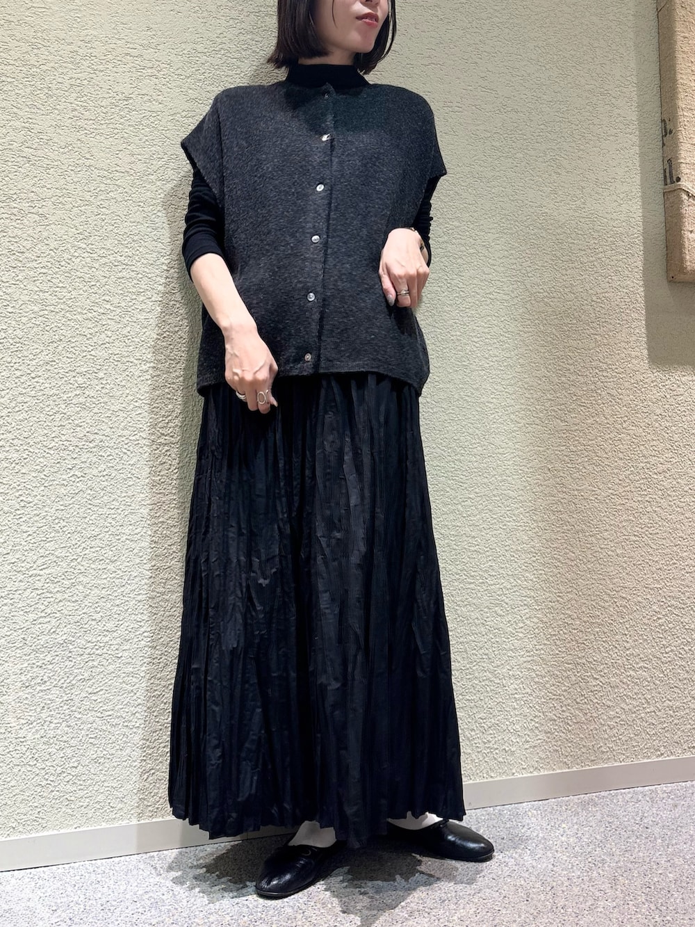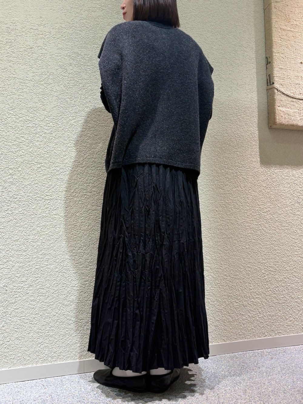 クリンクル加工がされていて凹凸感あるデザインが特徴のスカートで、クシュっとしたシワ感が素敵です◎