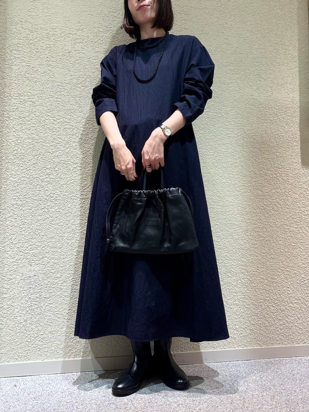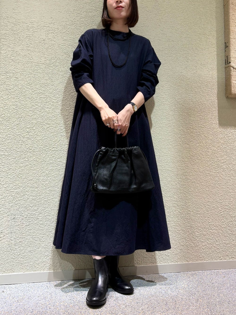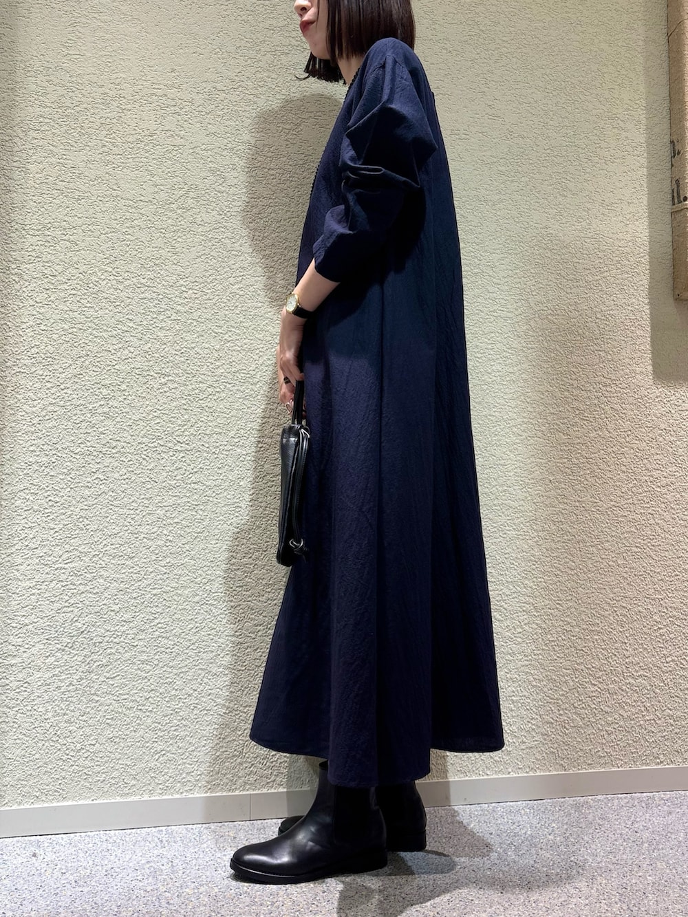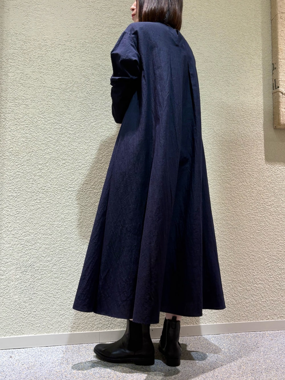 身長165cmでもブーツなどボリュームのあるシューズと合わせていただくと、パンツなどレイヤードせずとも綺麗な丈感で着用頂けます。