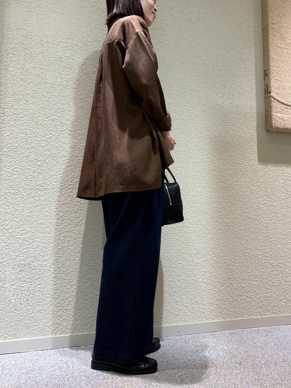 太めのストレートシルエットで下半身のラインを拾いにくく、足を綺麗に見せてくれる形になっています。