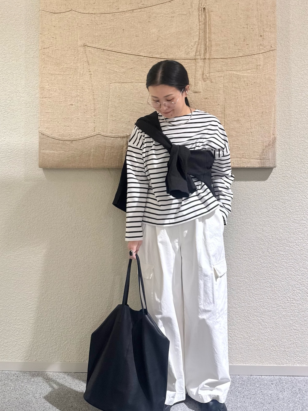 程よくゆとりのあるシルエットで体のラインを拾わず、締め付け感もないのでラクな着心地です。
