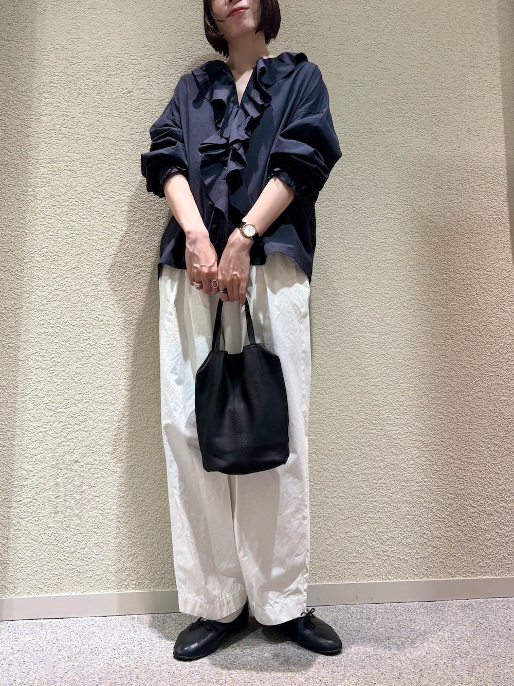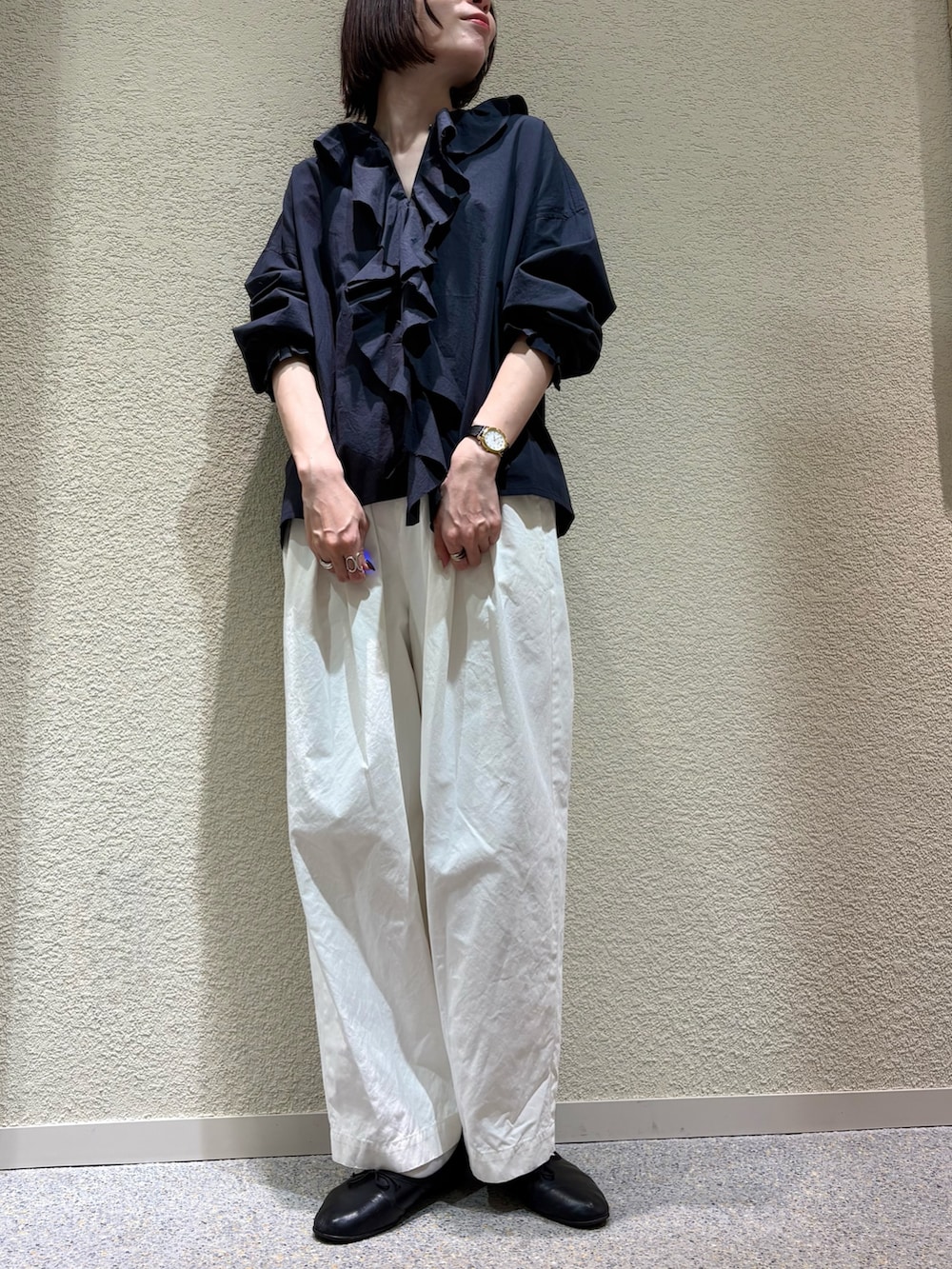フリルといっても甘すぎず、ラフな雰囲気で着用頂けて、特にCHARCOALのカラーはシックな雰囲気になり、普段甘めなデザインはあまり選ばない私もリアルバイ検討中です^ ^