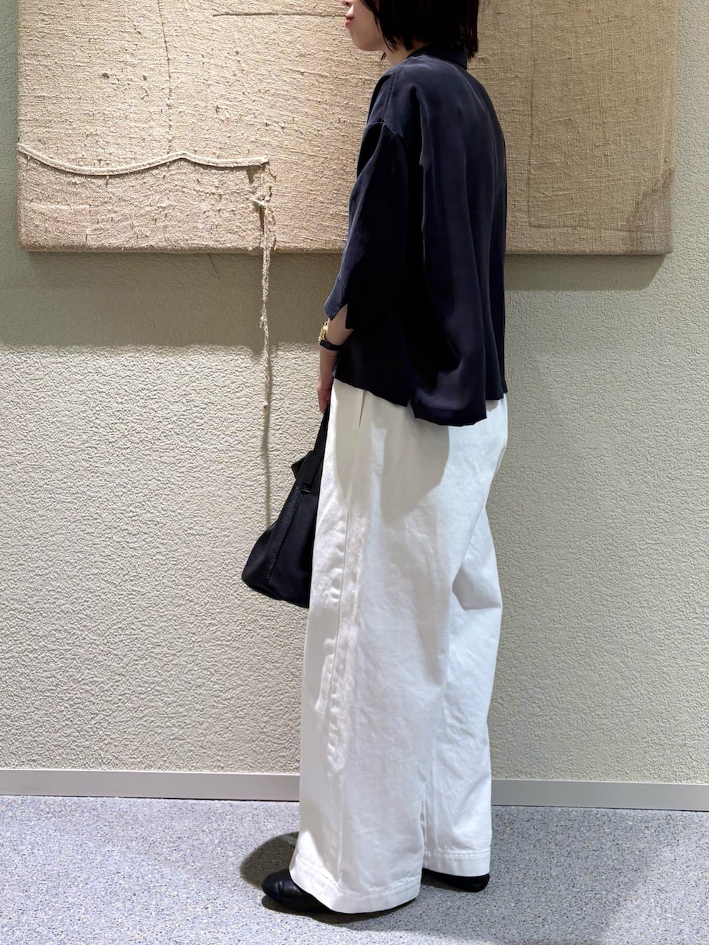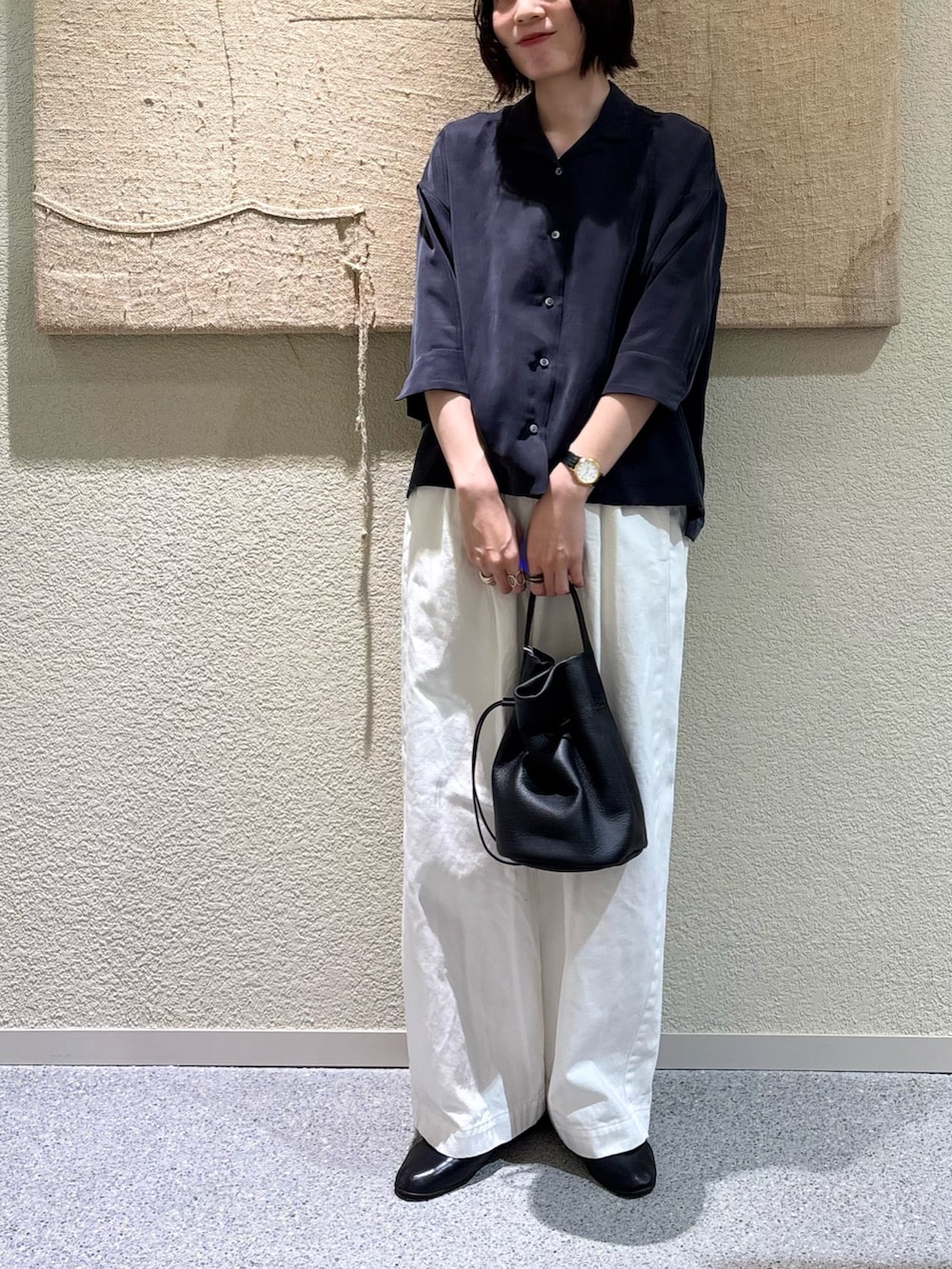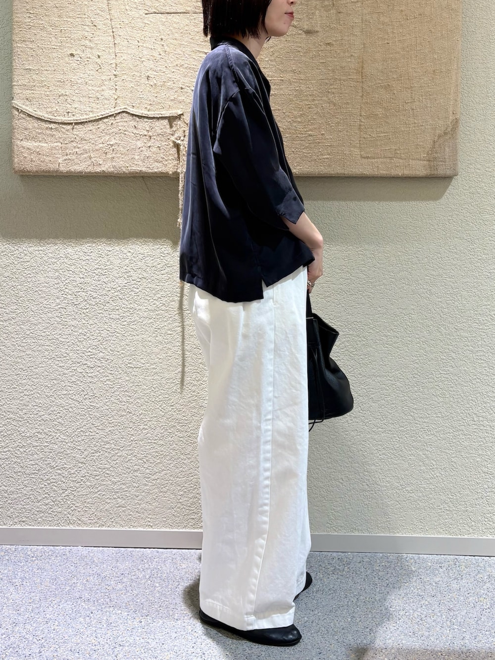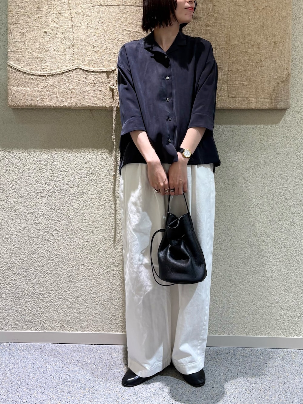 とろみのあるキュプラ素材の開襟シャツで、マットな質感が上品な雰囲気をだしてくれます。