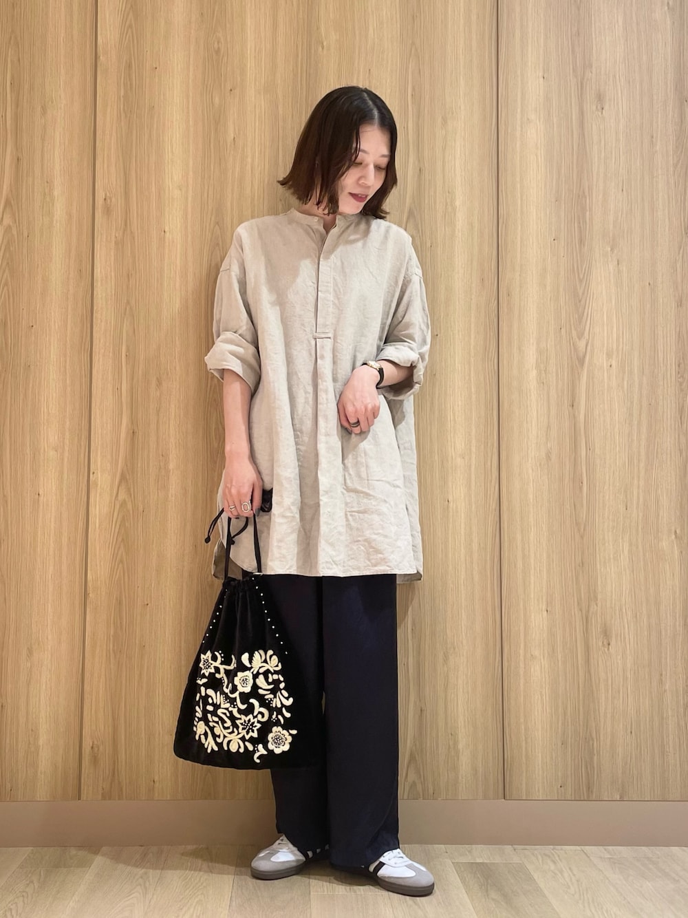 リネン素材かつ、風通しの良いゆったりとしたシルエットなので、今の時期でも着用しやすい長袖のアイテムになります◎お袖をまくったり、ボタンを何個か開けて抜け感を出して着用するのが女性らしさがでてオススメです!