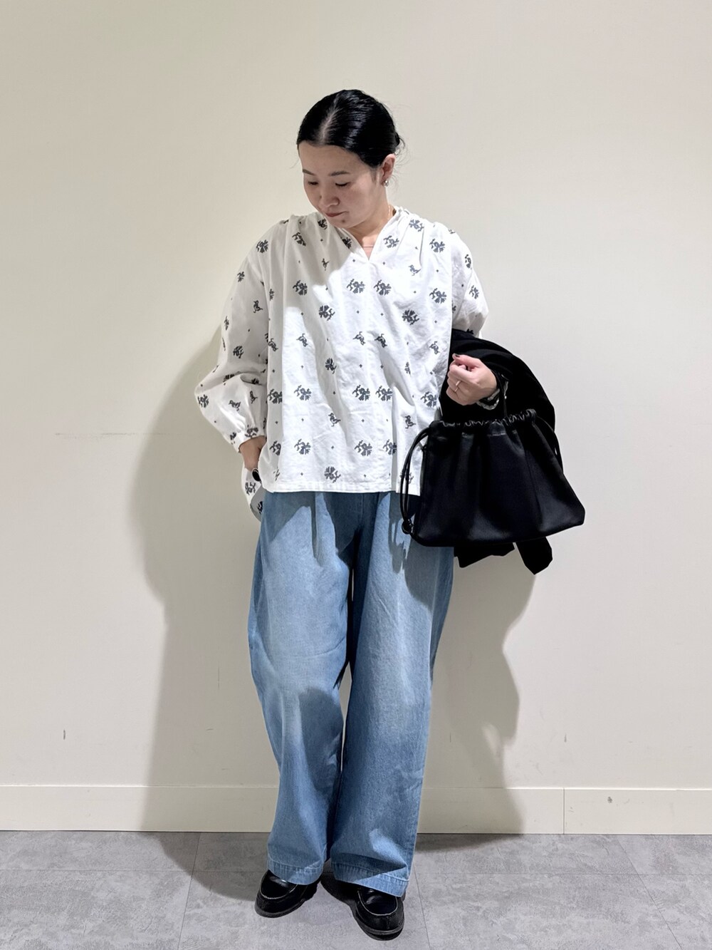 刺繍がかわいいブラウスに淡めのデニムを合わせました。