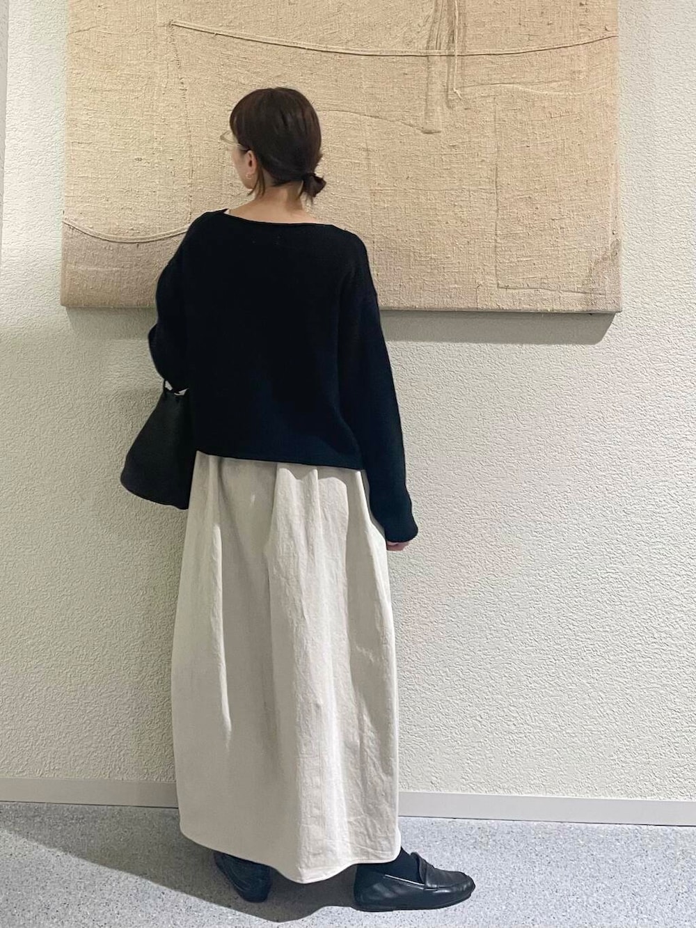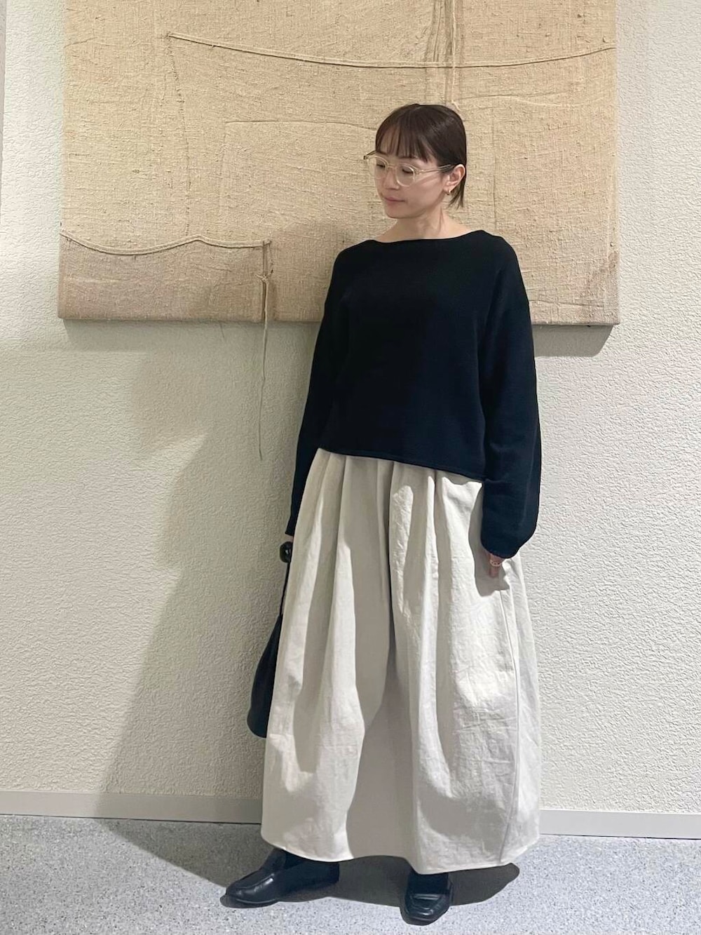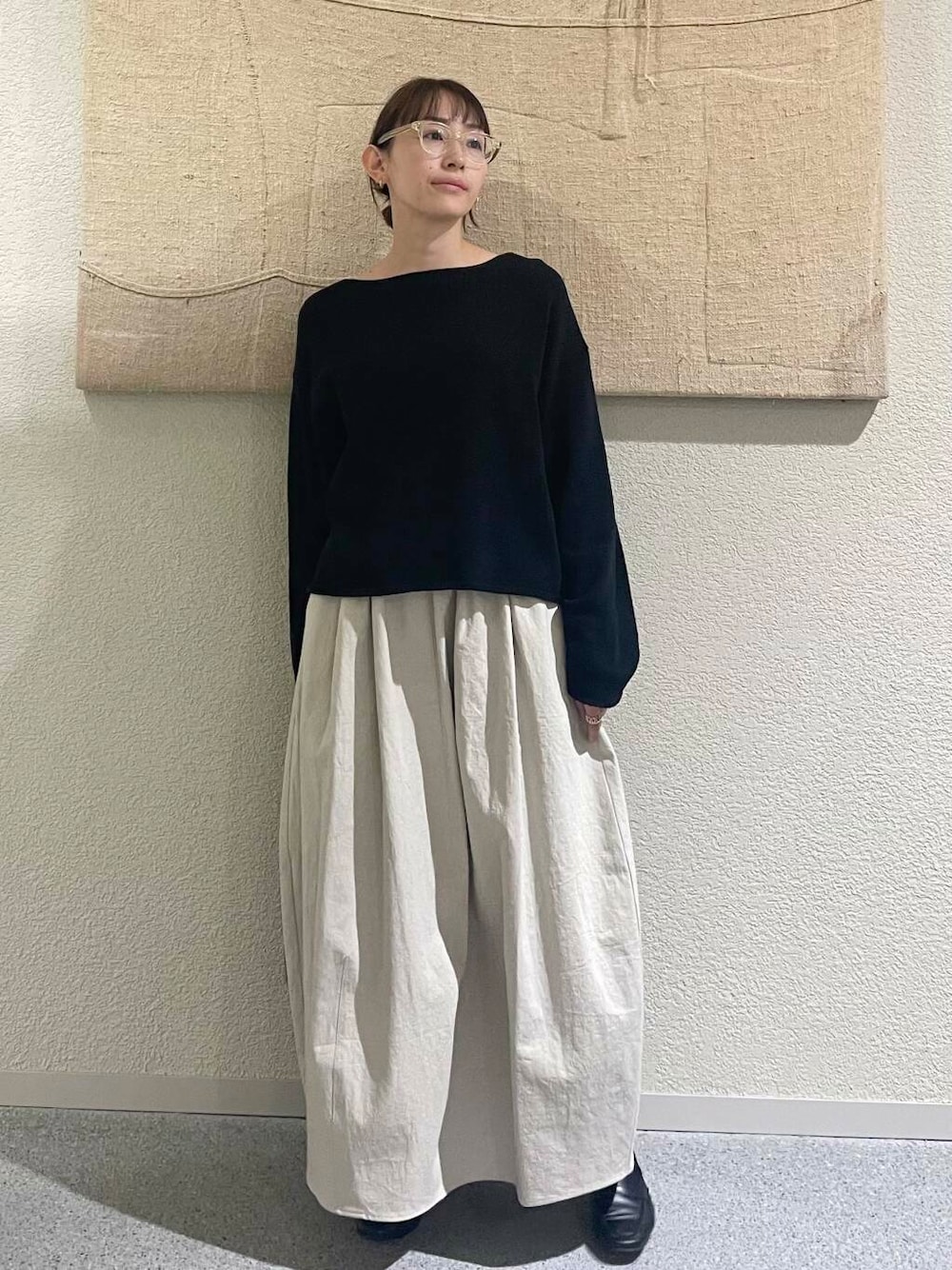 トップスを今回は短めの丈感のコットンテープヤーンボートネックニットで合わせました。