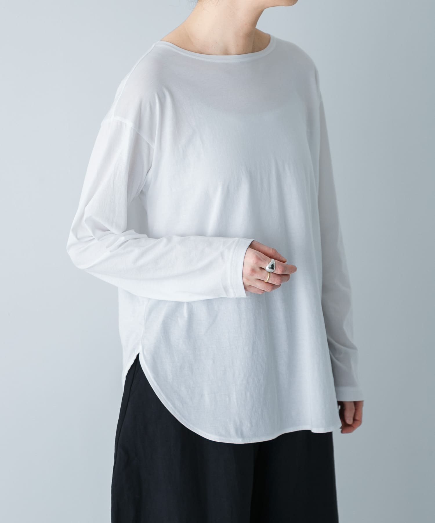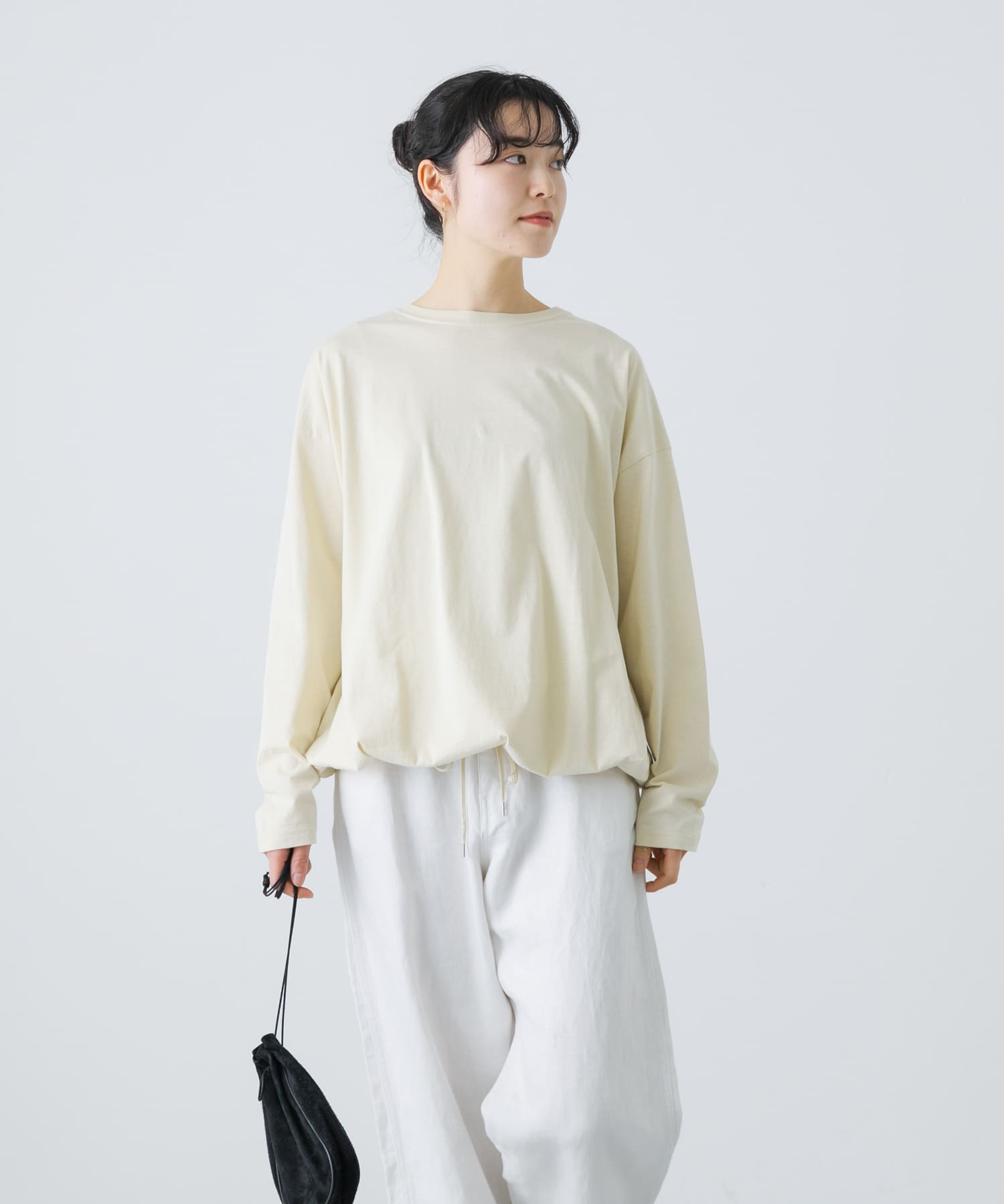 新作のオーガニックコットンドロストカットソーの良さを活かして、こなれレイヤードスタイルにしてみました。