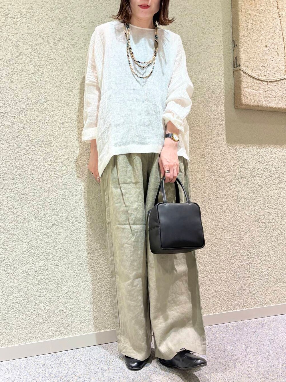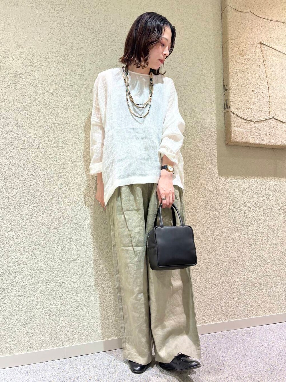 あわせたパンツはリネン素材でさらっとしていてとても快適な履き心地です!ウエストもゴムなのでストレスフリーです。お尻やもも周りなどは程よくゆとりがあるのですが、ウエストのタックの効果で形がとても綺麗です◎
