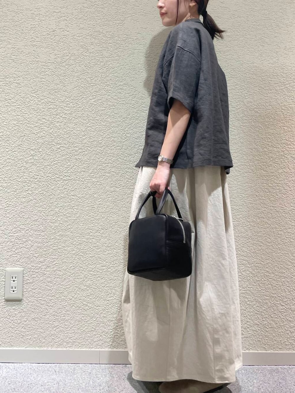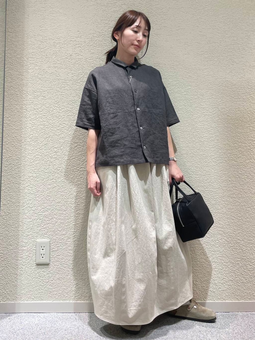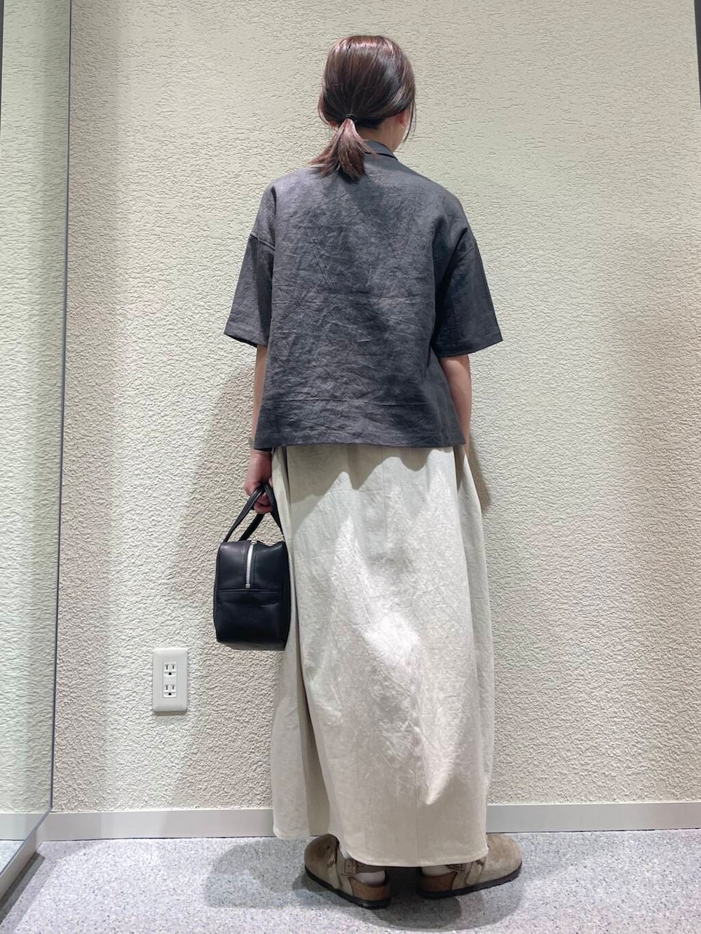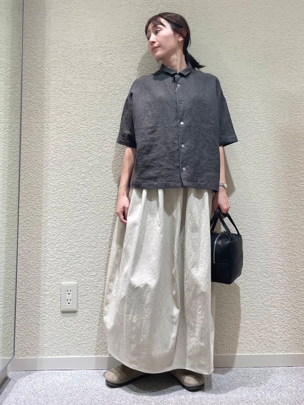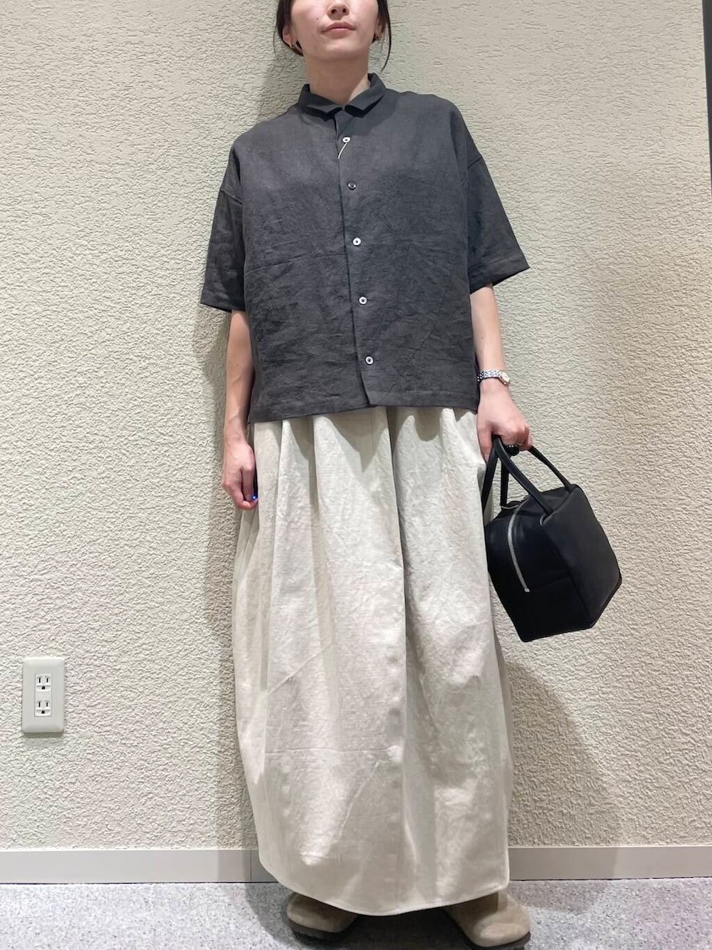 人気のコクーンスカートを、リネンラミーオープンカラーシャツをレギュラーカラーで合わせて、大人の落ち着いた雰囲気で合わせました☕️
