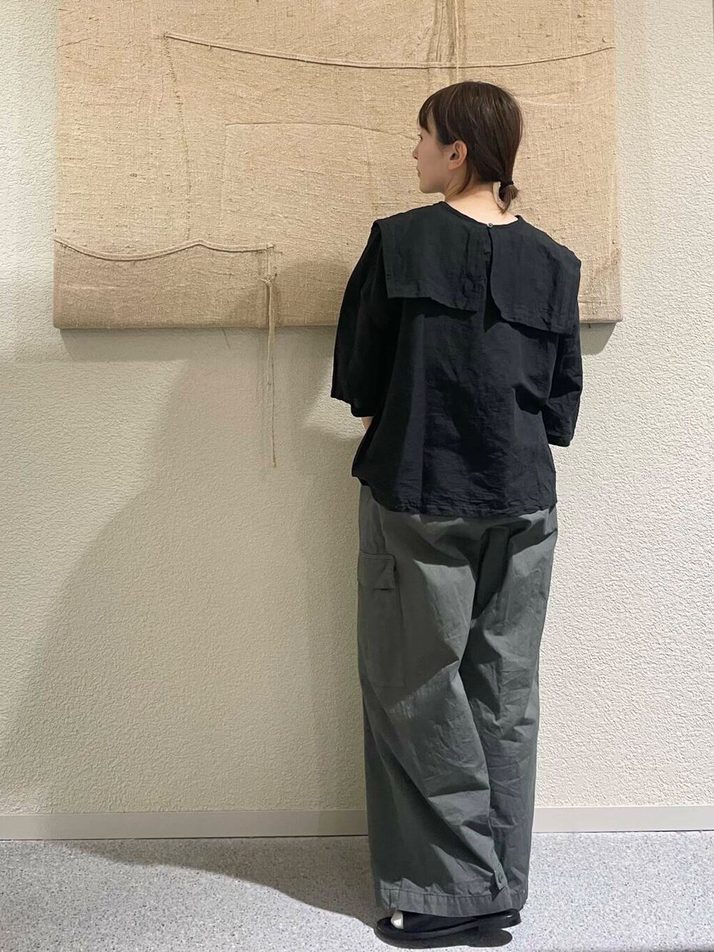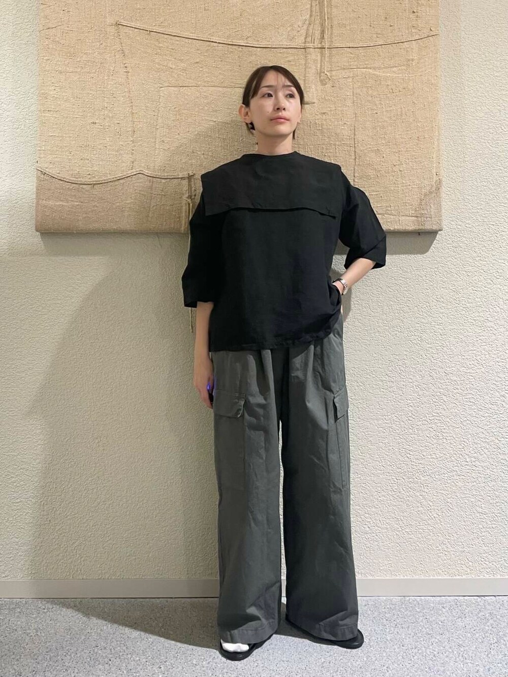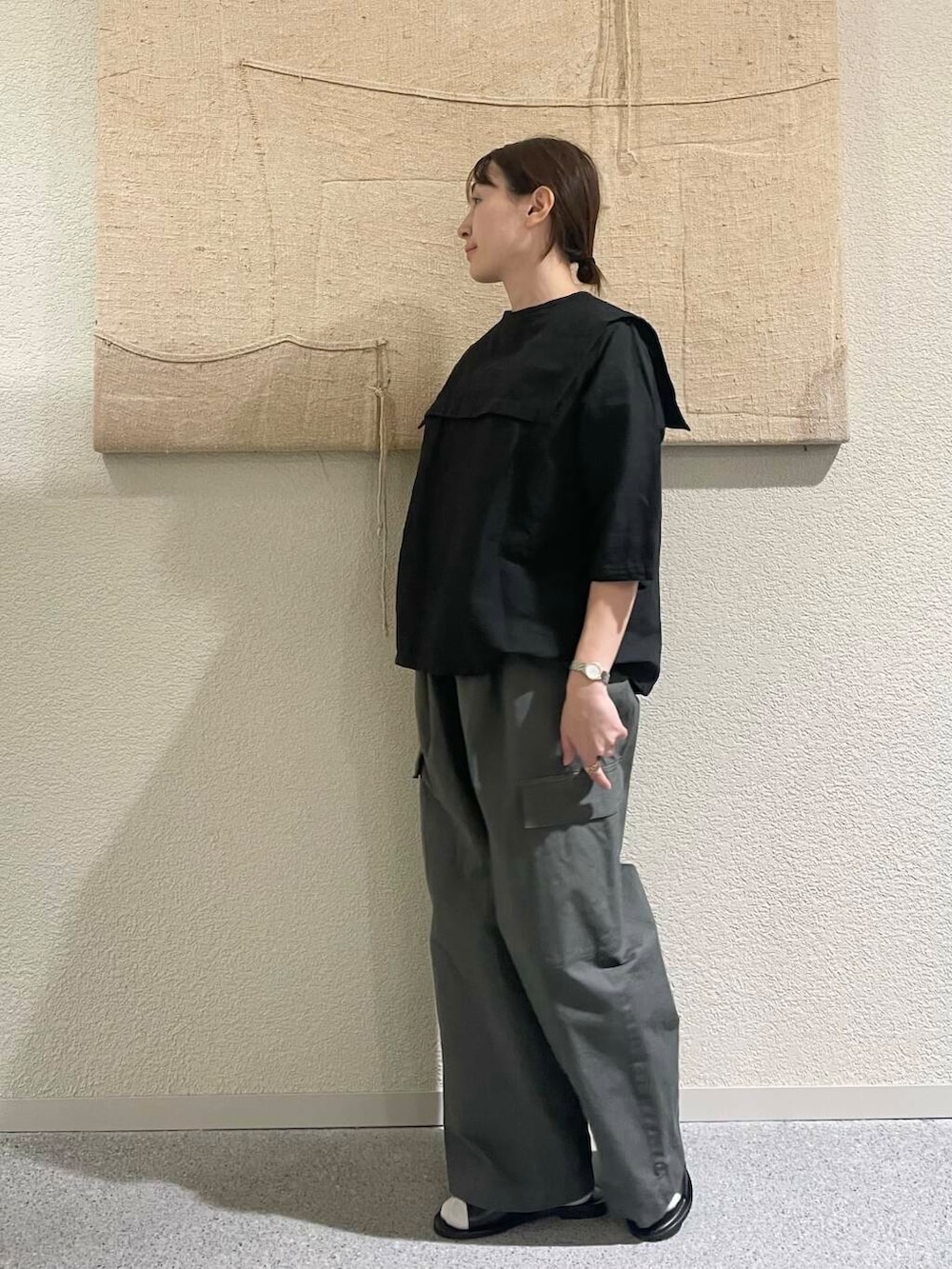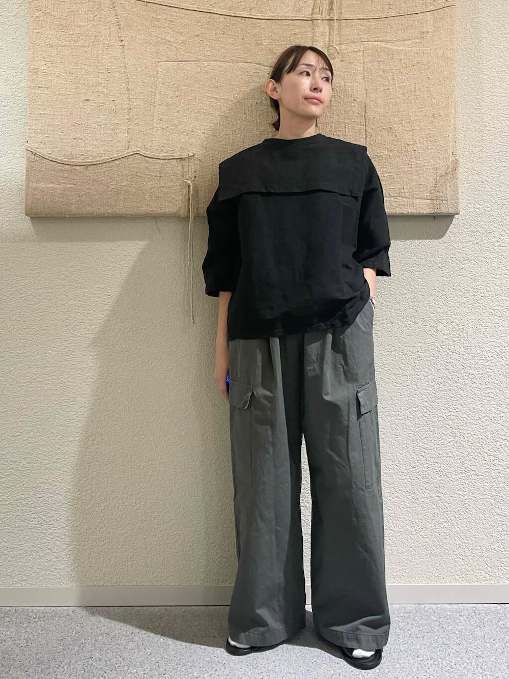 人気のビッグカラー2wayブラウスをかぐれ定番のユーリティーパンツのsmokekhakiでミリタリーに合わせました!