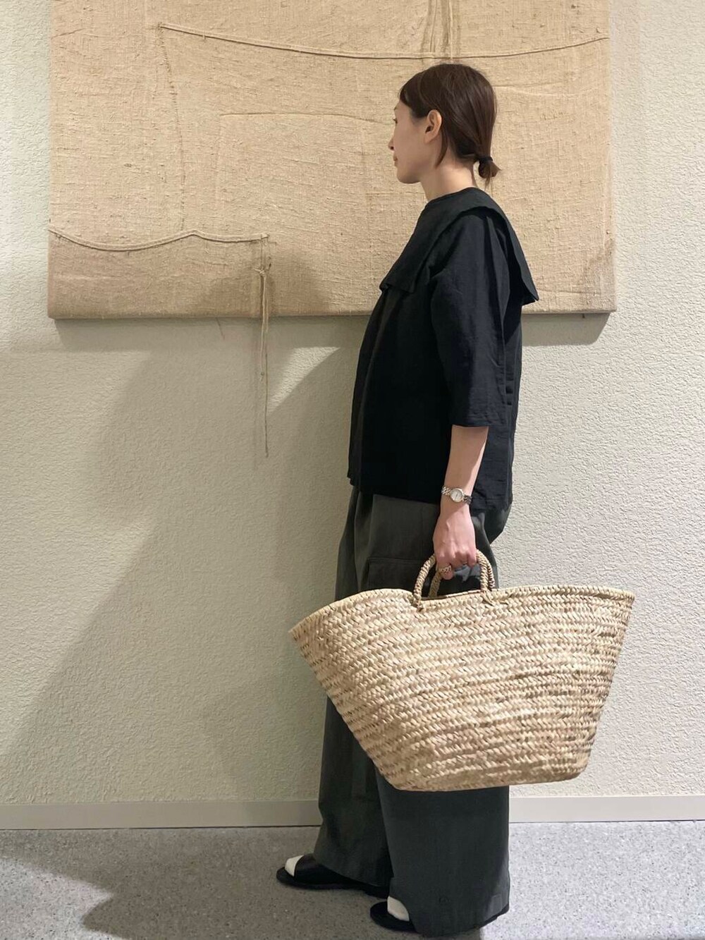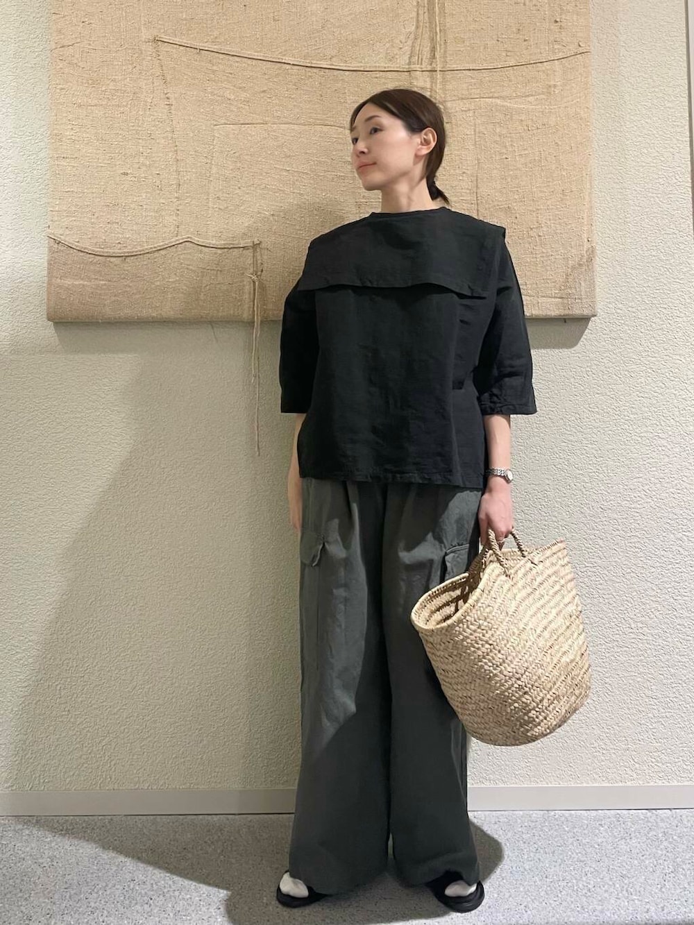 ダークトーンなコーデですが、サンダルや小物にカゴバッグなど合わせて頂くとさらに○