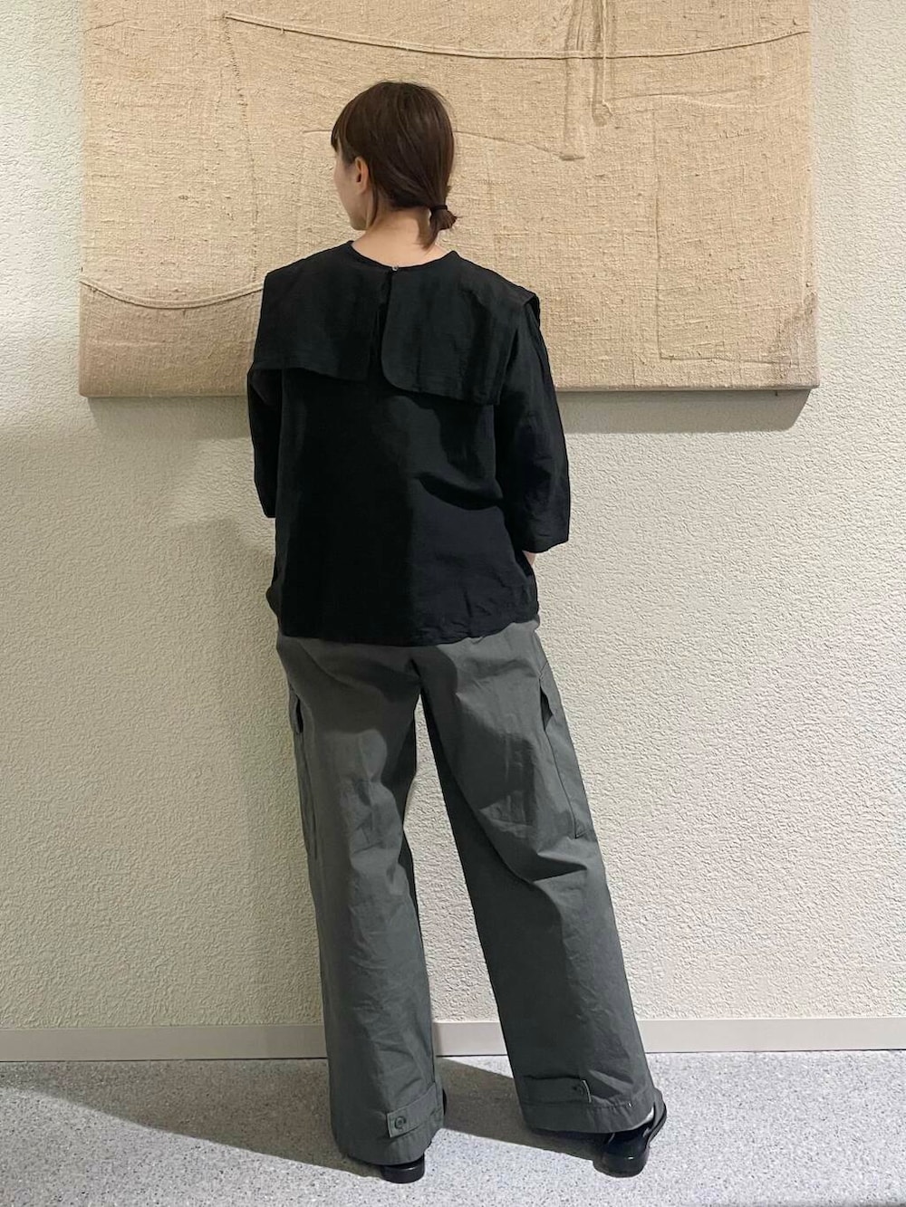 裾のボタンで絞って頂いてもいいですし、裾を少しロールアップして頂いてもいいと思います。ワイドですが、ストレートシルエットがとってもスタイルアップしてくれます✨