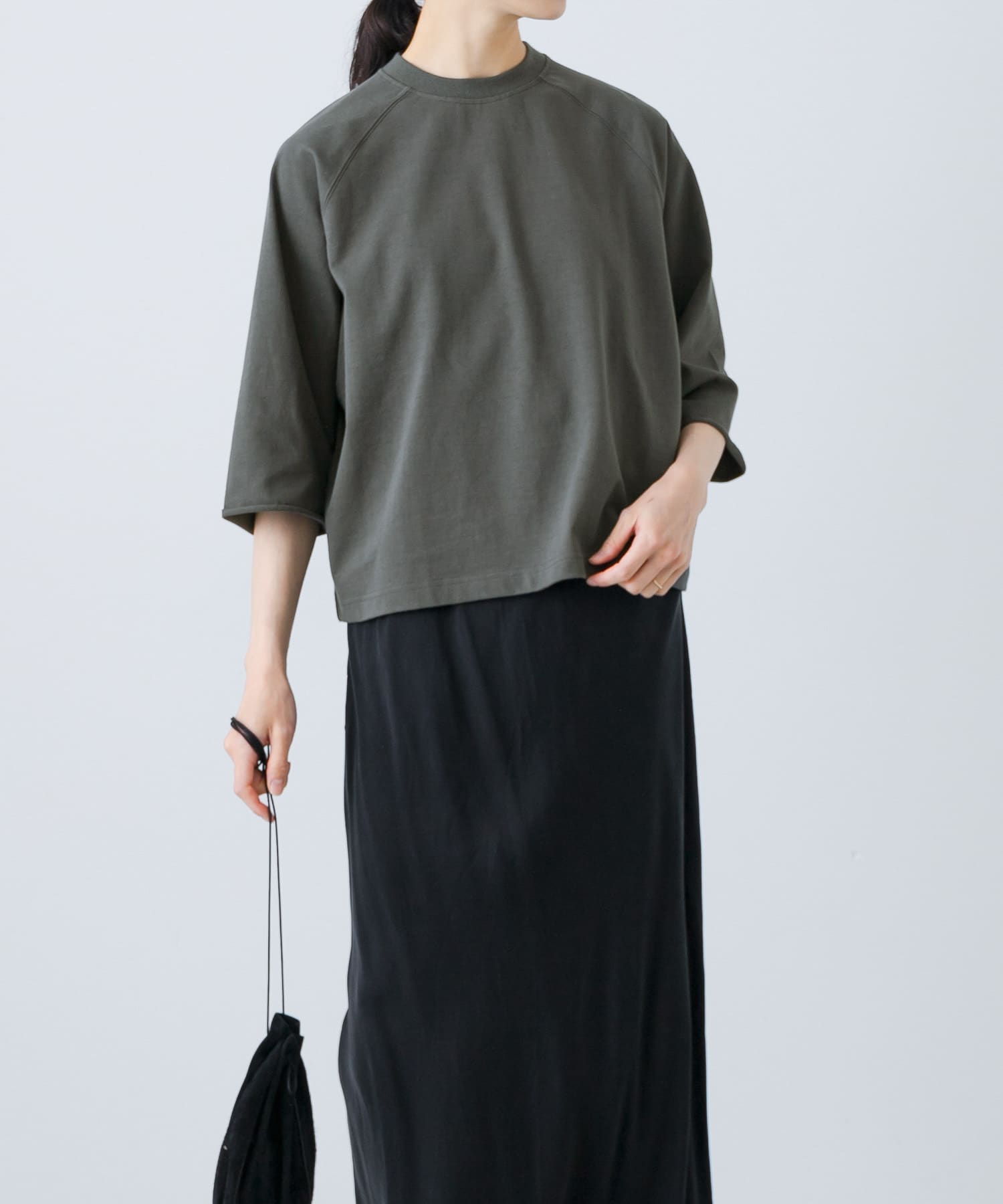 軽くてサラッとした素材感のカットソーは5分袖で二の腕が隠れて安心感のある袖丈です。着丈もすっきりなのでスカートや太めのシルエットのパンツとも相性抜群です◎