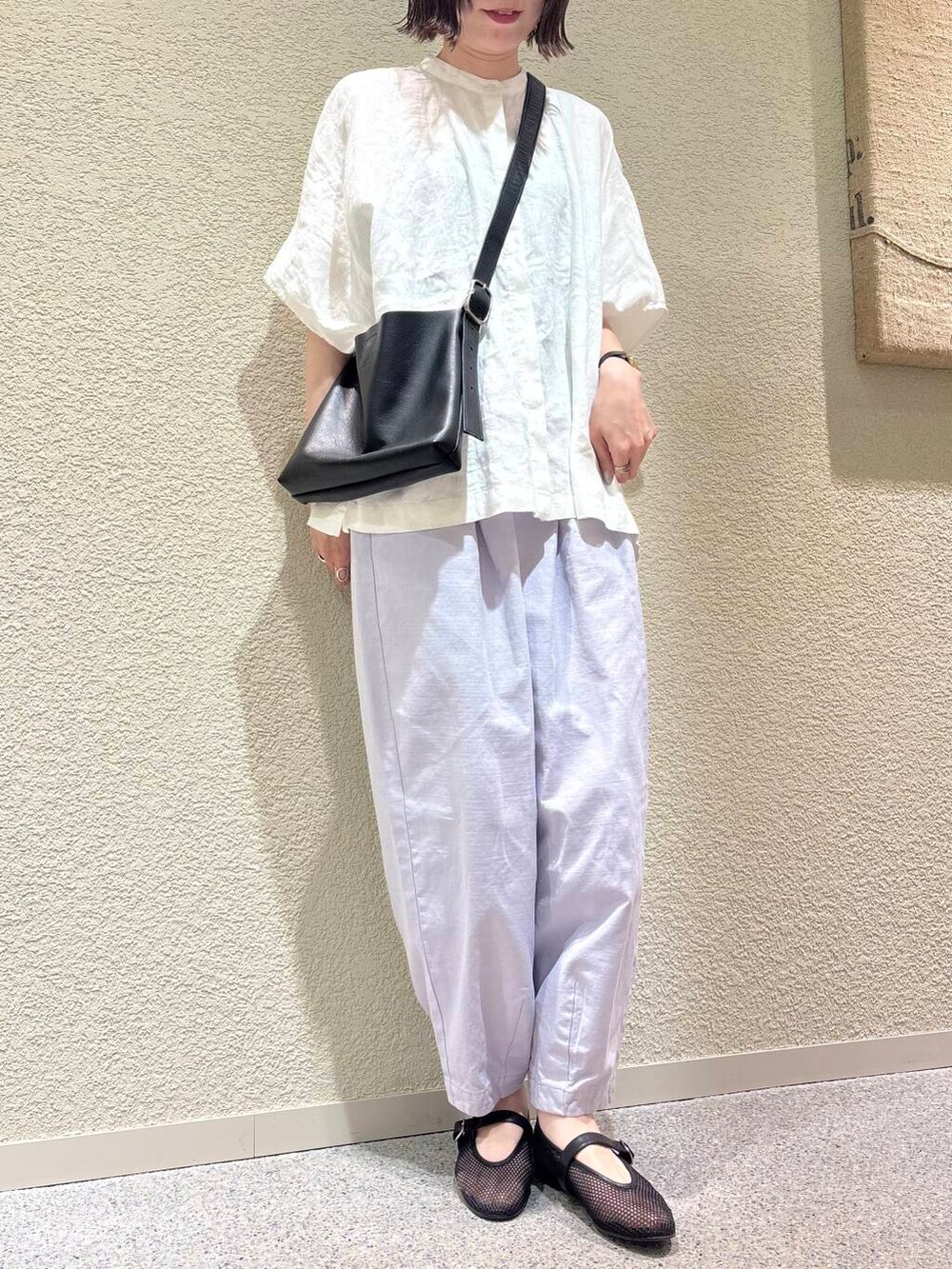 ドライタッチなリネン素材でゆったりシルエットの為、風通しが良くこれから暑くなる季節にも涼しく快適に着ていただけるシャツ。スタンドカラーで大人の印象に◎