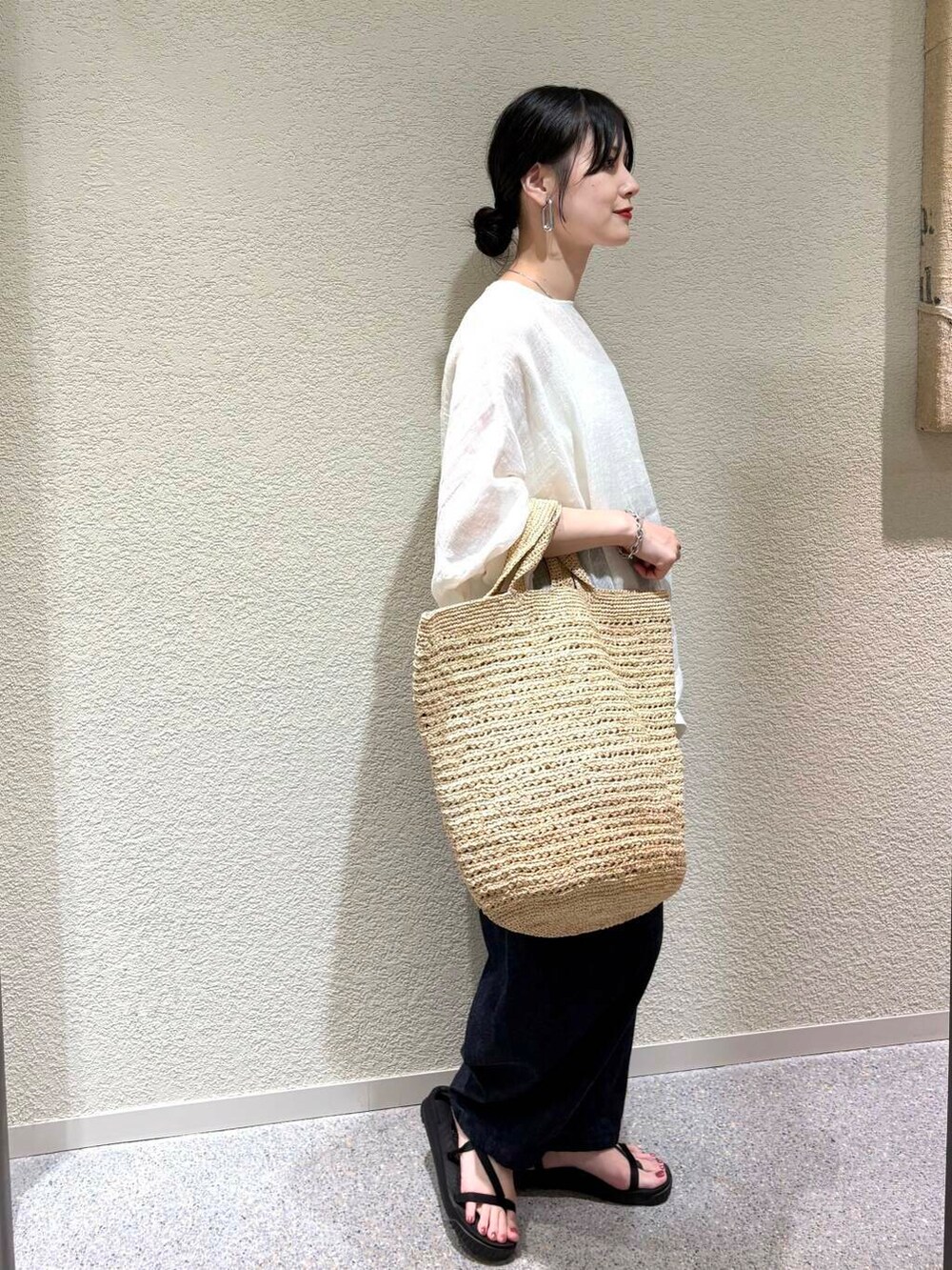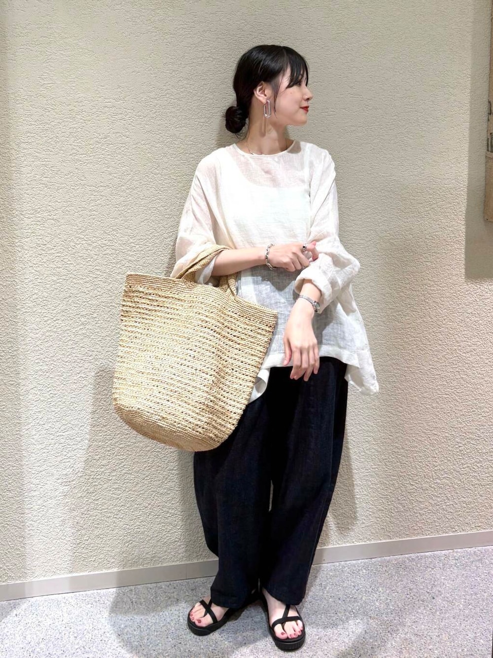 ナチュラル素材が夏らしい、容量たっぷりのカゴトートバッグを合わせて季節感を演出。デイリー使いにも◎