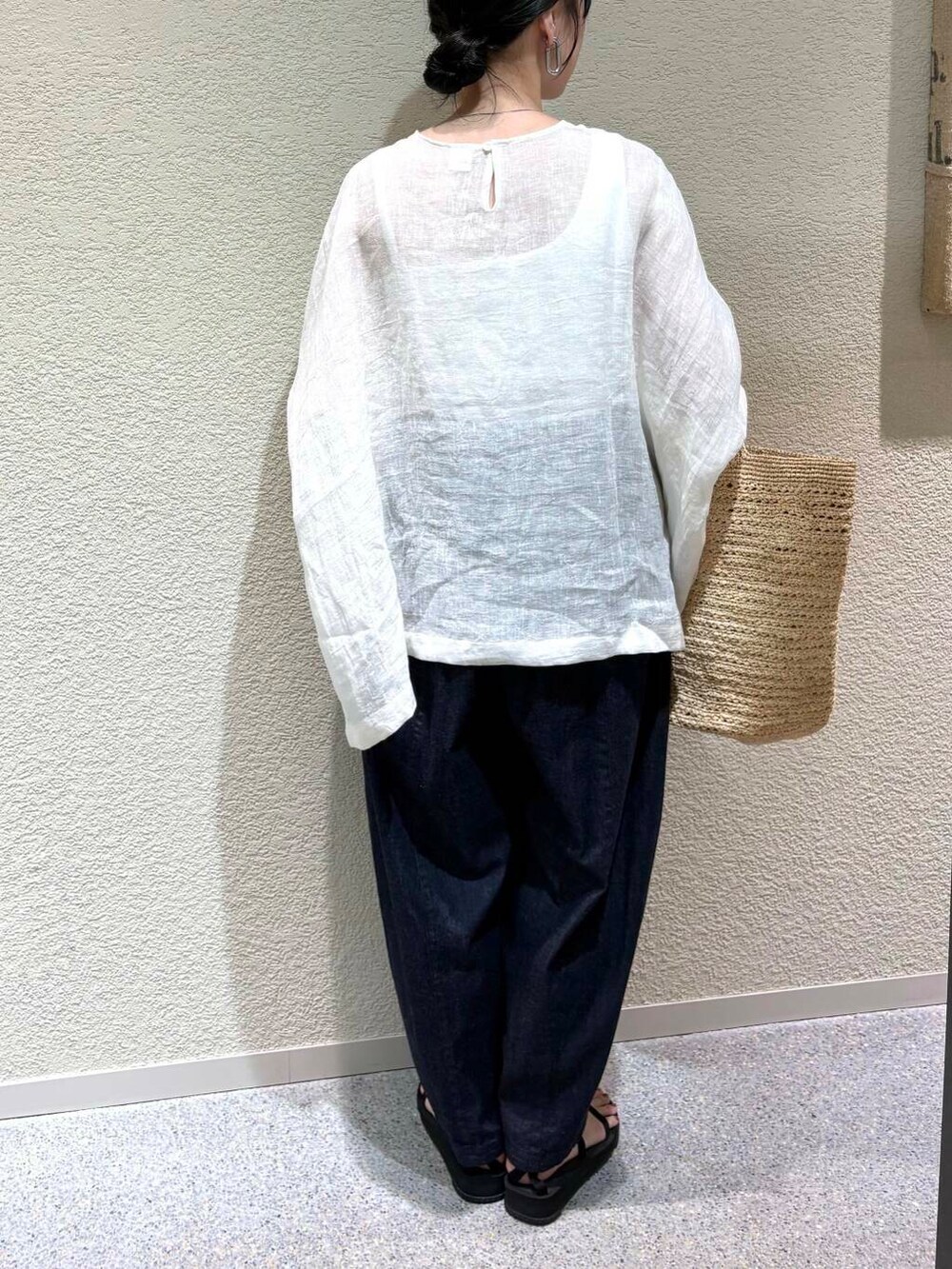 ウエストはゴムでストレスフリーな履き心地。濃いめインディゴカラーのデニムパンツは、ボリュームのあるシルエットながら、リネントップスとのバランスで抜け感を演出。身体のラインを拾わない分、足元にかけて程よく重心を落とし、全体のシルエットをすっきり見せてくれます。