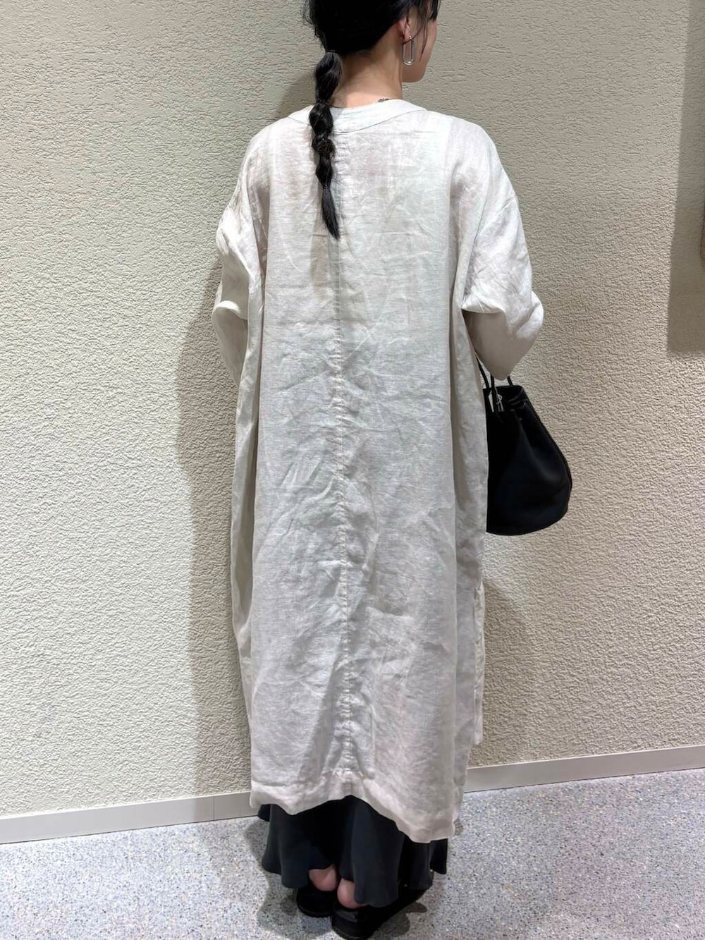 リネン100%のナチュラルな風合いが魅力の、ライトベージュの7分袖ガウン。クルーネックで前立てやボタンのないミニマルなデザインは、どんなインナーにもすっと馴染み、軽やかに羽織れる一枚。