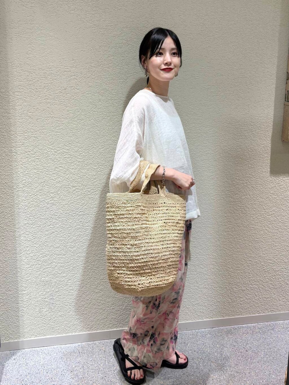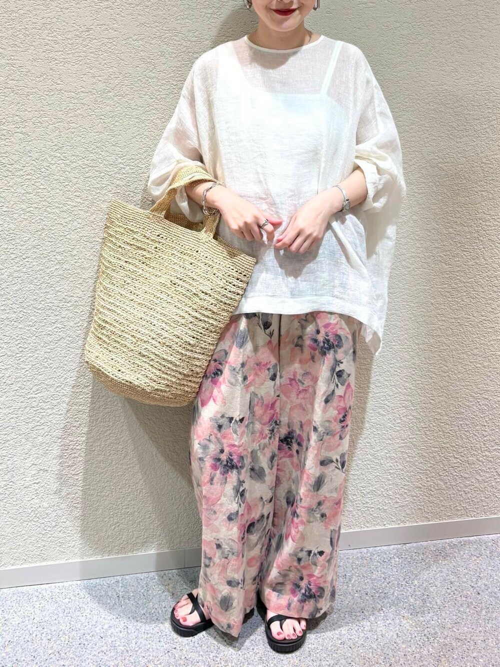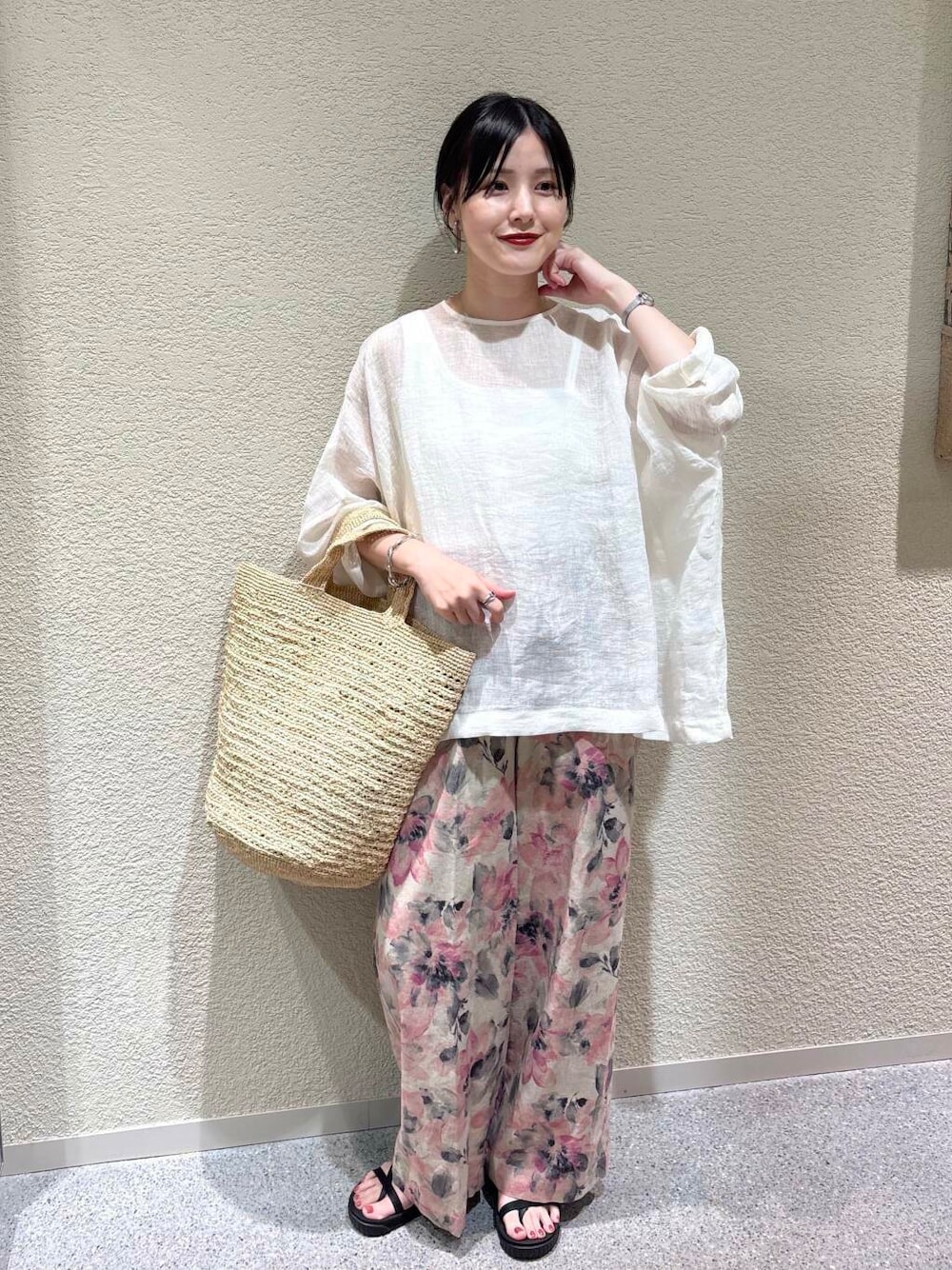 ナチュラルな素材感が魅力の、大きめトート型のカゴバッグをアクセントに。存在感がありながらも、柔らかな配色のパンツと調和して、優しい雰囲気にまとめています。