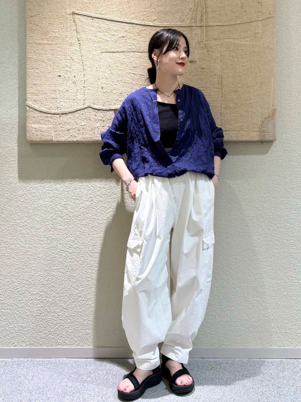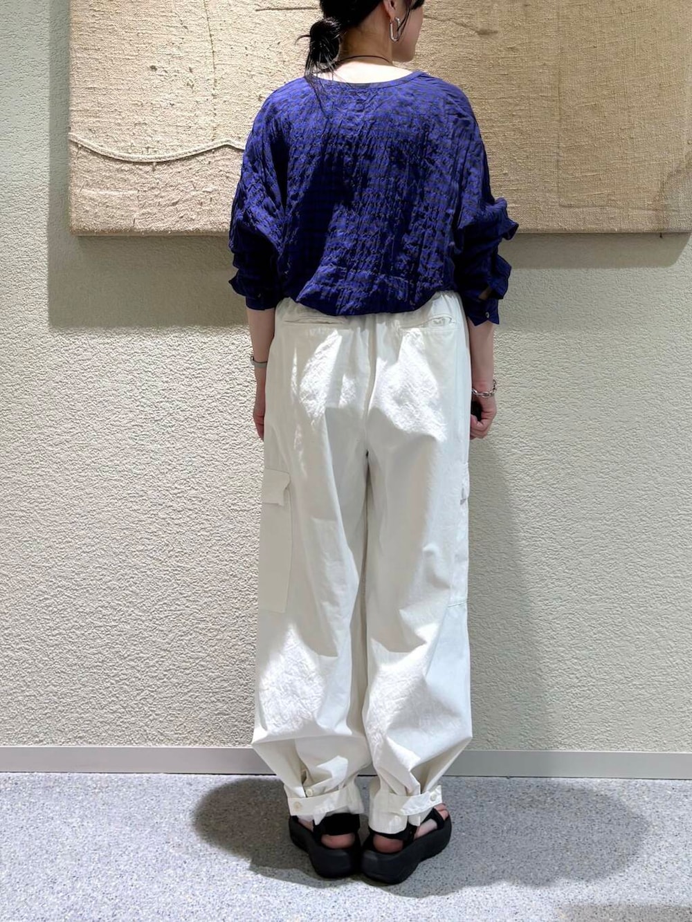 ・裾ブラウジングと裾絞りパンツでシルエットに変化を出して遊べるコーデ