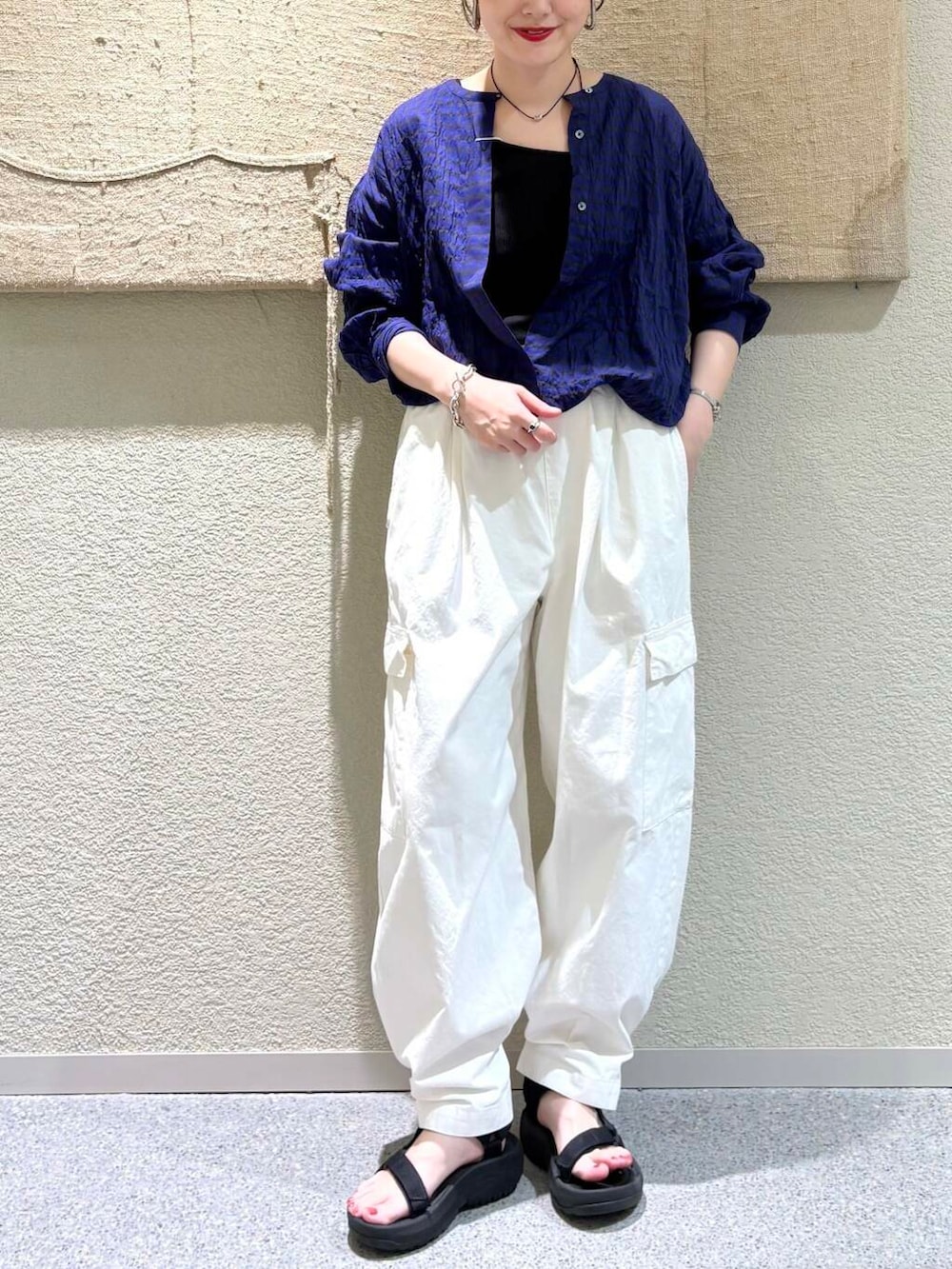 今回はボタンを開けて黒のタンクトップをインナーに重ね、裾をボトムスにインするスタイルで、着崩した着こなしに。