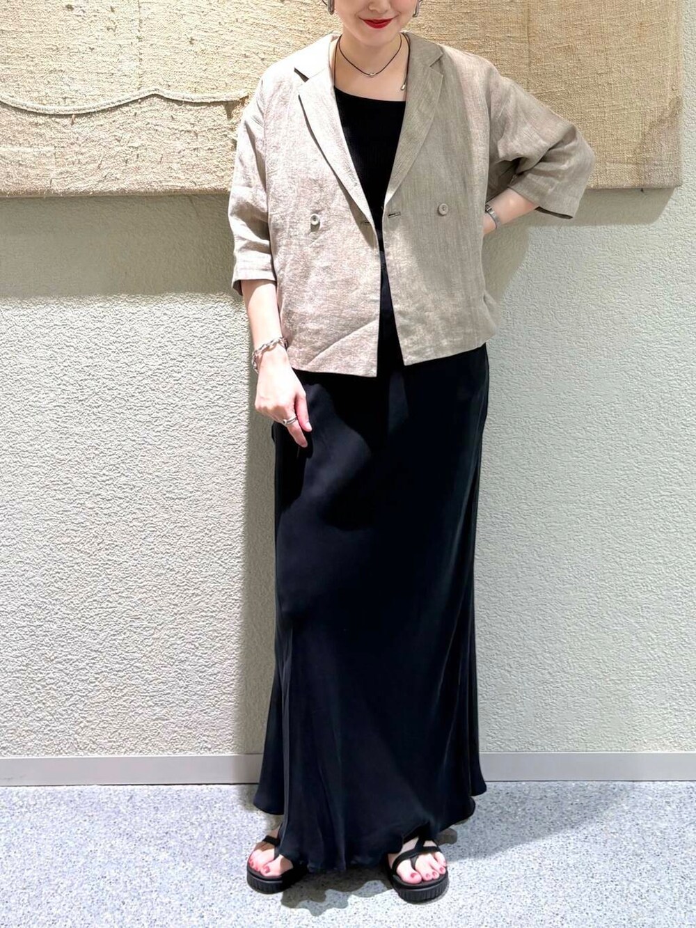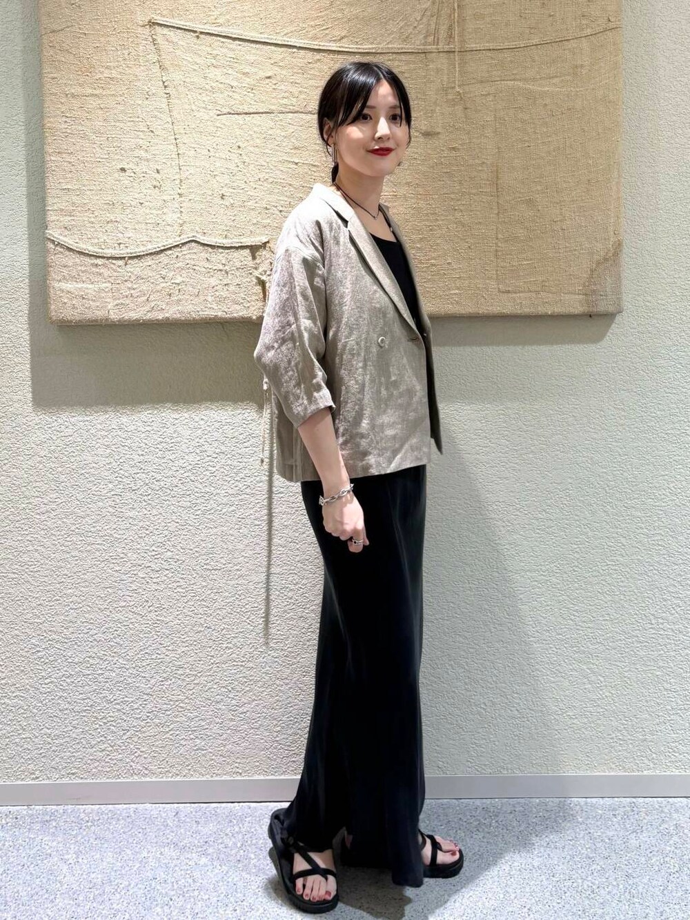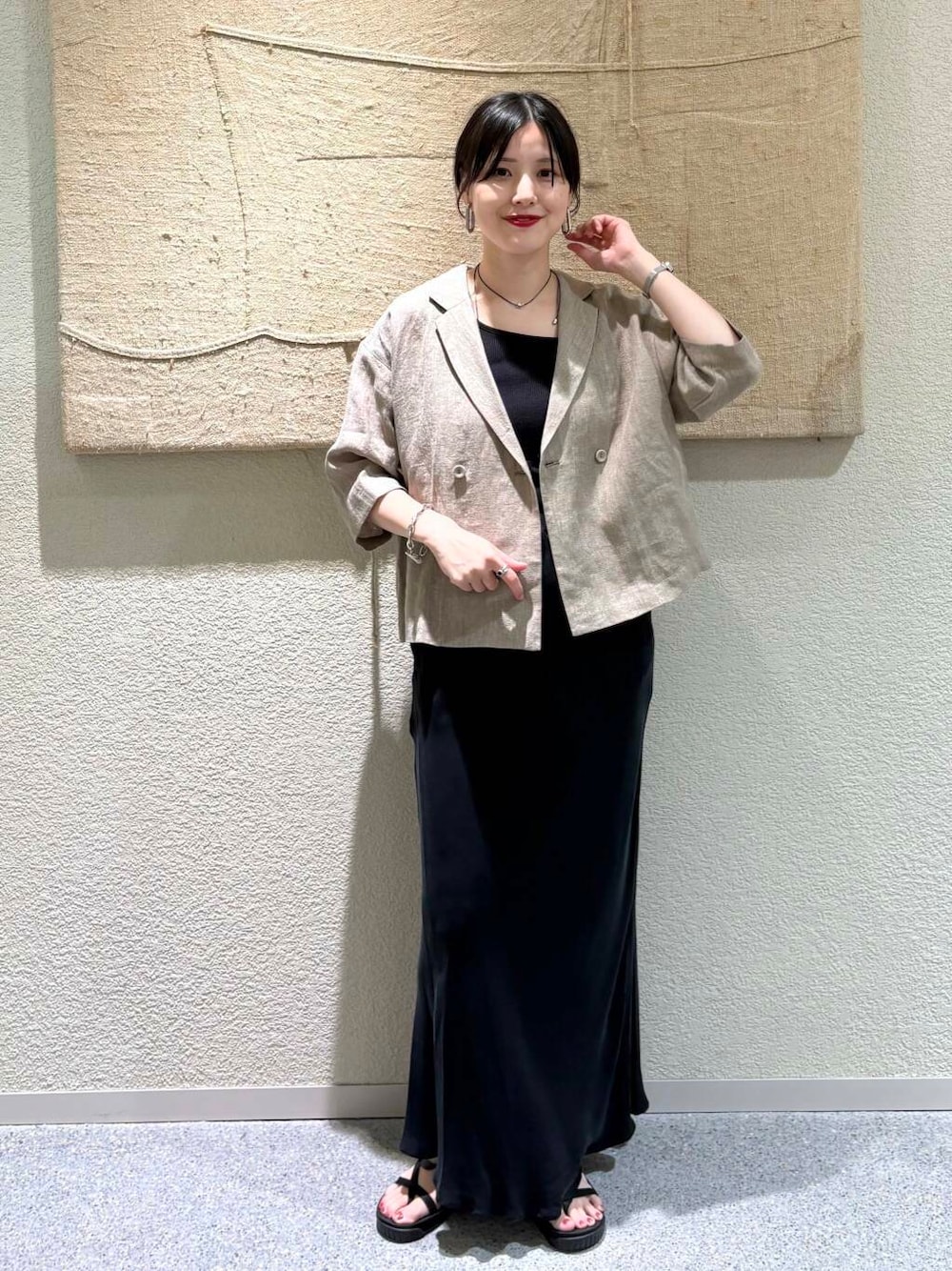 身長158cmで着用。ジャケットは腰位置より少し上のショート丈でバランスが取りやすく、ボトムスとの相性も◎