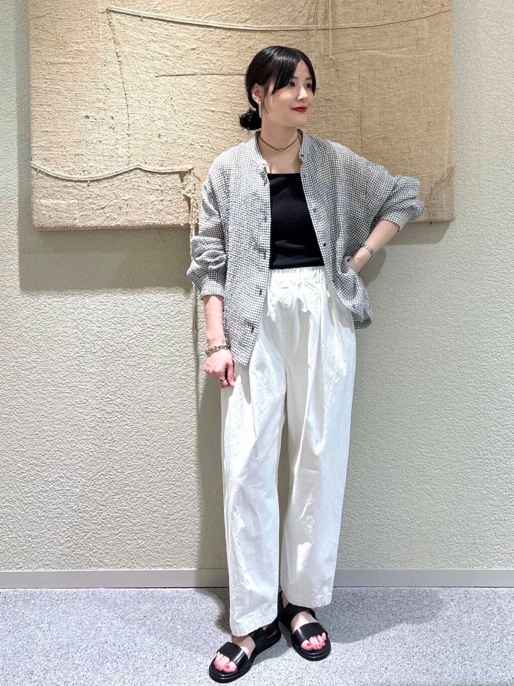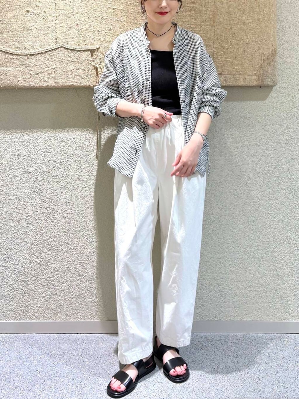 インナーには、すっきりとした黒のタンクトップを合わせて、シャツの柄を引き締めつつ、シンプルで洗練された印象に。
