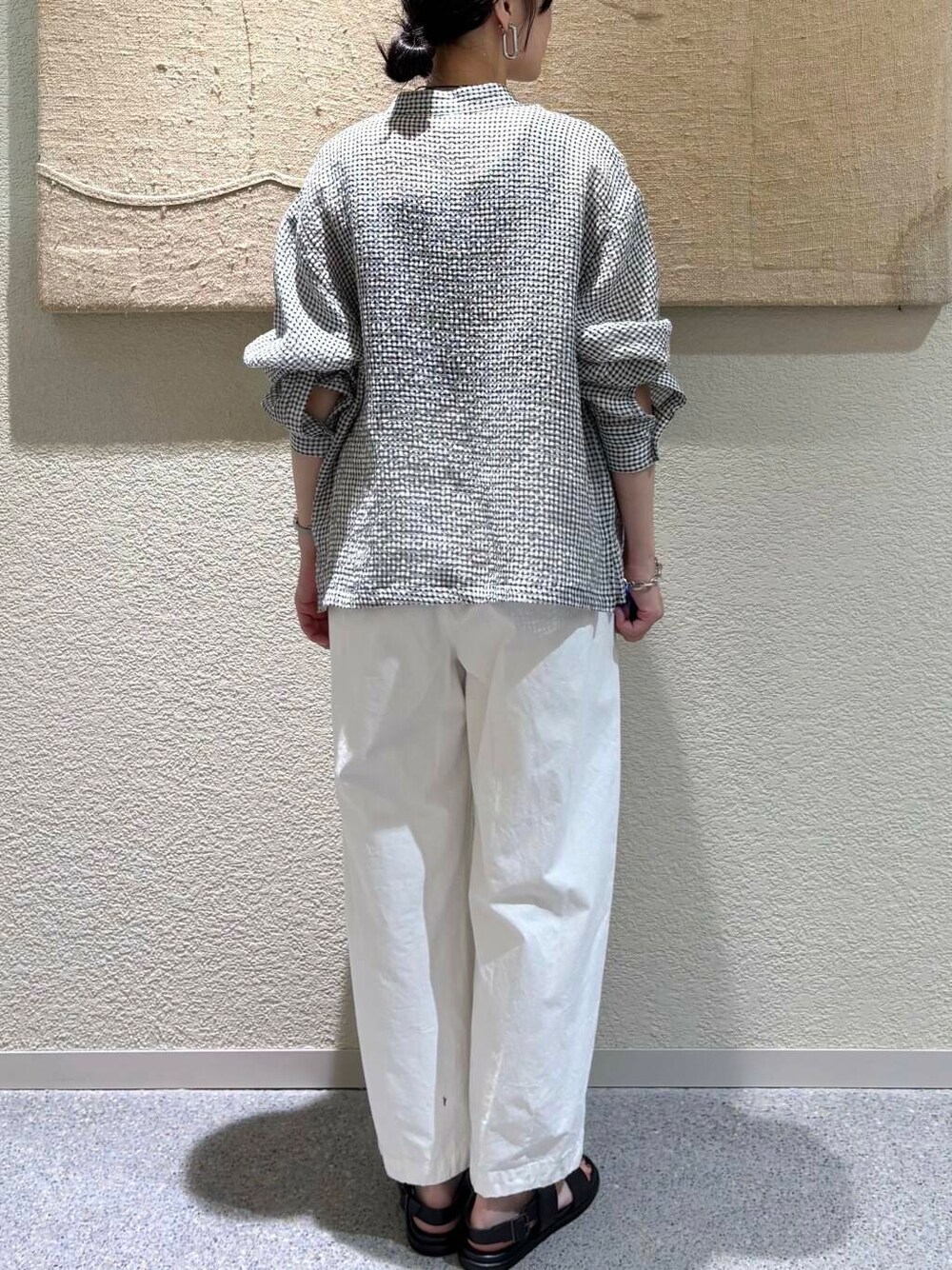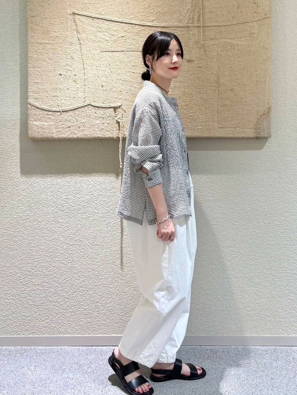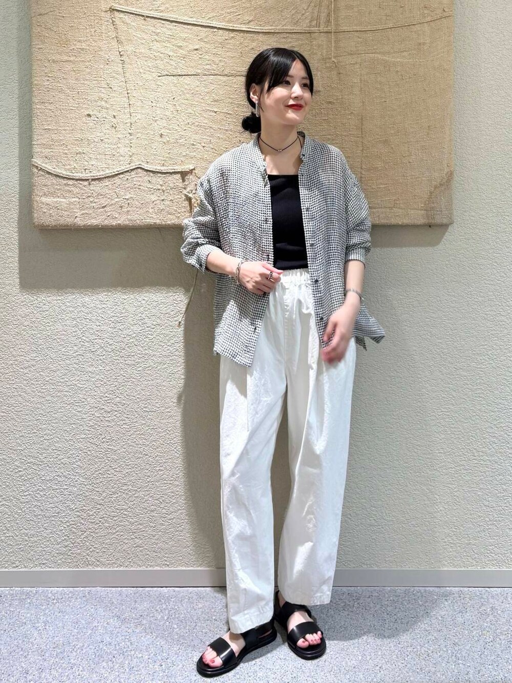 • ギンガム×白ボトムの爽やかな配色で、清潔感のある印象に