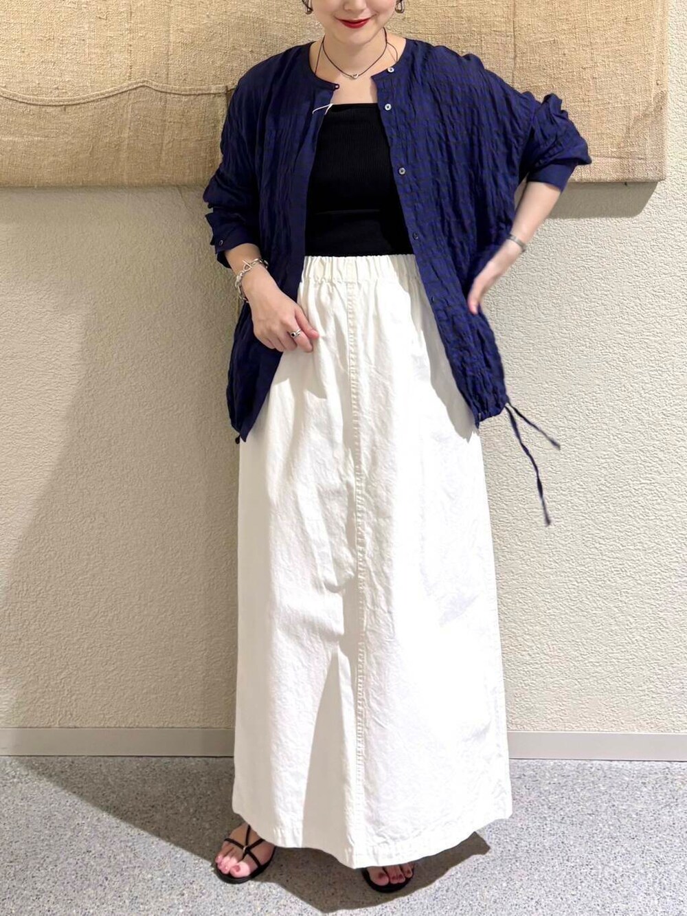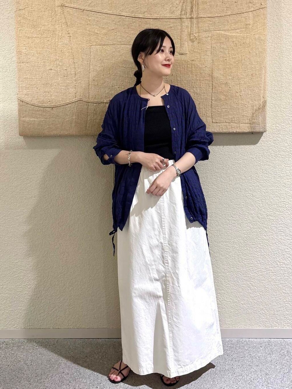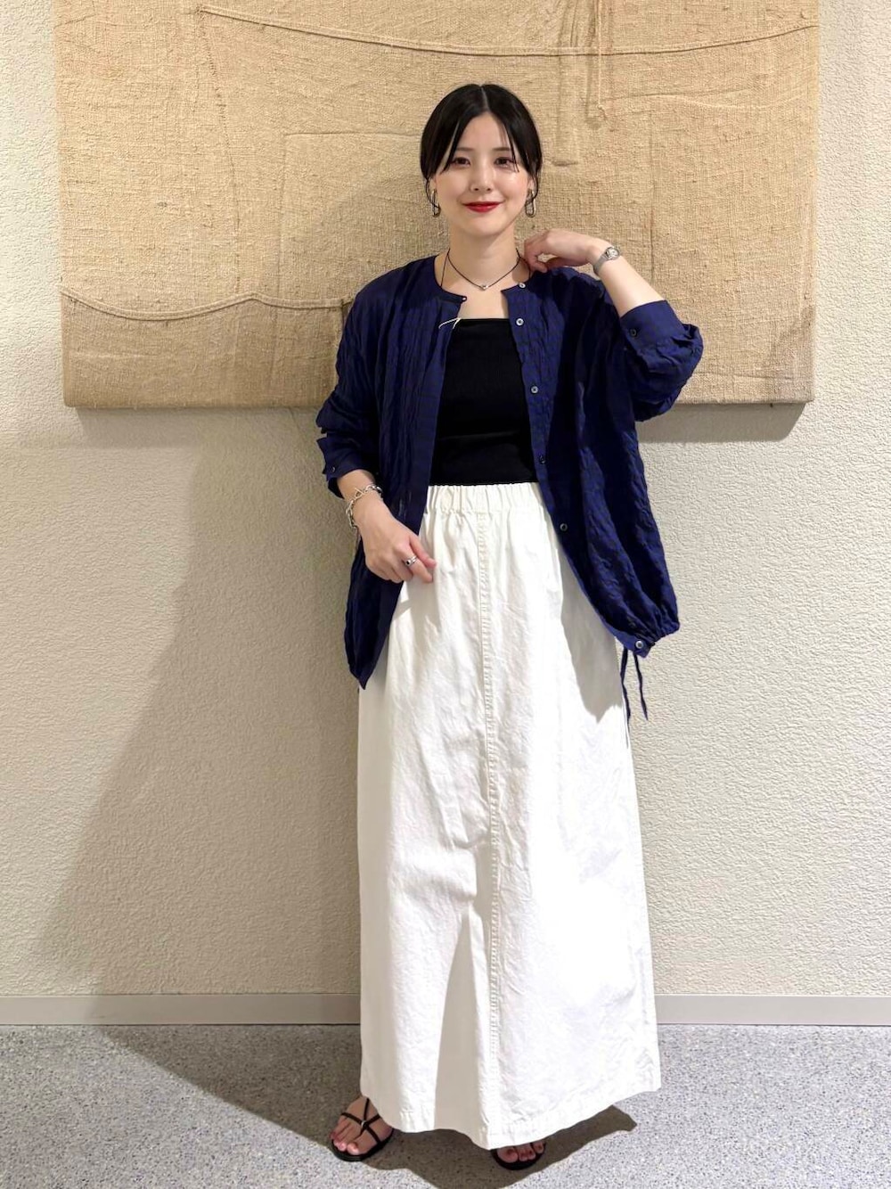 ボトムスはコットンストレートスカート〈OFF/サイズ1〉を着用。程よくハリのある生地感で、身体のラインを拾いすぎず、すっきりとしたシルエットに。爽やかなオフホワイトがロイヤルブルーと好相性で、春夏らしい軽やかさを演出します。
