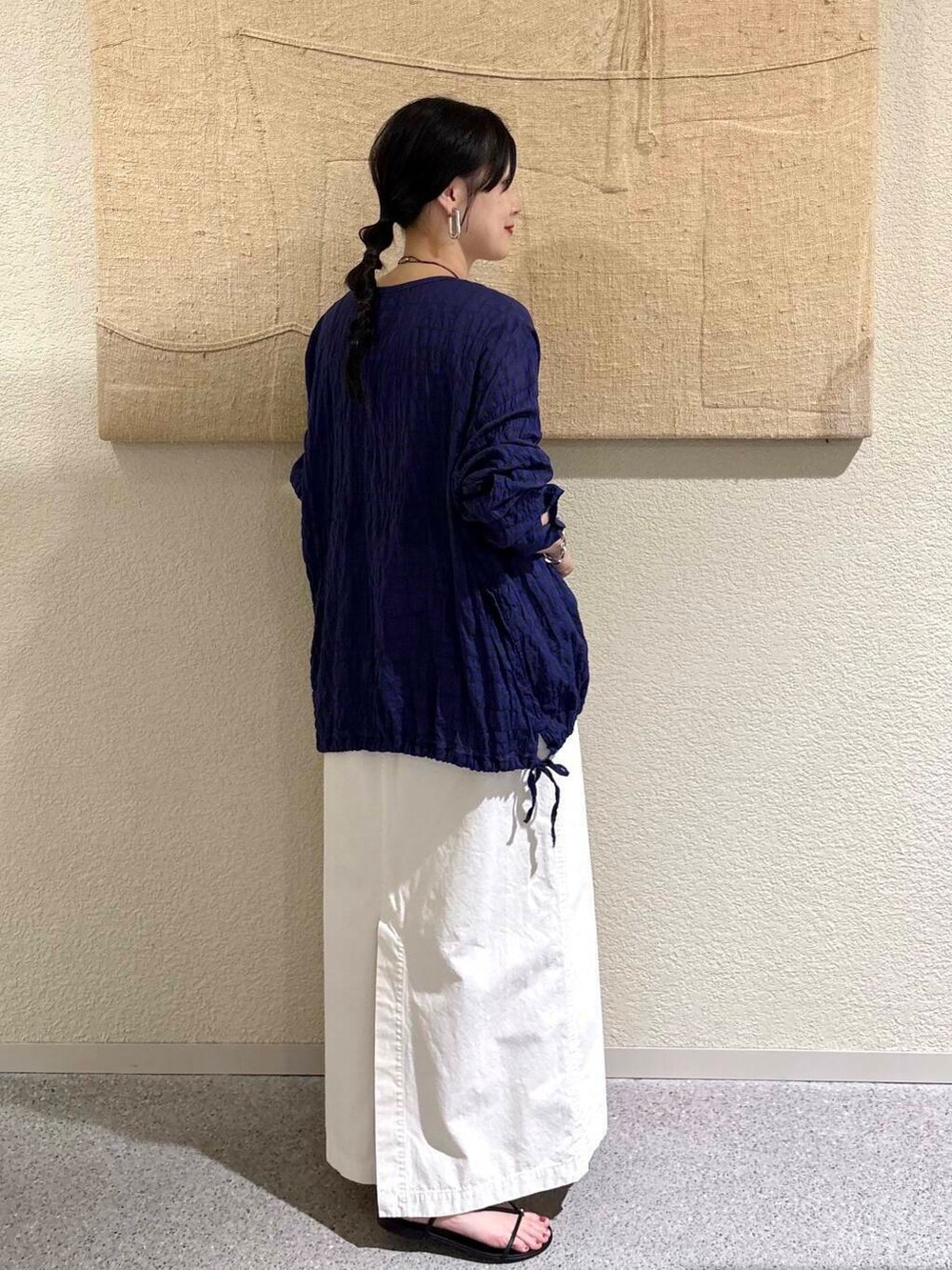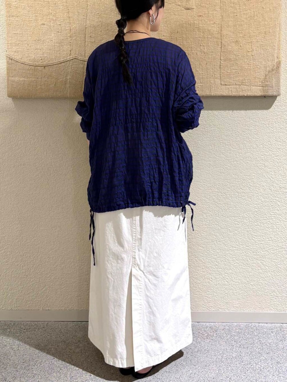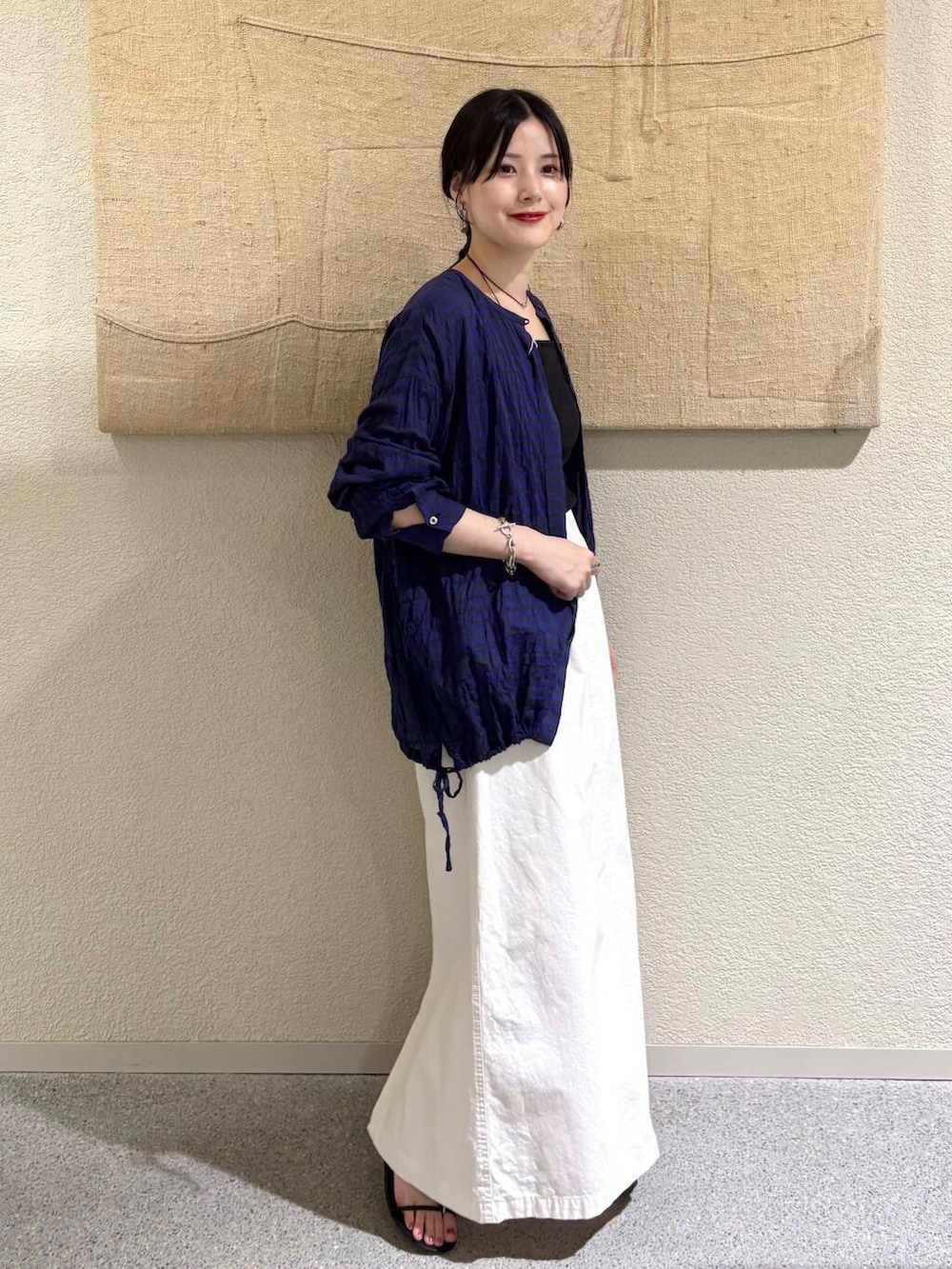 ボトムスはコットンストレートスカート〈OFF/サイズ1〉を着用。程よくハリのある生地感で、身体のラインを拾いすぎず、すっきりとしたシルエットに。爽やかなオフホワイトがロイヤルブルーと好相性で、春夏らしい軽やかさを演出します。