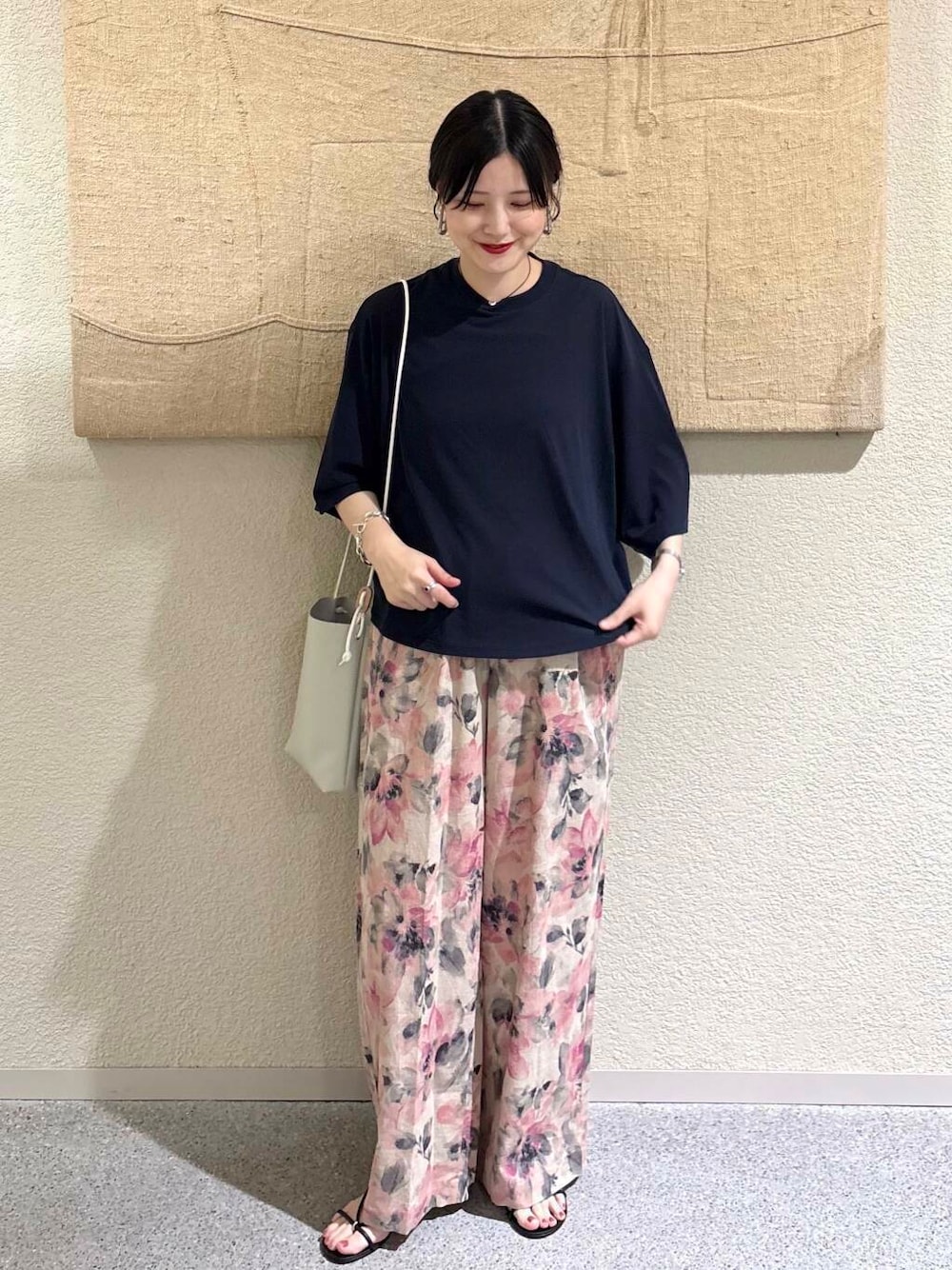1dozenのビッグスリーブTシャツ〈NAVY〉を着用。ネイビーの深みある色合いが肌に馴染み、顔まわりを上品に見せてくれます。たっぷりとした袖のボリュームが特徴で、シンプルながらも1枚で映えるデザイン。柔らかく落ち感のある素材で、体型を程よくカバーしてくれます。