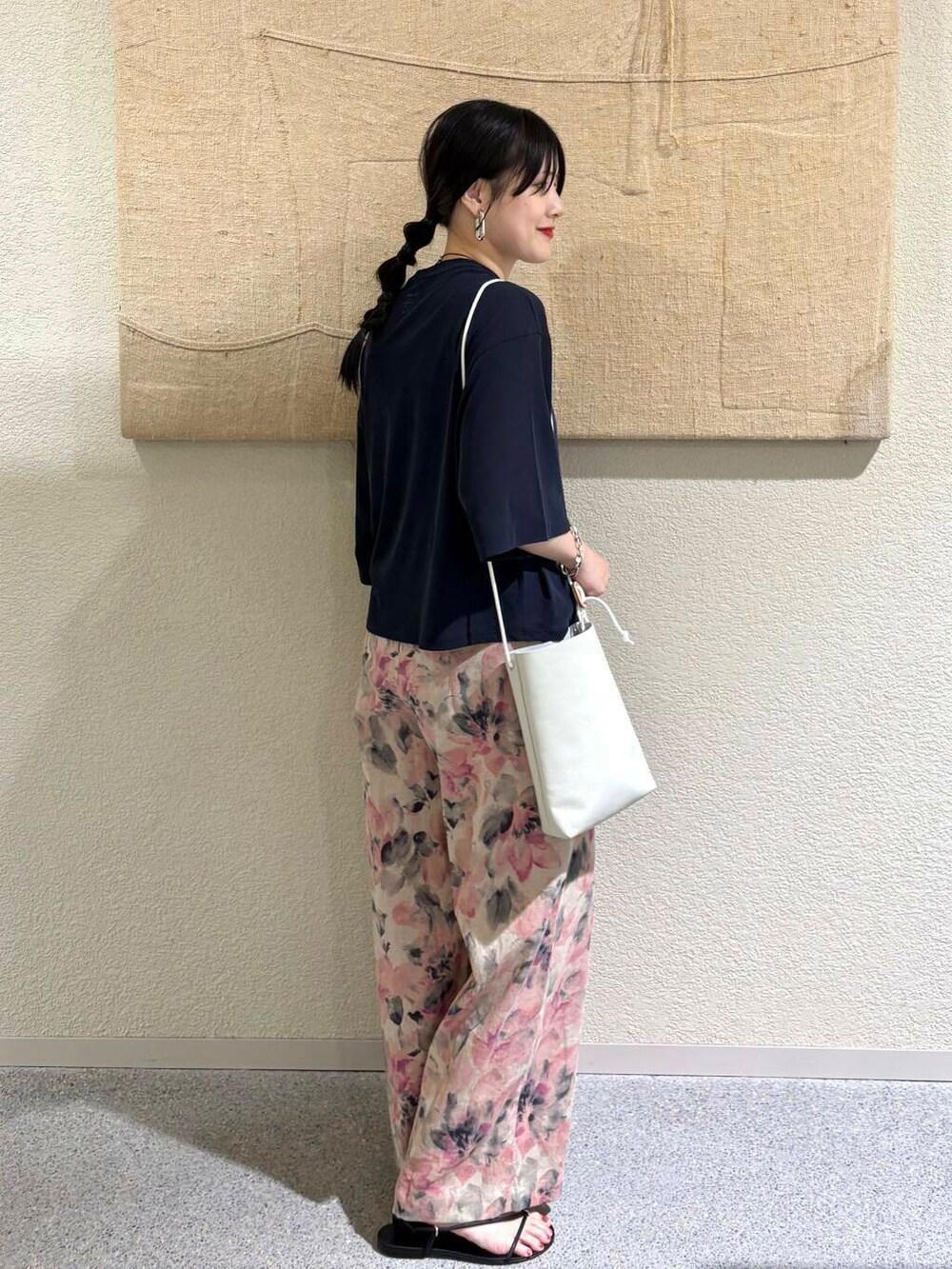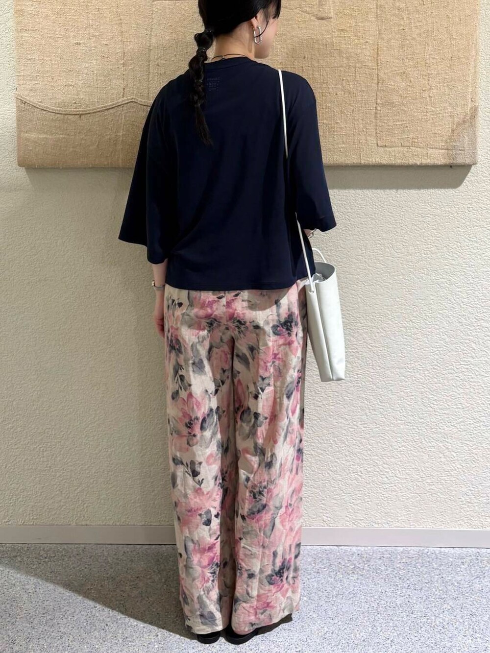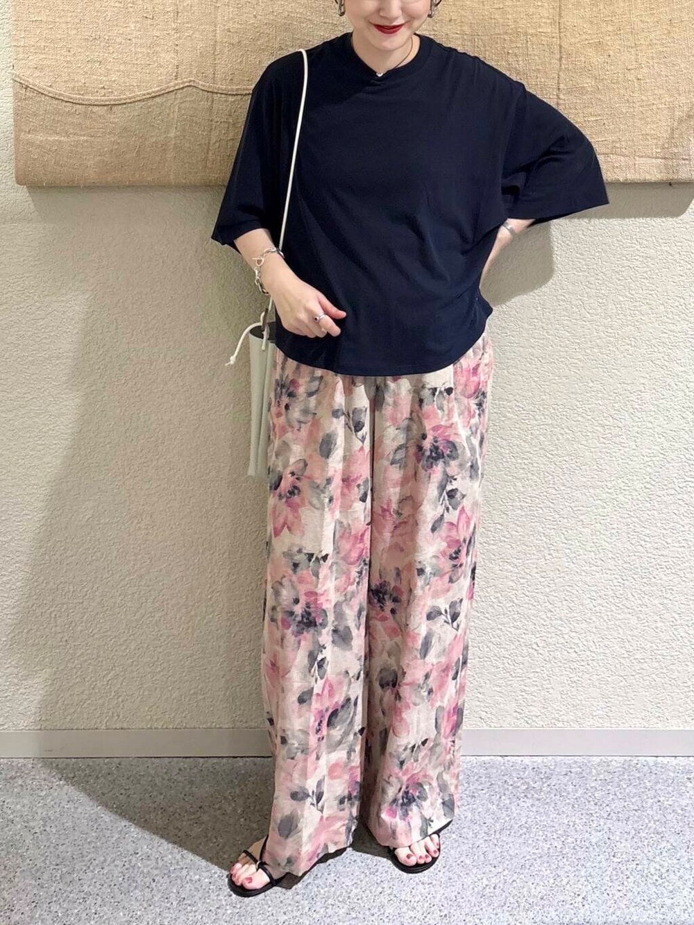 コットンリネンプリントイージーパンツ〈PINK〉を合わせて、スタイリングに軽やかさと華やかさをプラス。派手すぎない落ち着いたピンクのトーンとナチュラルなリーフ柄が、ネイビートップスと好相性。ウエストゴム仕様でラクな穿き心地ながら、ストレートなシルエットで脚のラインを拾いにくく、バランスよく着こなせます。