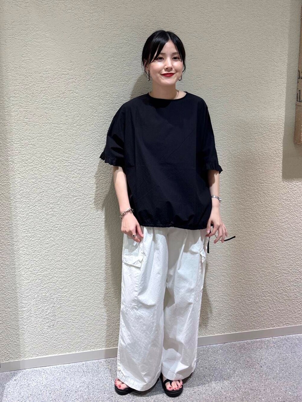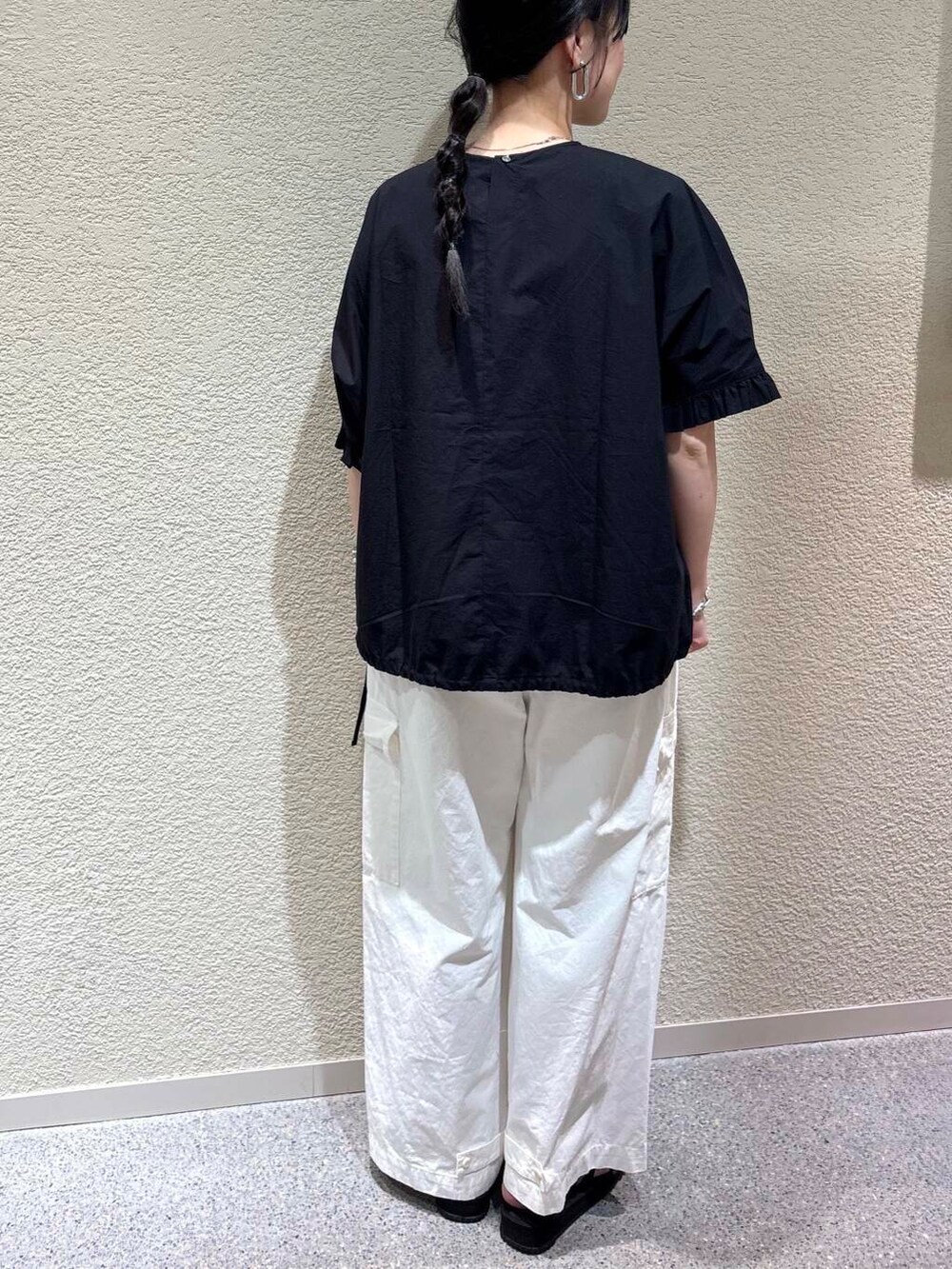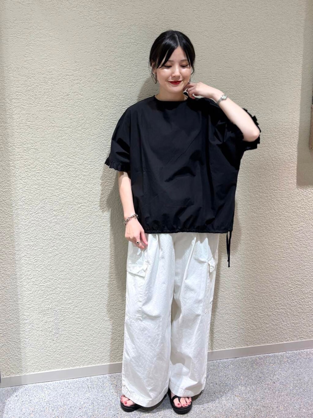 ボトムスには、ユーティリティイージーパンツ〈OFF〉を合わせて、抜け感と軽やかさをプラス。程よいワイドシルエットとハリのある素材感が、トップスの柔らかさと好バランス。ウエストはゴム仕様で、リラックスした穿き心地ながらも、立体感がありきれい見えも叶います。158cmの身長でも重たくならず、足元にかけての落ち感があることでスタイルアップ効果も◎