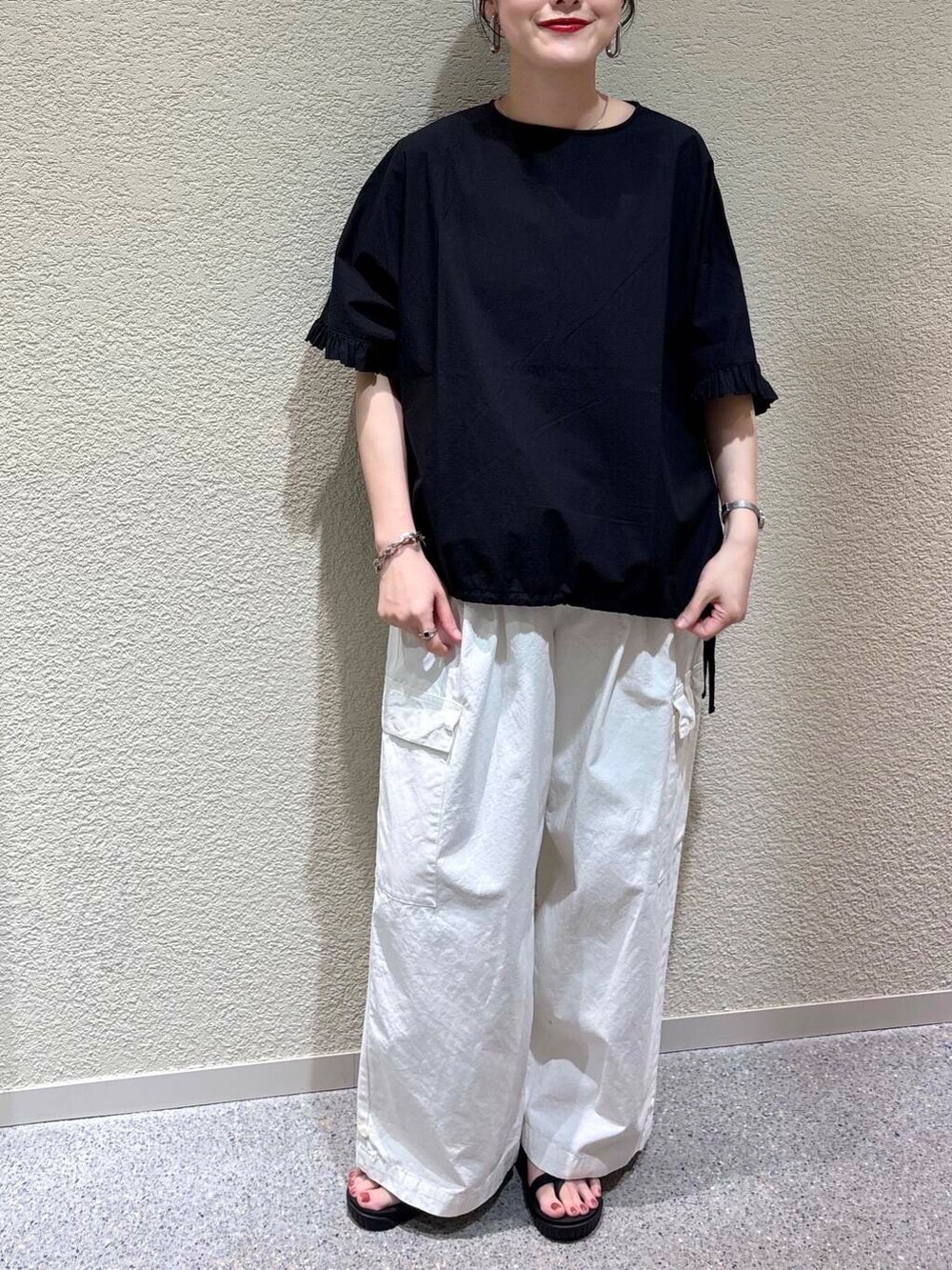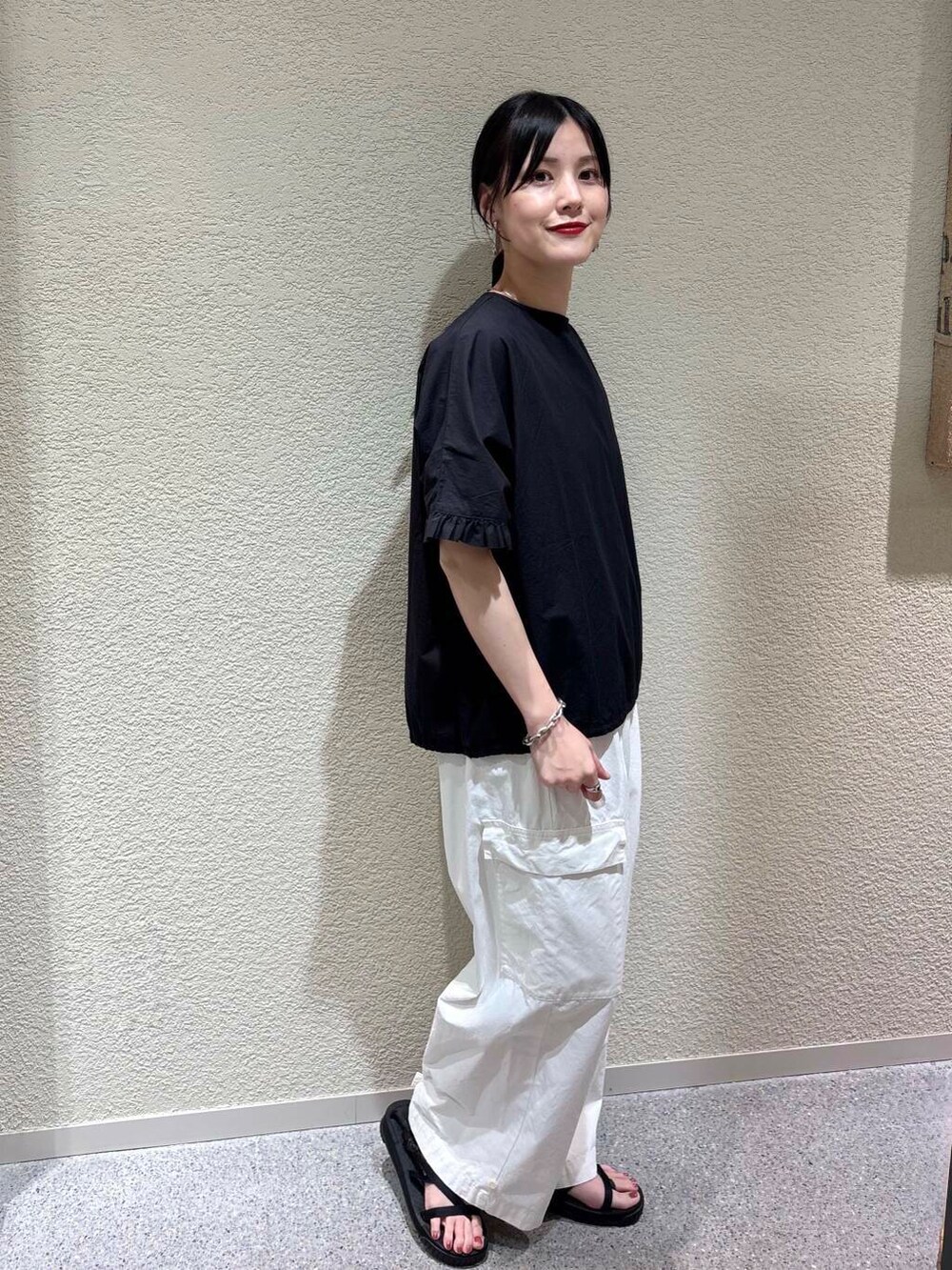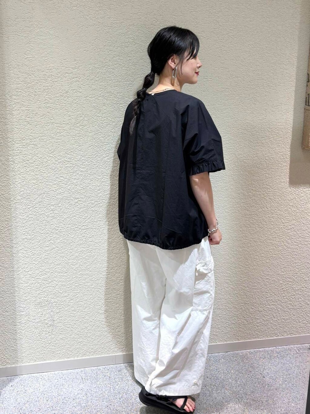 ボトムスには、ユーティリティイージーパンツ〈OFF〉を合わせて、抜け感と軽やかさをプラス。程よいワイドシルエットとハリのある素材感が、トップスの柔らかさと好バランス。ウエストはゴム仕様で、リラックスした穿き心地ながらも、立体感がありきれい見えも叶います。158cmの身長でも重たくならず、足元にかけての落ち感があることでスタイルアップ効果も◎