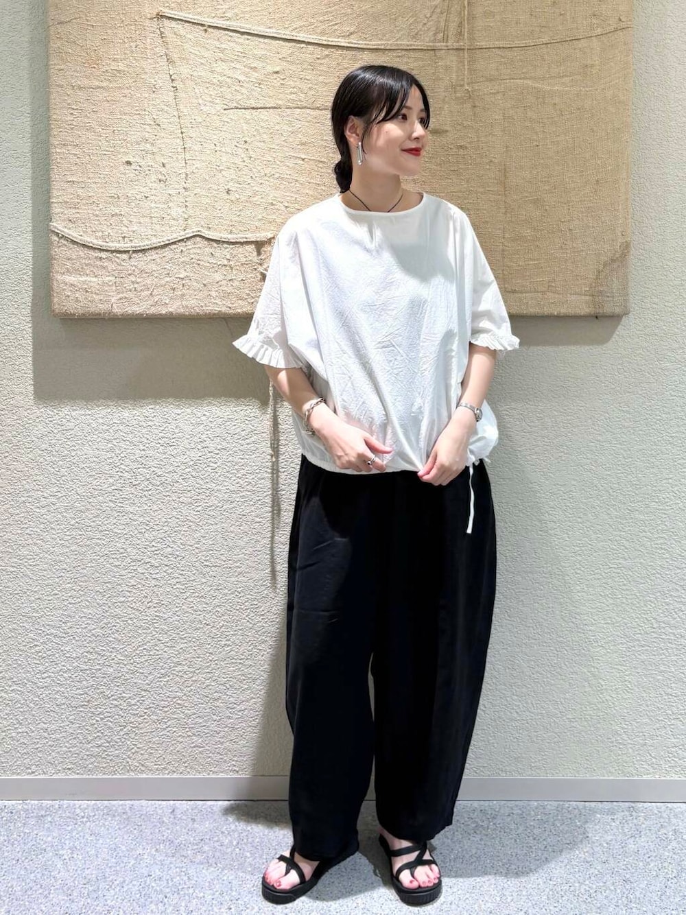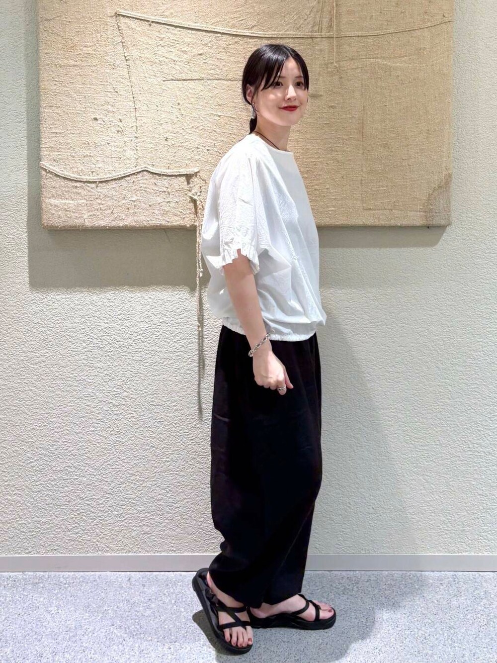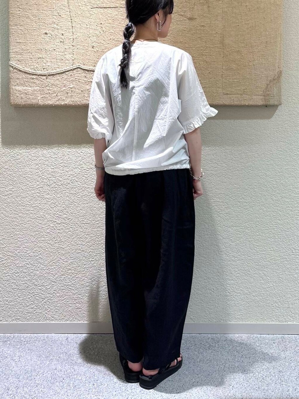 合わせたのは、リネンボリュームパンツ〈BLACK〉。ふんわりとした分量感のあるシルエットながら、リネン特有の落ち感があるため、広がりすぎず大人っぽく着こなせる一本です。ウエストは総ゴム仕様でラクな穿き心地ながら、腰まわりはすっきり。ストンと落ちるシルエットがバランスをとってくれます。158cmの身長でももたつかず、軽やかに着られる丈感です。