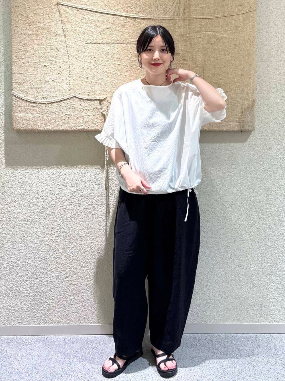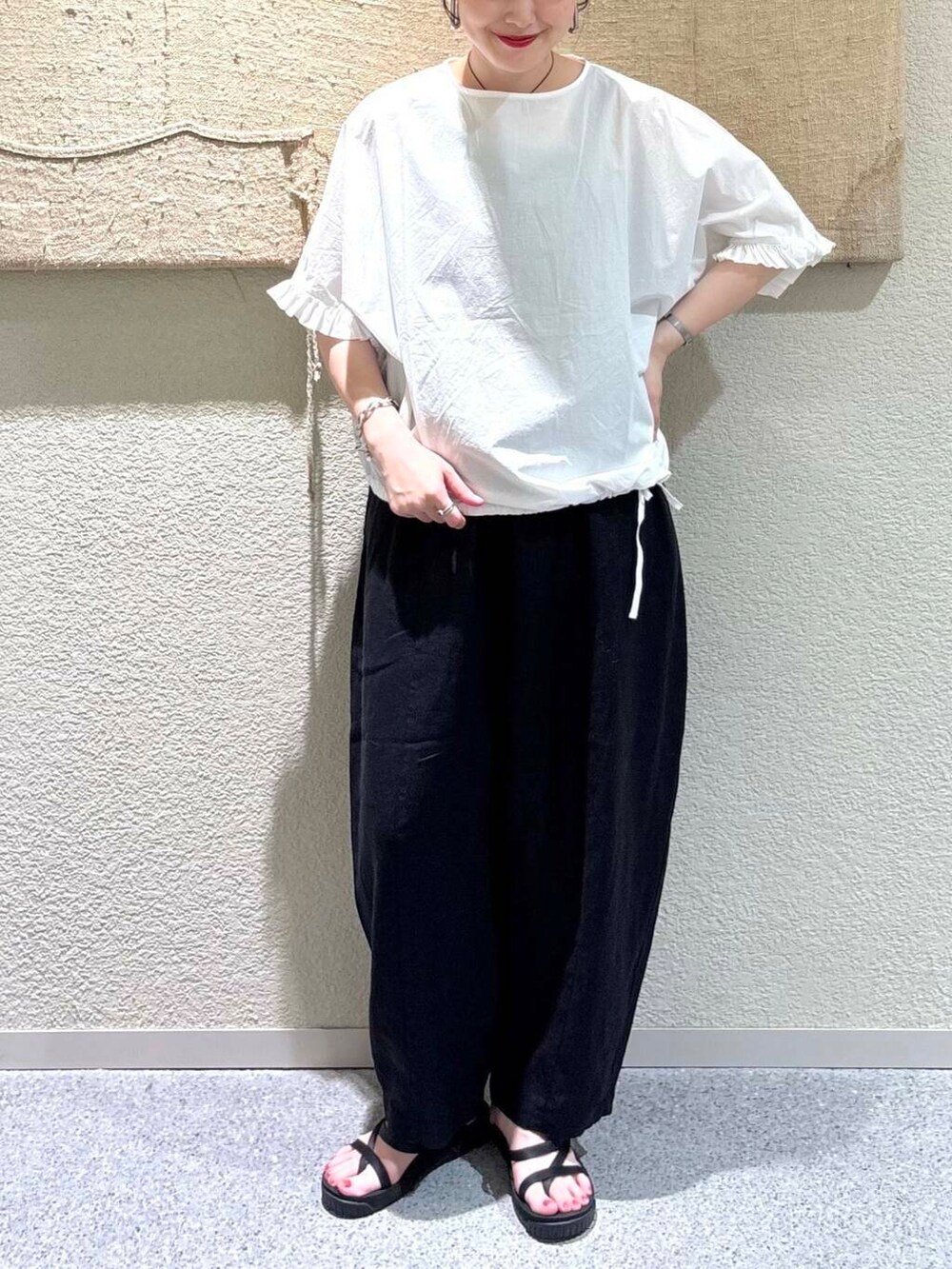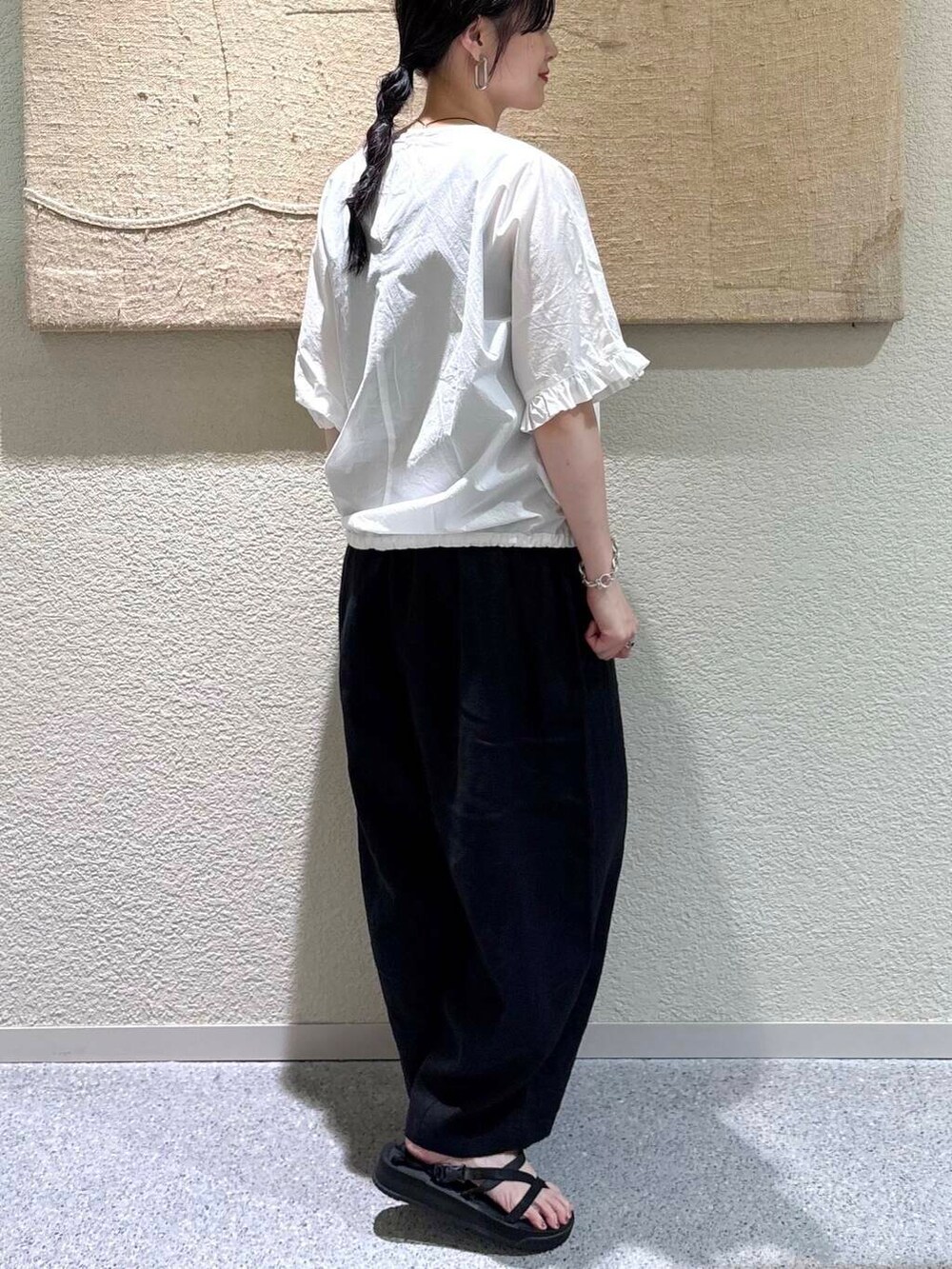 合わせたのは、リネンボリュームパンツ〈BLACK〉。ふんわりとした分量感のあるシルエットながら、リネン特有の落ち感があるため、広がりすぎず大人っぽく着こなせる一本です。ウエストは総ゴム仕様でラクな穿き心地ながら、腰まわりはすっきり。ストンと落ちるシルエットがバランスをとってくれます。158cmの身長でももたつかず、軽やかに着られる丈感です。